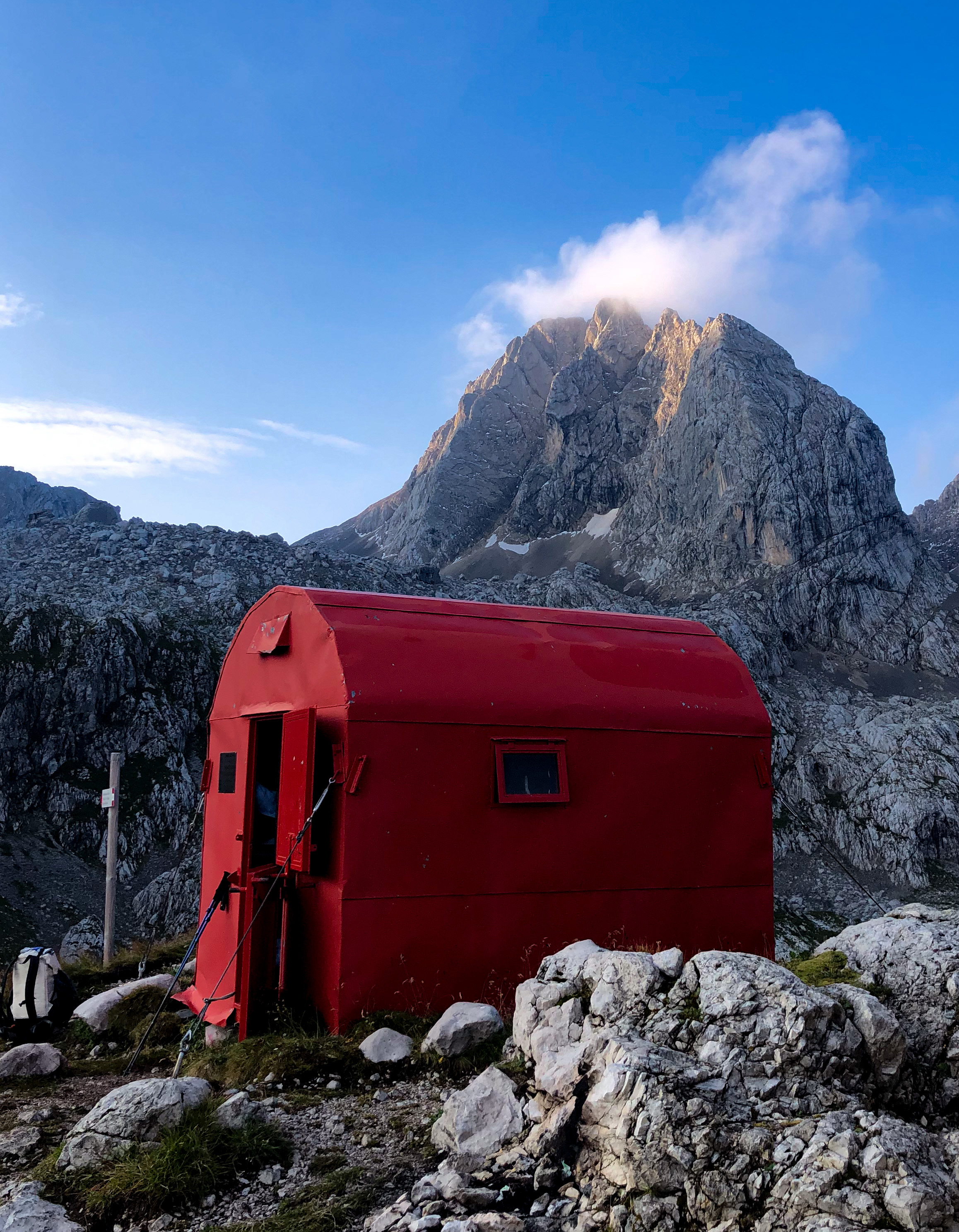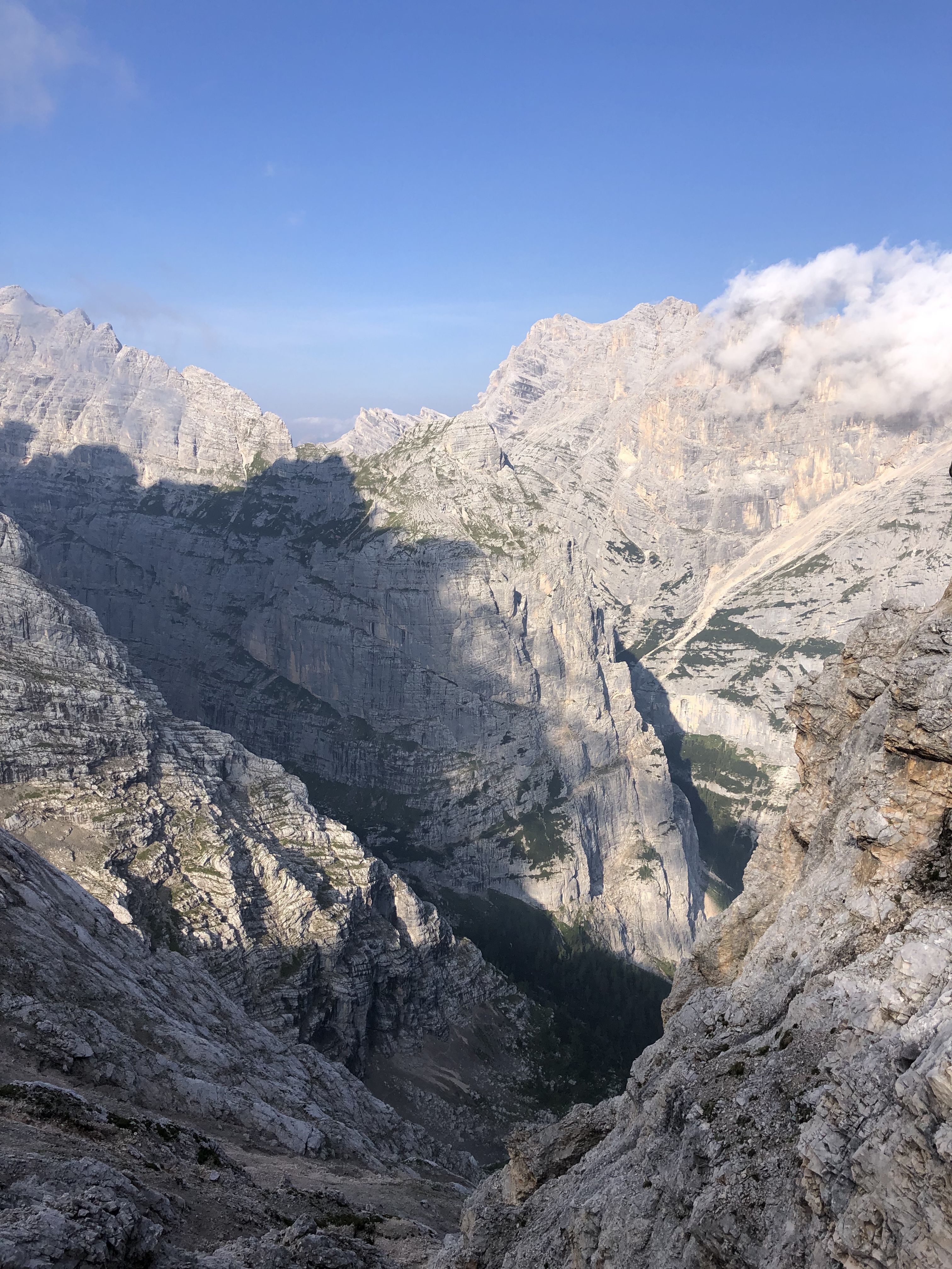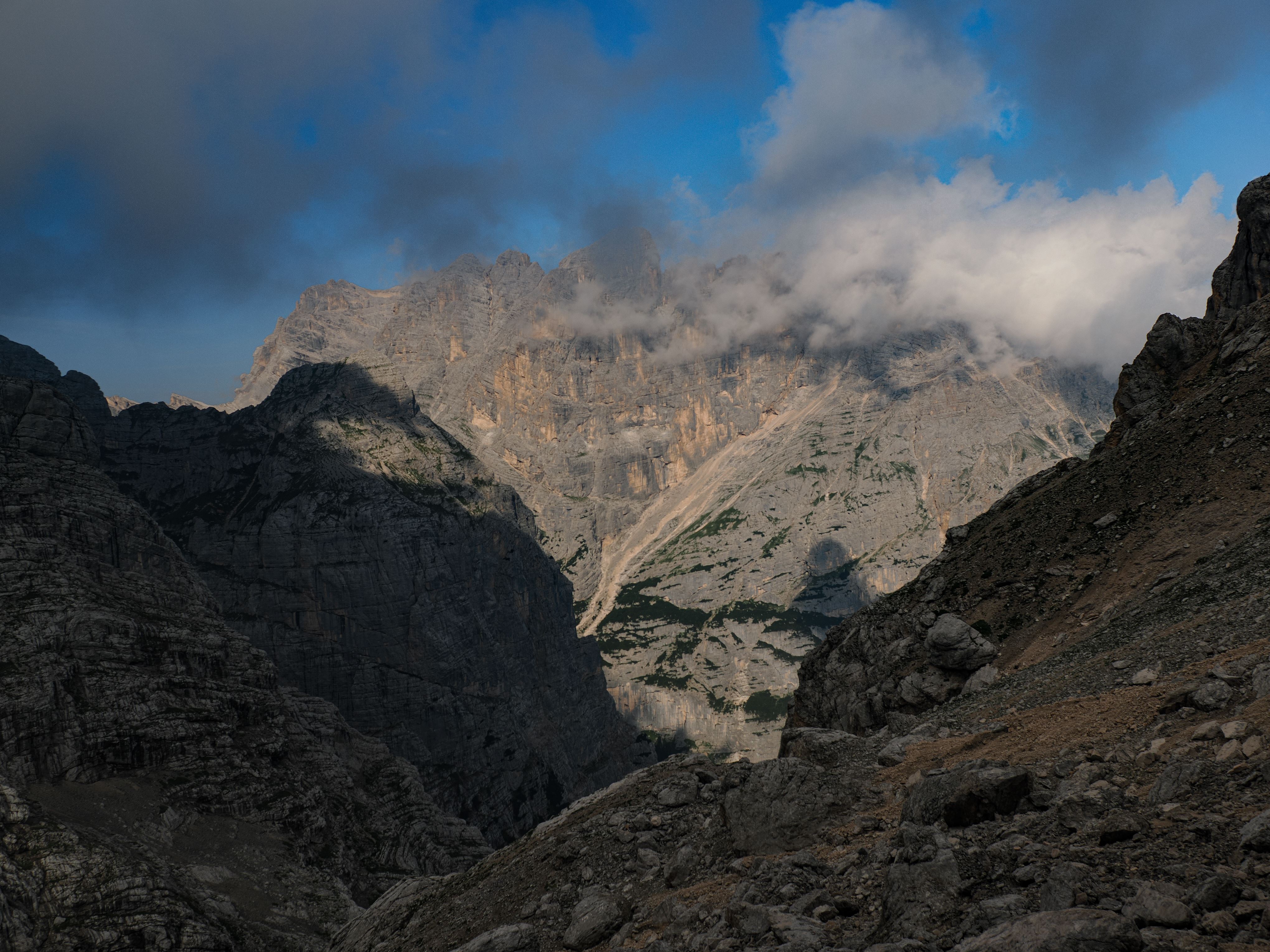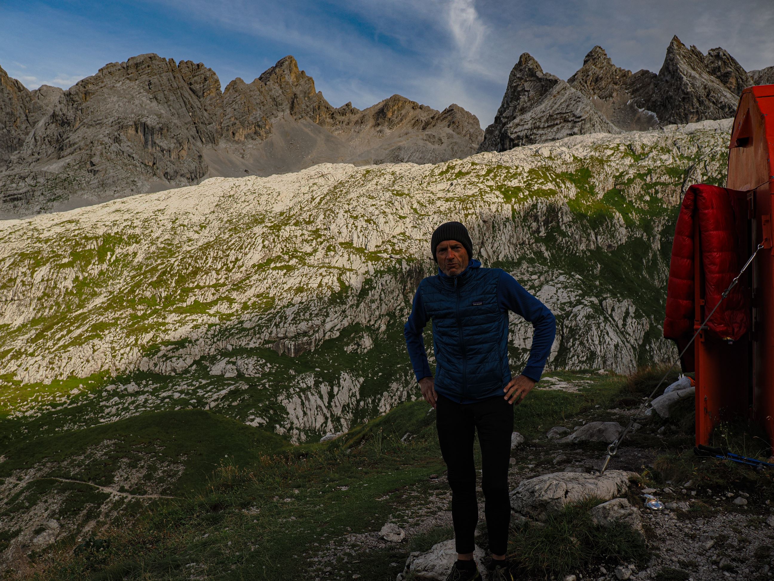 Along the crest of this airy spine, the views opened again and the path became a delightful scramble along the narrow ridge, climbing to 2,600 meters before descending a long switchback and across a face where Claudio found a seep while a chamois watched intently as he collected water. We descended the only small patch of snow we would encounter, hidden deep in the north-facing recess of this huge bowl. The path now wandered through a maze of gigantic boulders and headwalls, then back onto the grassy slopes with the bivacco now in sight. The Bivacco Musatti was a near clone of the Bivacco Tiziano and already had an occupant who, unable to afford lodging in the valley some 1,000 meters below, had hiked up to spend the night. He was a self-described tourist and it seemed, perfectly happy to descend, take in the sights, and return to Musatti at the end of his day. He was on a shoestring budget and this kept it alive and well. We claimed our bunks just as two others arrived, and shortly thereafter, two more, and then two more - the last a desperately romantic young couple. It looked like the bivacco would be packed, but after some discussion, two departed and we were down to 7. This was cramped but tolerable - or so we thought. At lights-out we discovered that the lovers would not be denied, and that one of the other pair was a world-class snorer. His companion, rather than disturbing the bliss of his larger and decidedly moodier buddy, chose instead to entertain himself with videos on his phone - a double-whammy. Then, someone added flatulence, creating the perfect trifecta of sensory abuse. I whimpered quietly, my head buried in my bag. It seemed nothing, including procreation, was taboo in this tiny space. I offered Claudio earplugs but he declined and seemed to fall asleep - how, I did not know...