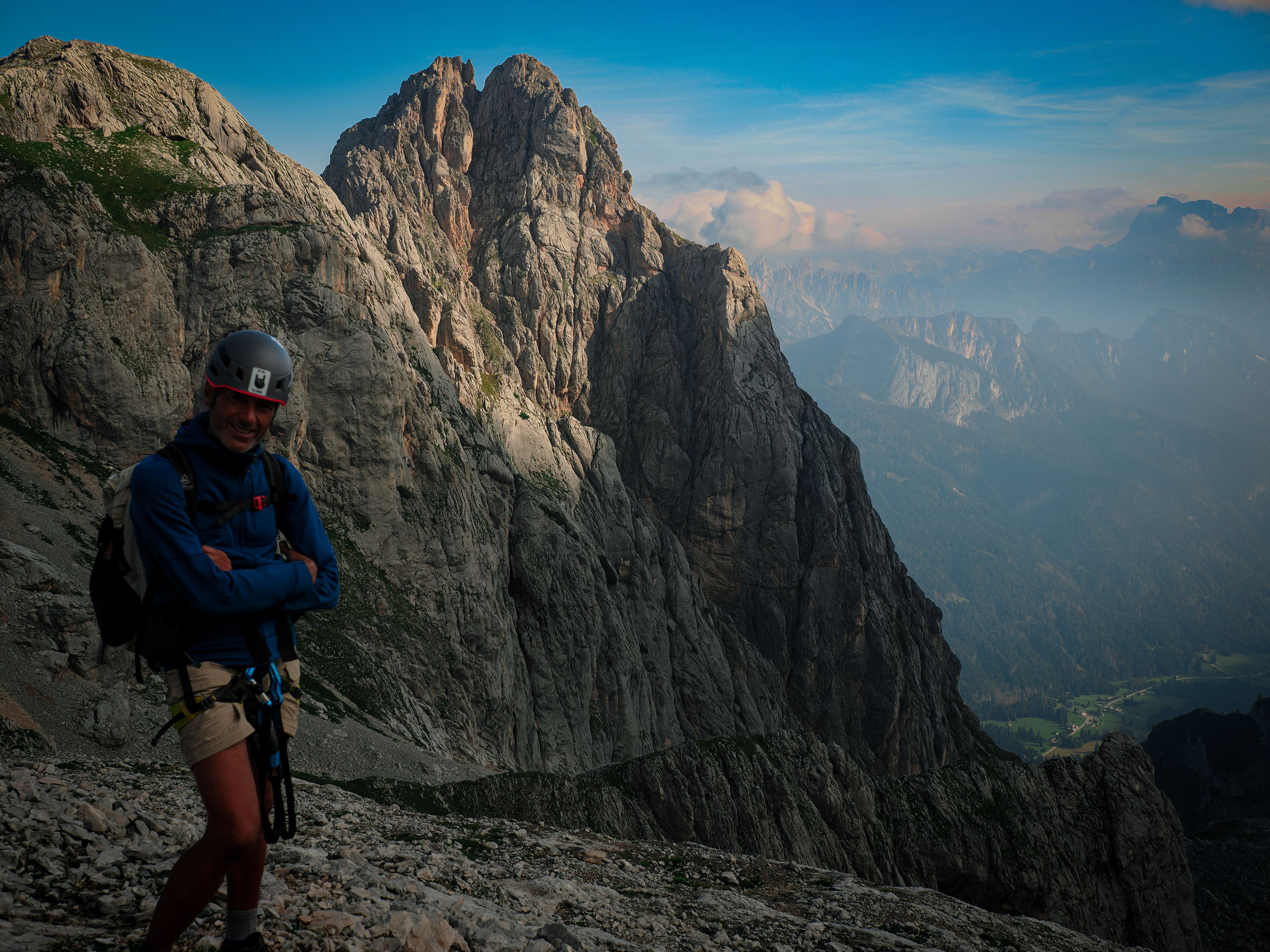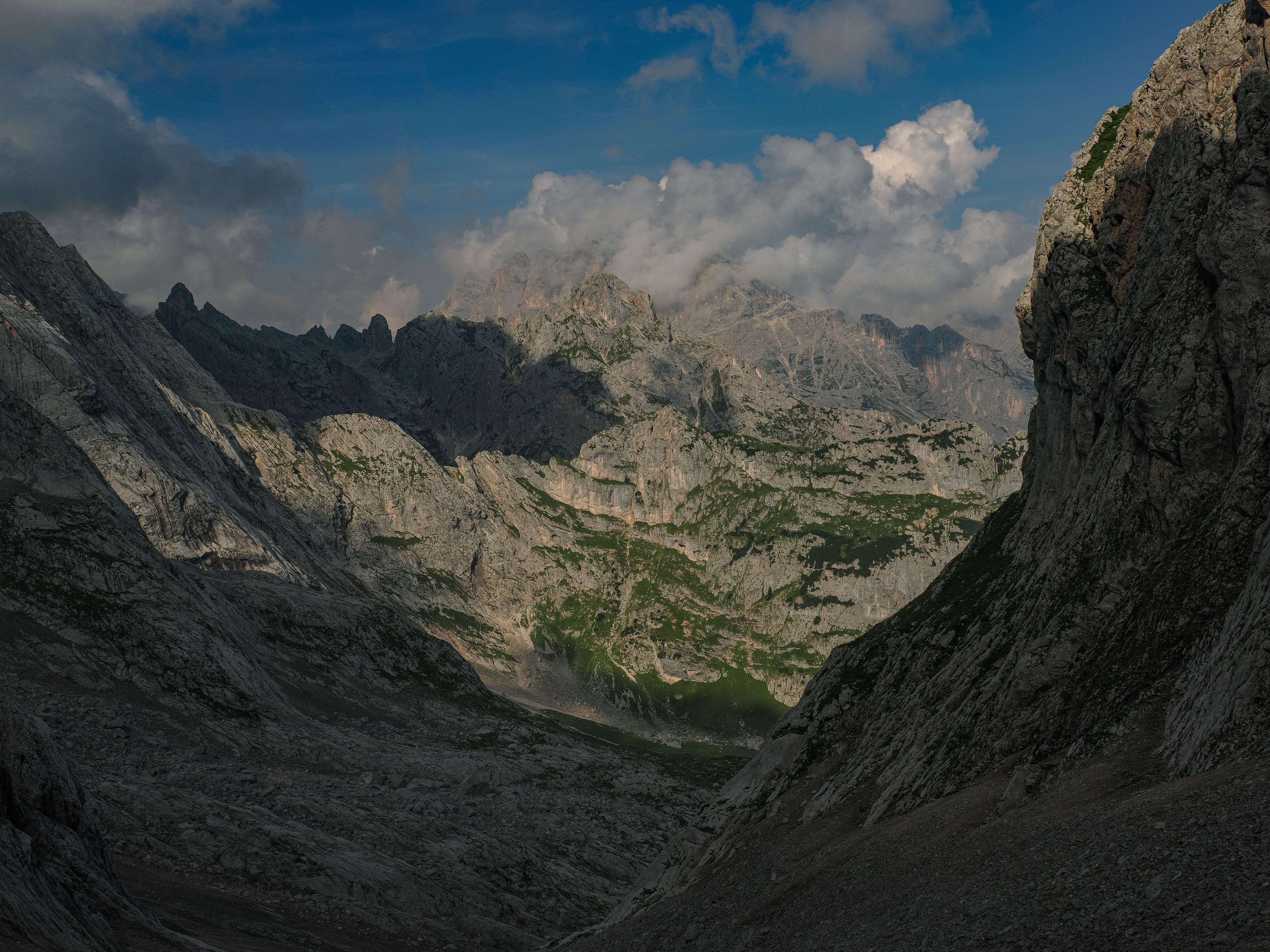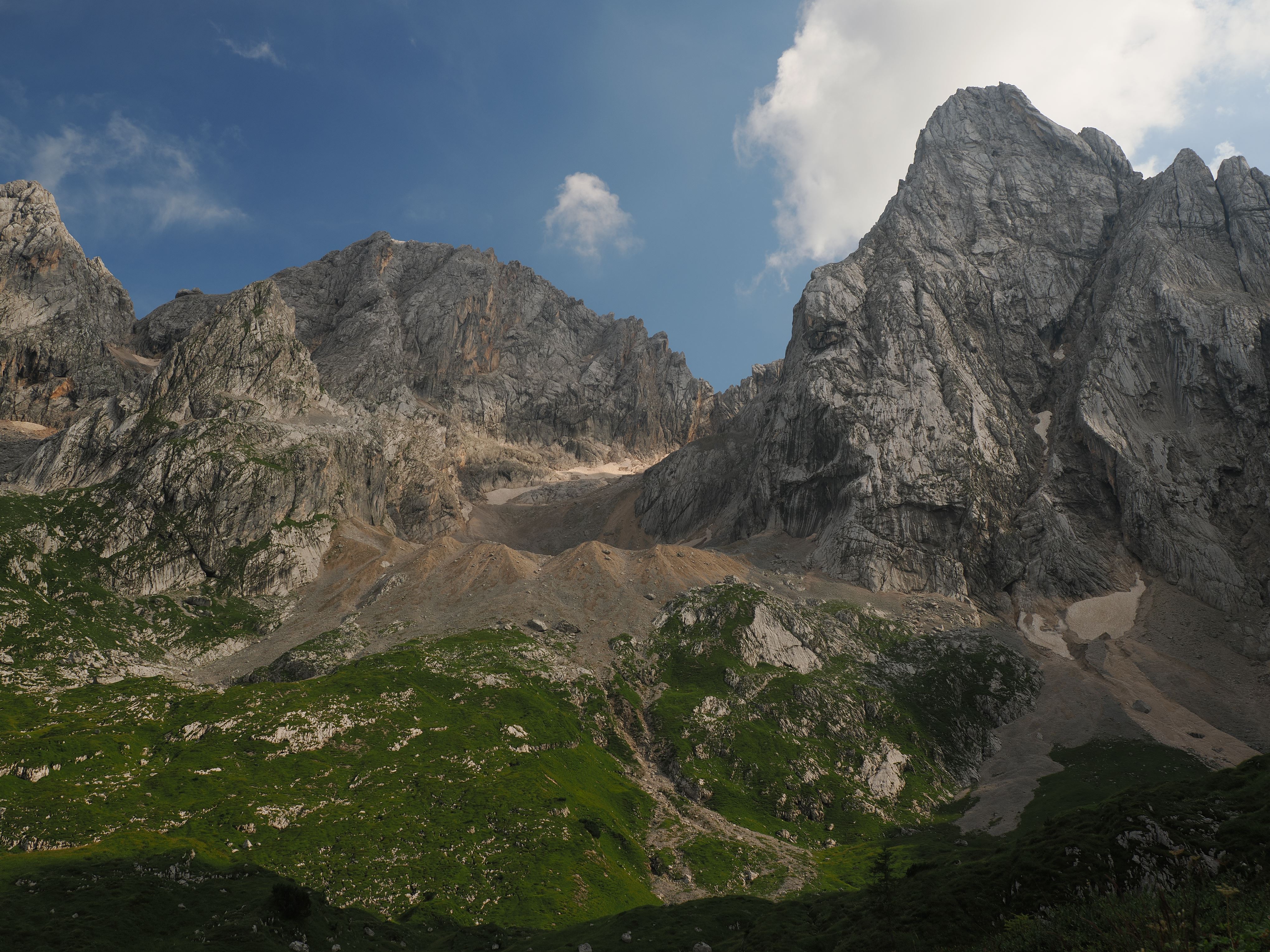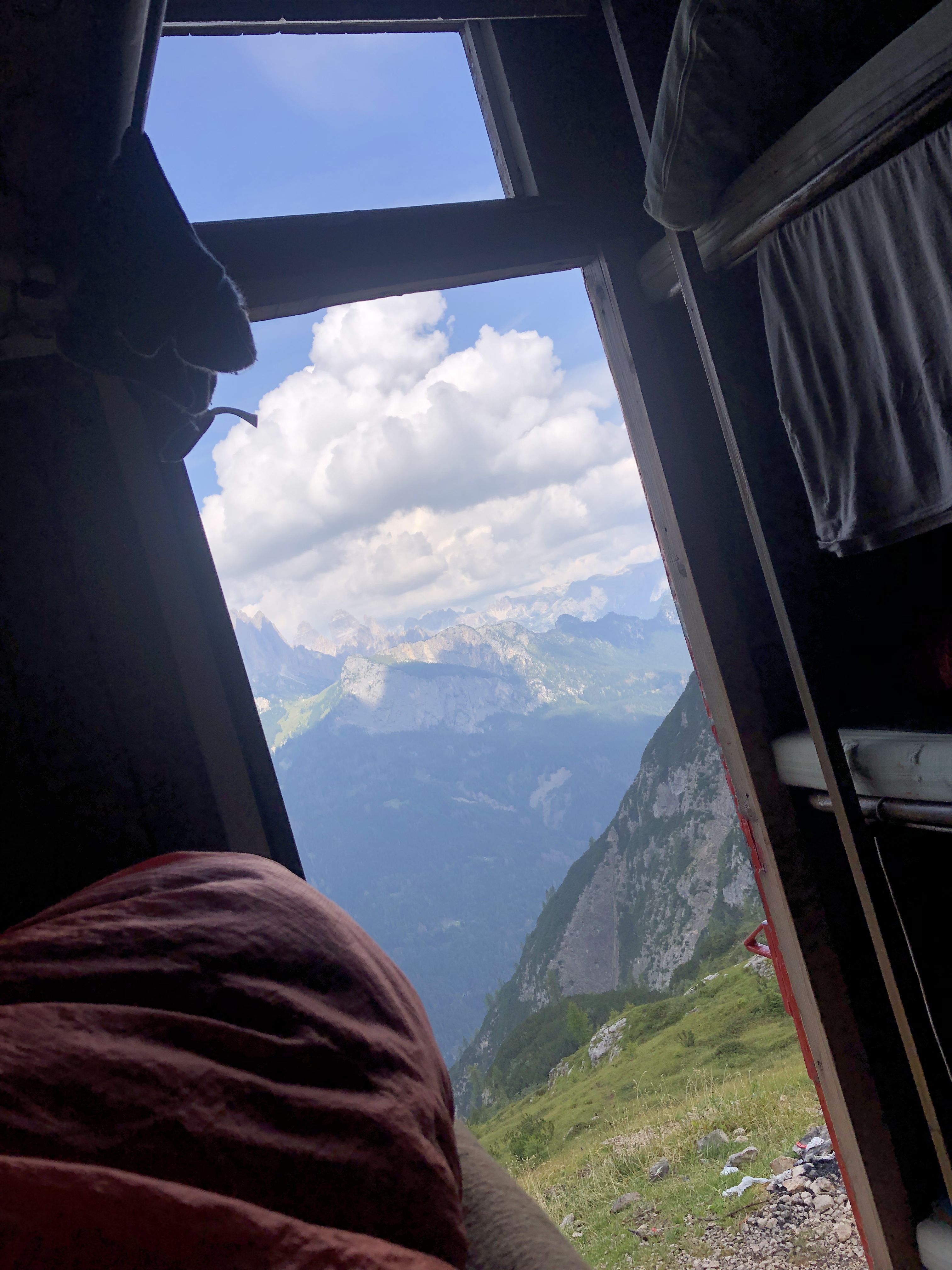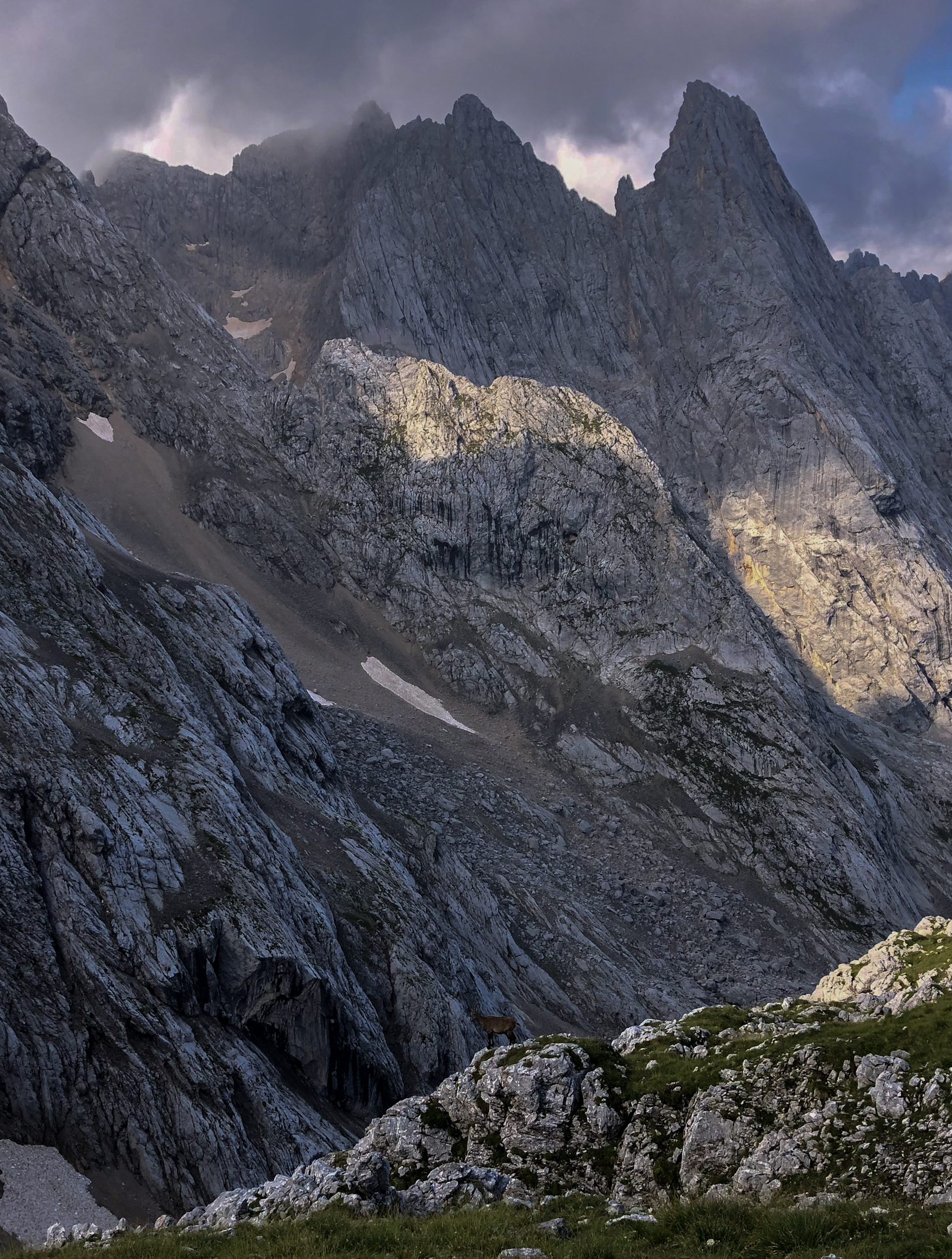 Along the crest of this airy spine, the views opened again and the path became a delightful scramble along the narrow ridge, climbing to 2,600 meters before descending a long switchback and across a face where Claudio found a seep while a chamois watched intently as he collected water. We descended the only small patch of snow we would encounter, hidden deep in the north-facing recess of this huge bowl. The path now wandered through a maze of gigantic boulders and headwalls, then back onto the grassy slopes with the bivacco now in sight. The Bivacco Musatti was a near clone of the Bivacco Tiziano and already had an occupant who, unable to afford lodging in the valley some 1,000 meters below, had hiked up to spend the night. He was a self-described tourist and it seemed, perfectly happy to descend, take in the sights, and return to Musatti at the end of his day. He was on a shoestring budget and this kept it alive and well. We claimed our bunks just as two others arrived, and shortly thereafter, two more, and then two more - the last a desperately romantic young couple. It looked like the bivacco would be packed, but after some discussion, two departed and we were down to 7. This was cramped but tolerable - or so we thought. At lights-out we discovered that the lovers would not be denied, and that one of the other pair was a world-class snorer. His companion, rather than disturbing the bliss of his larger and decidedly moodier buddy, chose instead to entertain himself with videos on his phone - a double-whammy. Then, someone added flatulence, creating the perfect trifecta of sensory abuse. I whimpered quietly, my head buried in my bag. It seemed nothing, including procreation, was taboo in this tiny space. I offered Claudio earplugs but he declined and seemed to fall asleep - how, I did not know...