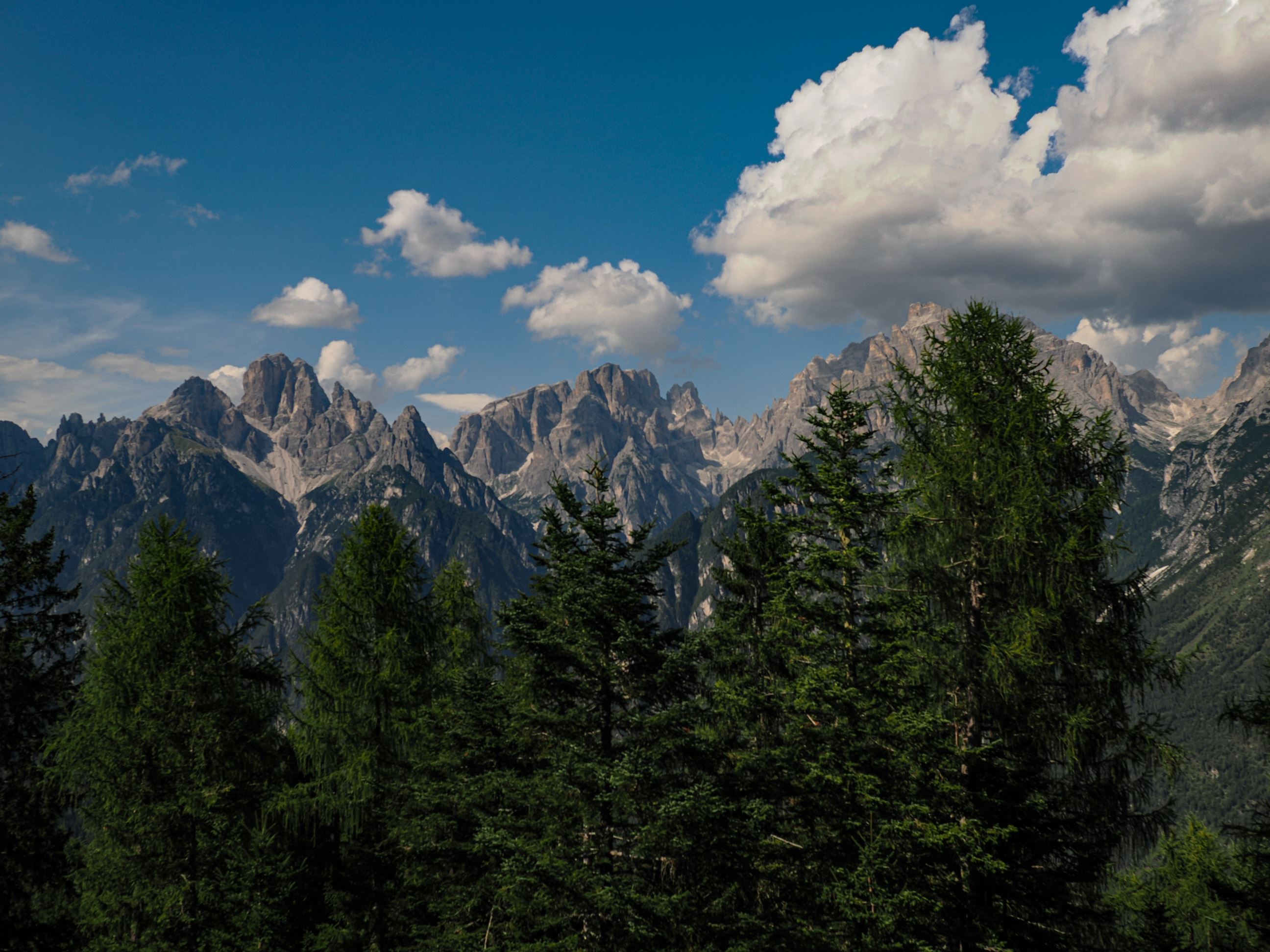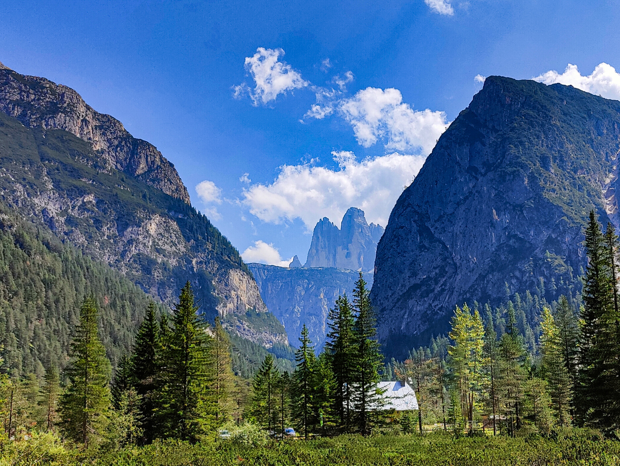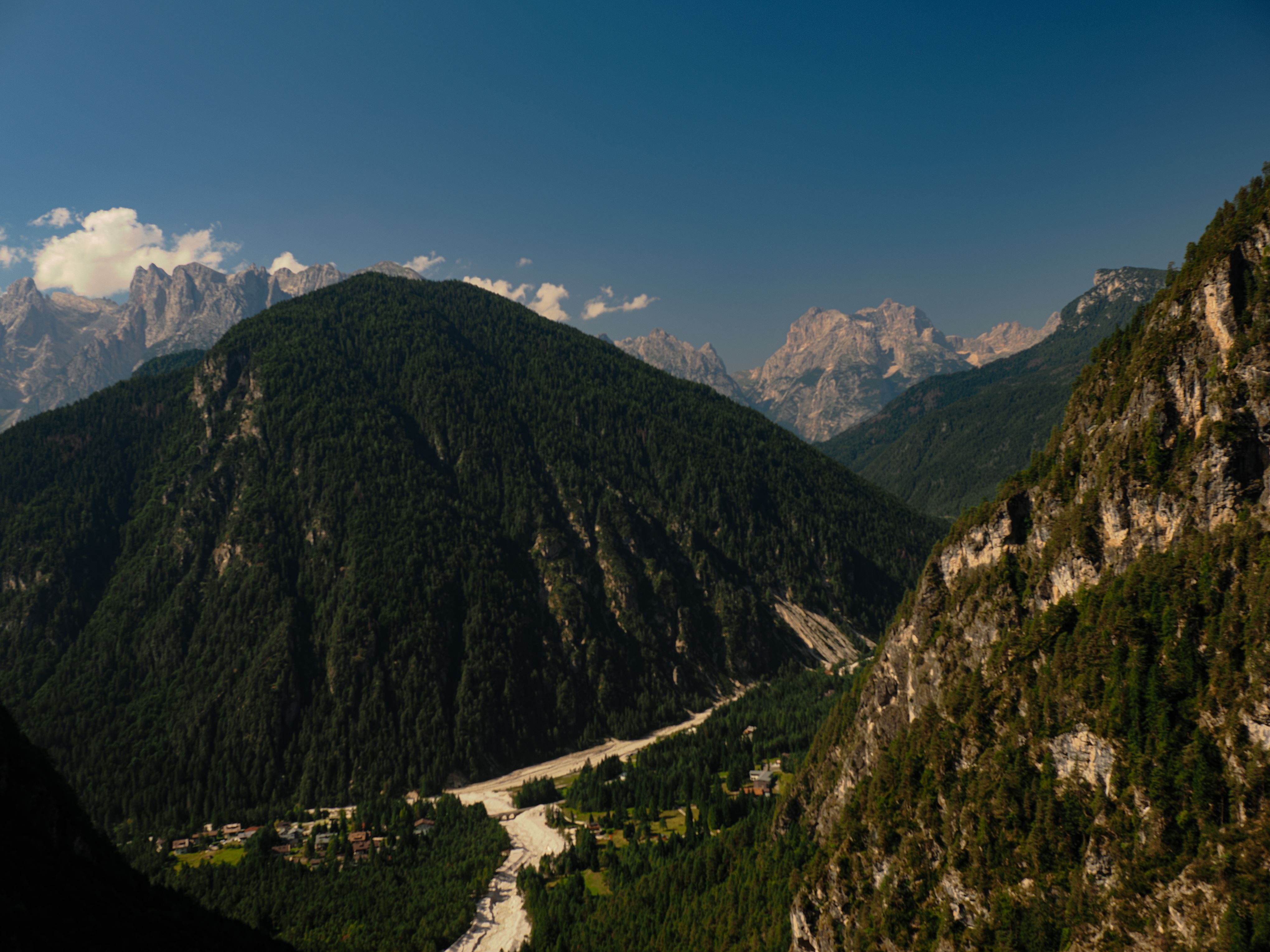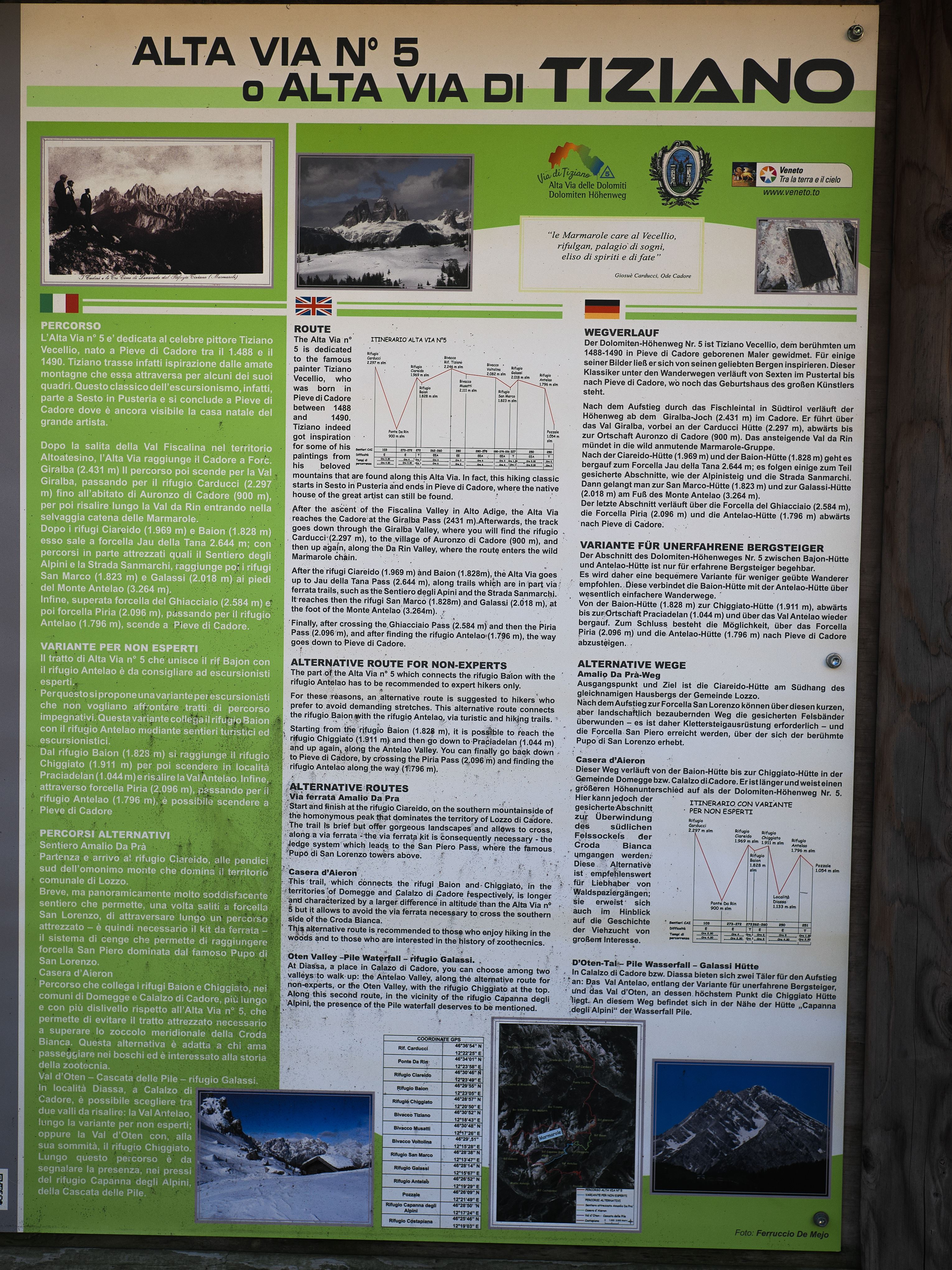I 'll meet you at 8:30 Claudio emailed, "Where are you?" I had two addresses for the hotel where I'd been staying in Vittorio Veneto since completing the Alta Via 6 a few days earlier; one on the business card and one the gate. Taking no chances, I gave him both. This little part -actually Serravalle - of the bigger city, was on the Venetian Plain , tucked up against the very southern end of the mountains - a scant 100 meters above sea-level and very hot. Nearly everything closed during the heat of midday, but the brave, or unwary could still be found wandering the streets, looking for ice cream. I was almost certain that Italians possessed a gene for heat tolerance that Scandinavians lacked. My friend arrived at precisely 8:30 the next morning just as I was checking out. I had become quite attached to my temporary home and was encouraged by my hosts to return during the fall months when it was cool and quiet. Claudio and I would follow SS51 up the valleys of the Piave and Boite rivers to Dobbiaco, then east up Val Pusteria to the start of the Alta Via 5. It was a Sunday and this main artery into the mountains was busy. Claudio is a superb mountain companion - young, strong and competent - and also a great tour guide. I peppered him with questions along the route. Fueled by cappucinos and chased with rock-and-roll, the kilometers rolled by and we were soon at the village of Moso and the beginning of the walk. As we started up the path we thought about our missing companion, Claudio's daughter Anna who, with her now-retired father, had just burned through her vacation on the GR10 . They had completed nearly 1,000 kilometers from sea to sea along the northern flank of the Pyrenees in less than a month earning her the nickname "La Fusée" . Were it not for her work, we would be chasing her now... We would have to make do with each other. See the Alta Via 4 for more about "The Rocket".