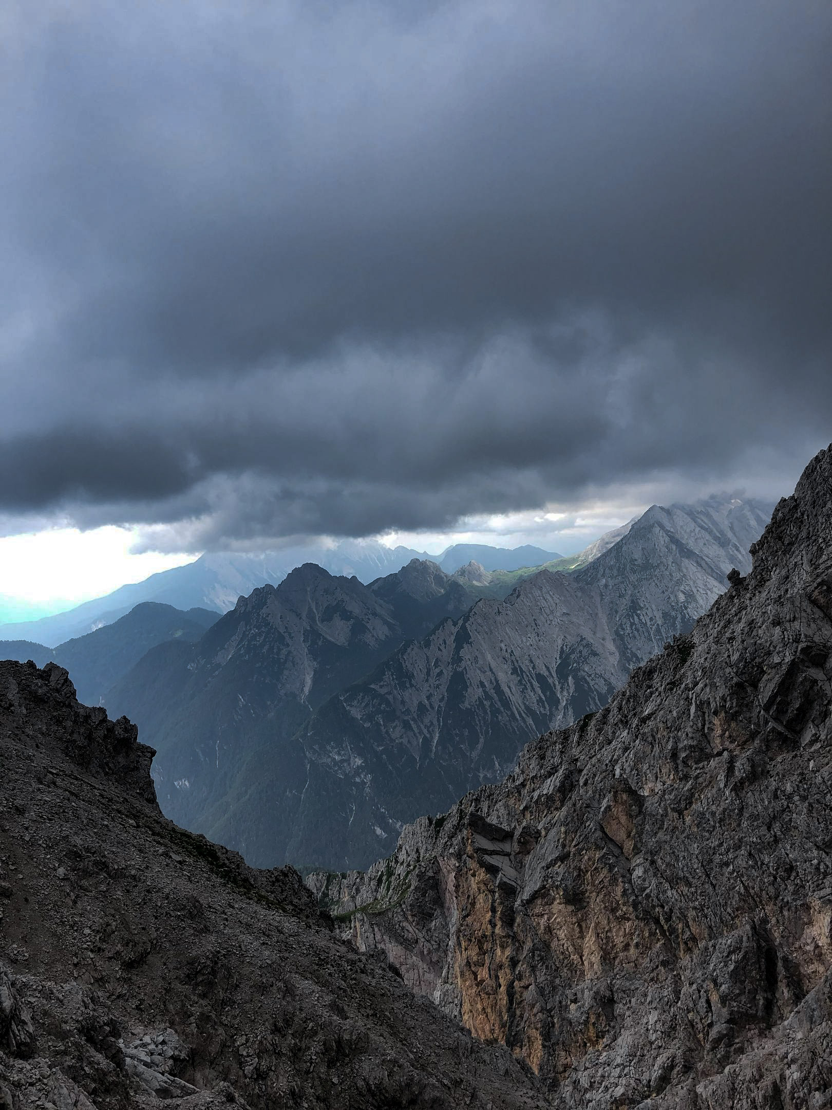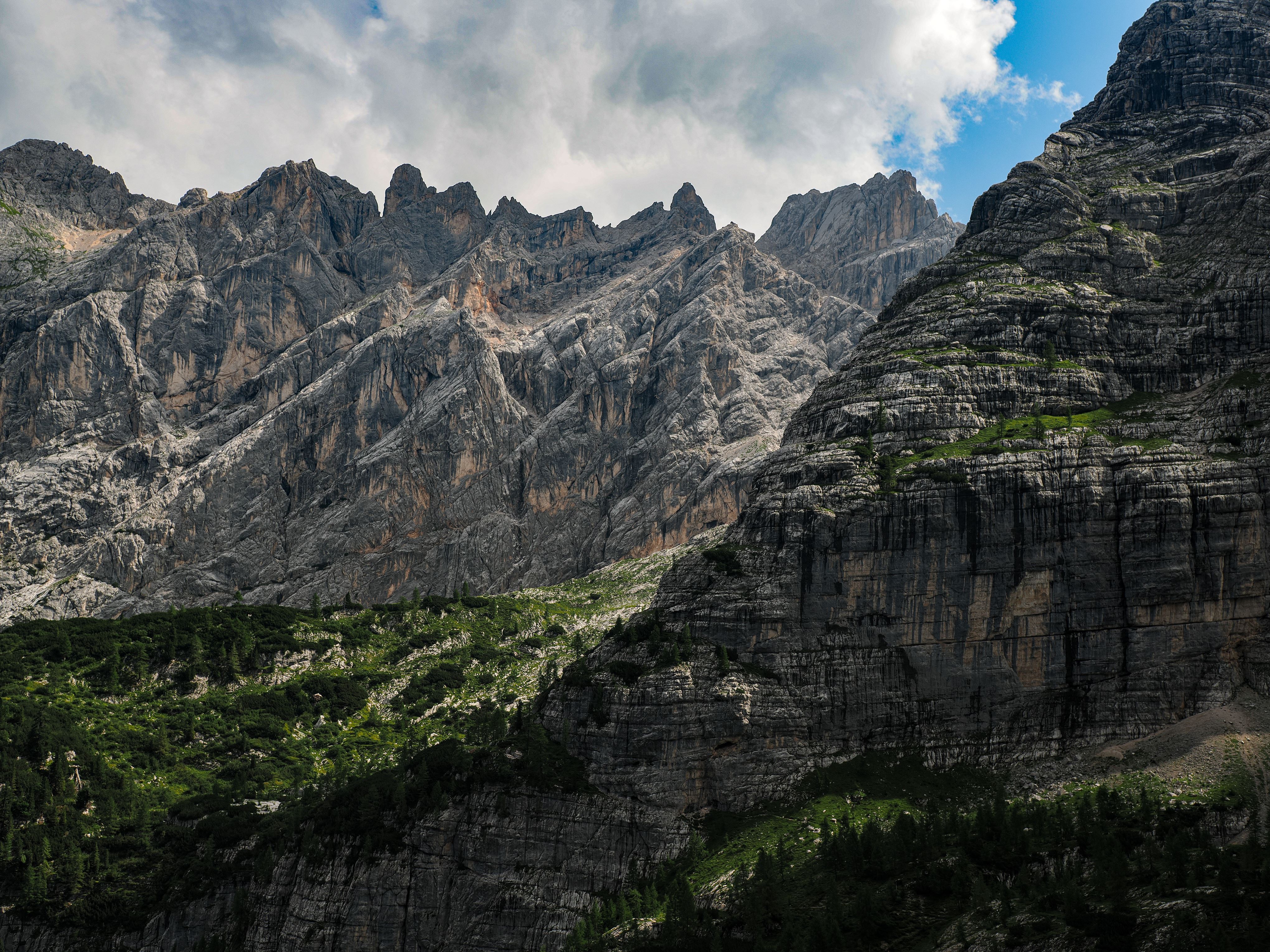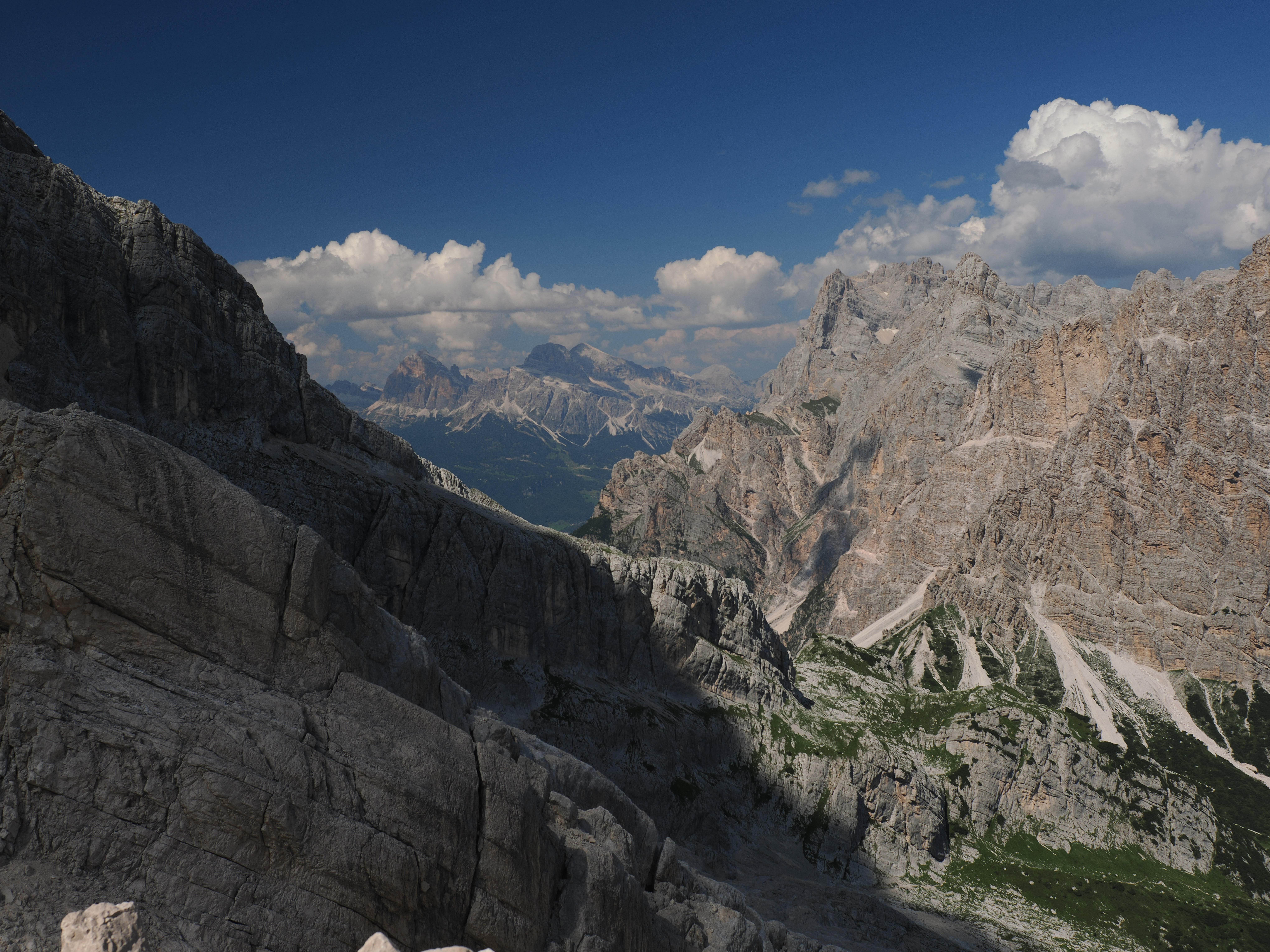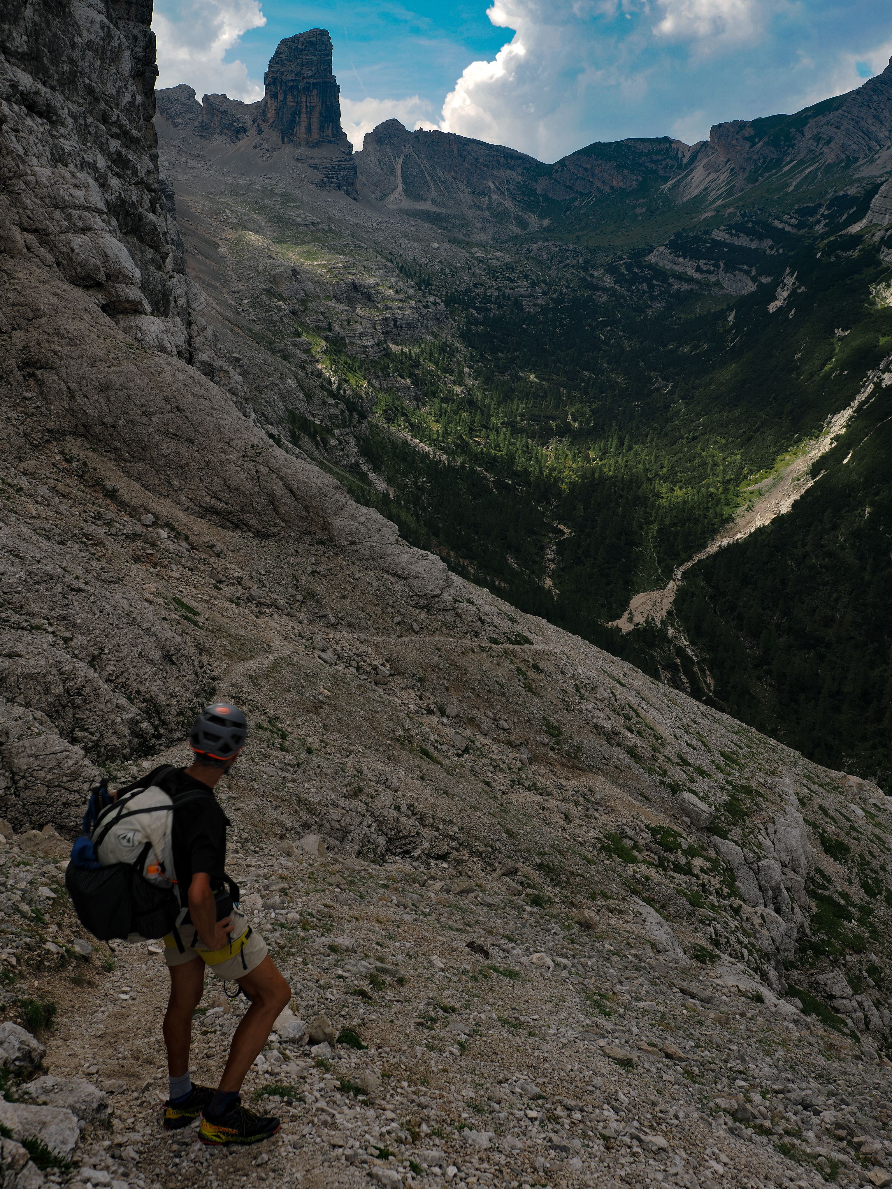 After an hour of deceptively pleasant walking , we began our ascent in earnest, climbing a mixture of ever-steepening scree gullies, buttresses and grassy slopes. Eventually, we reached the first cable in a broad, steep, dirt-filled slot. I cursed and grunted to the finish, then turned to watch the more elegant efforts of my younger friend. Ahead the path was reduced to small depressions leading across a 40° slope of turf, its convex nature only sharpening the airiness. Choking my uphill pole midway and placing the front half of each boot in its respective pocket, I tippy-toed across the first of the many shits and giggles this path would provide. As the final one of six Alta Vias, I found the minimal presence of 'equipped passages' appropriate for the extraordinary character and wildness of Marmarole and the tiny footholds confirmation of its seldom-visited nature. There are easier ways to do the Alta Via 5 and still be able to say you did it. This passage however was the real deal. We crossed a large bowl and made our way up more cables and ladders, reaching Forcella Giau de la Tana, our high point of 2,650 meters. The storm clouds, which had been threatening for the past hour, broke over us. We had just enough time to get our bearings and begin the descent of the 300 meters of scree slope below before the view disappeared.