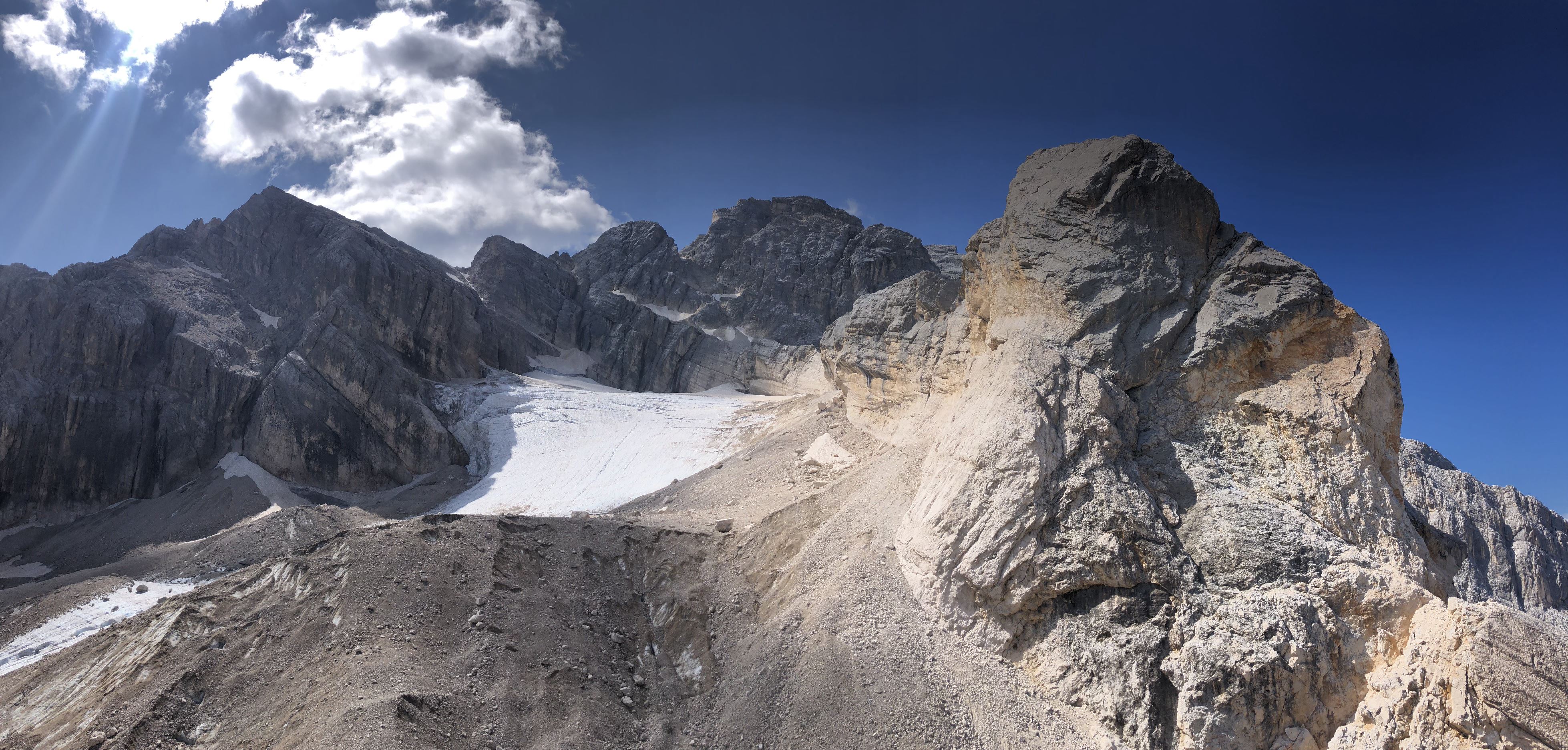 Both the Alta Via 4 and 5 share the path from Forcella Grande to Rifugio Antelao and on to the common finish in Pieve di Cadore. The three of us had followed this path on the Alta Via 4 the year before. The Alta Via 3 also visits Rifugio san Marco on its way westward, so this was my third visit, and it is a favorite. However, our day's destination, Rifugio Antelao, has first place in my heart. It looked like today would be a nice day to go there as we headed to Forcella Piccolo and down to Rifugio Galassi, where the route turned upward to the west and the Ferrata Ghiacciaio. At Galassi Claudio was told that a group of 75 young people and their instructors were also headed up the route and had left about an hour earlier. Since we would be following them up the cables, we took our time with the 400 meter ascent to its start. When we arrived, only 20 of the group were on the cable, and the remainder were queued-up below. With constant shouts of Roccia! from above, we dropped our packs, turned on the music, and kicked back. Four of the Italian military chaperones were nearby and told us that they were training this group of students who were not soldiers and thanked us for our patience and good humor. It reminded me of a NOLS outing in the States.