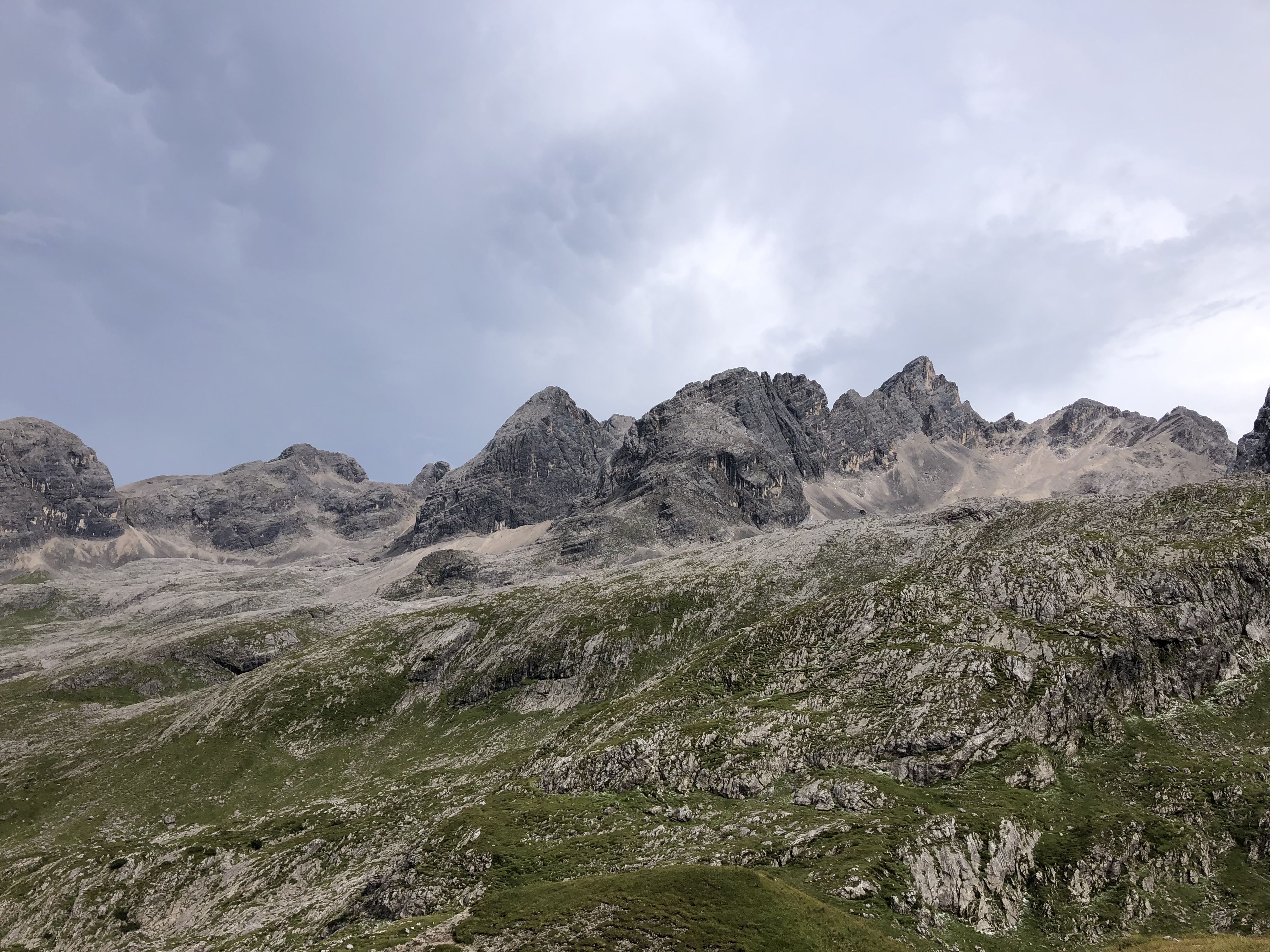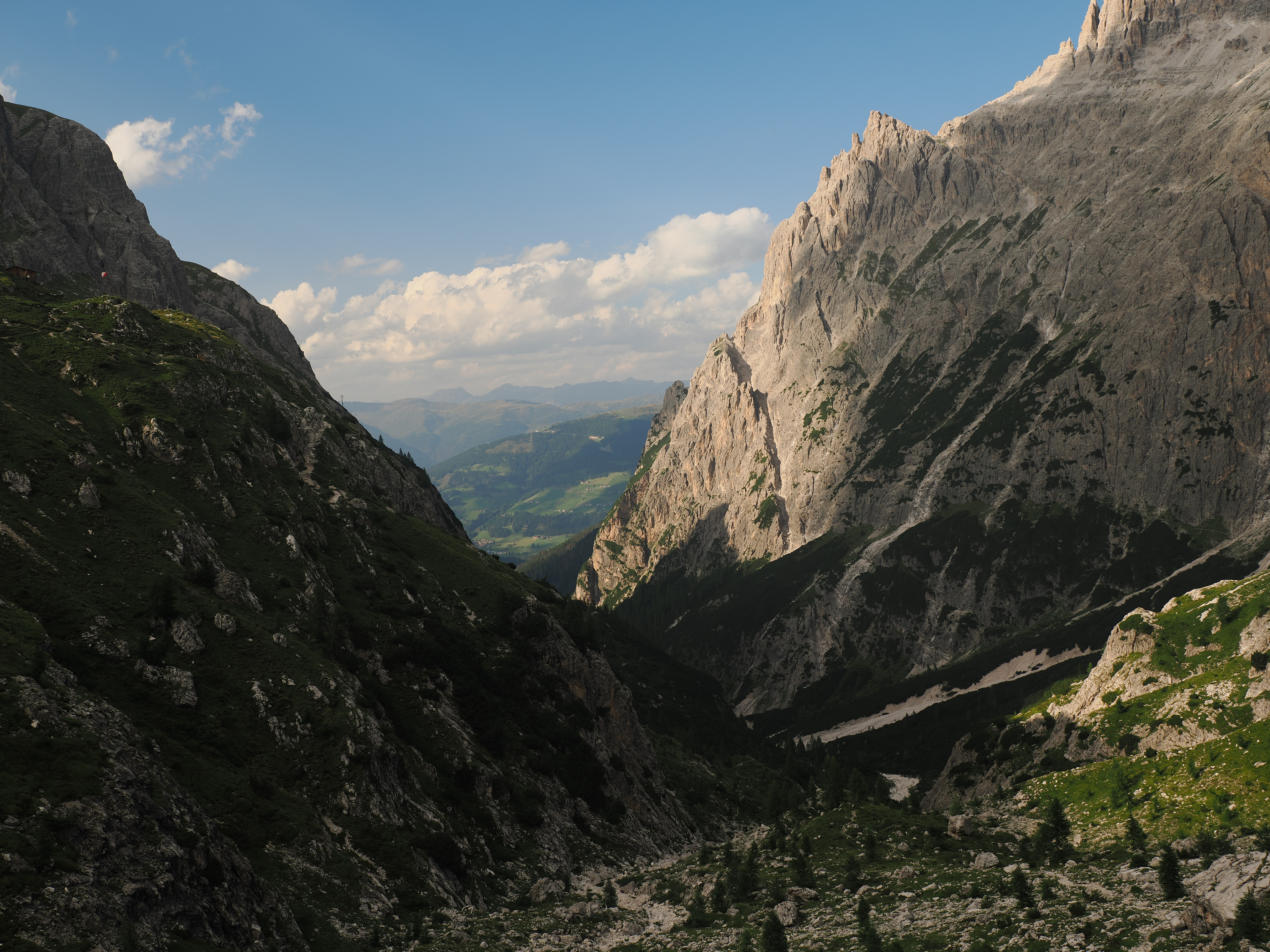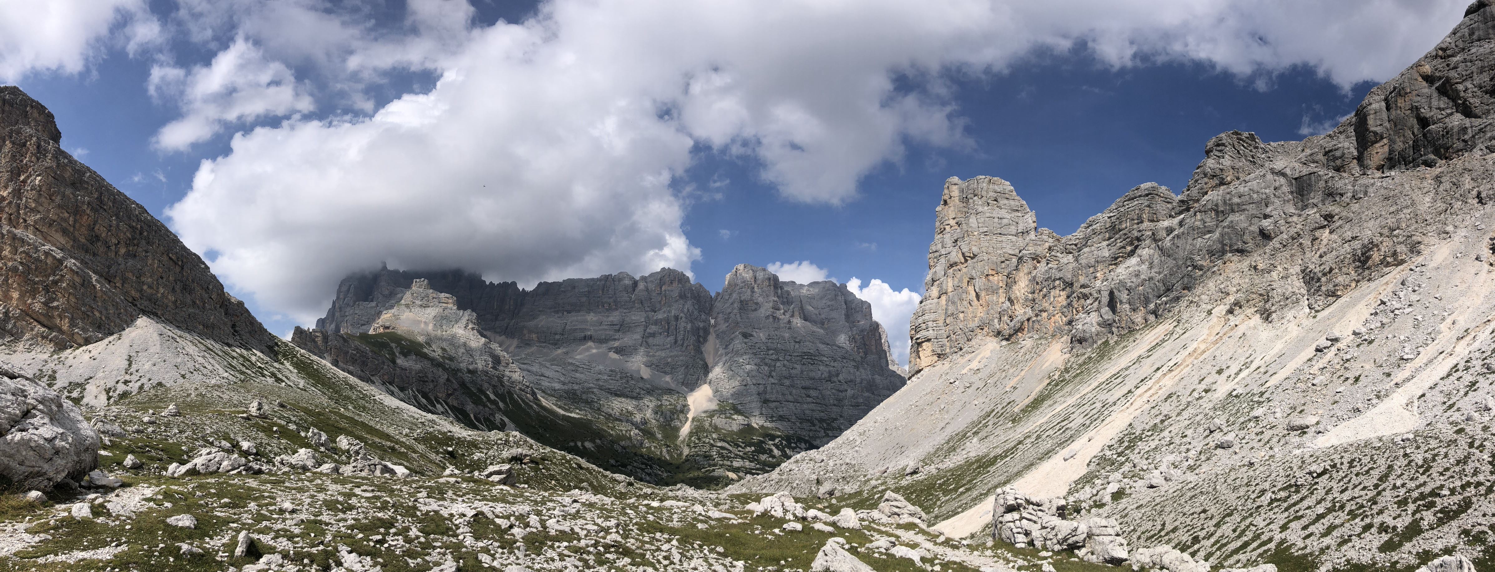 Last night we had discussed the weather. The forecast was for a decent day, but with the standard August disclaimer of afternoon thunderstorms. Our original plan was to walk to Bivacco Voltolina, a long day taking us over two lengthy stretches of high ground. Harboring a lingering distrust of the now-blue skies overhead and eager to avoid being burned once again, we elected instead to do a shorter day to Bivacco Musatti and finish the high ground earlier. We set out along the grassy path into Val Longa which had been filled with camoscio the evening before. The distinct path in the grass soon became rocky and I followed cairns up into the basin before becoming suspicious: there was no obvious exit ahead, only the 2,800 meter summit of the Pale de Meduci. My GPS confirmed that we had wandered too far up the valley. With some red-green color-blindness, I had missed the turn in the path where it met the rock. After a bit of thrashing back across the hillside, we were back on the steep path of the Strada Sanmarchi that ascended the now-obvious break to the ridge above.