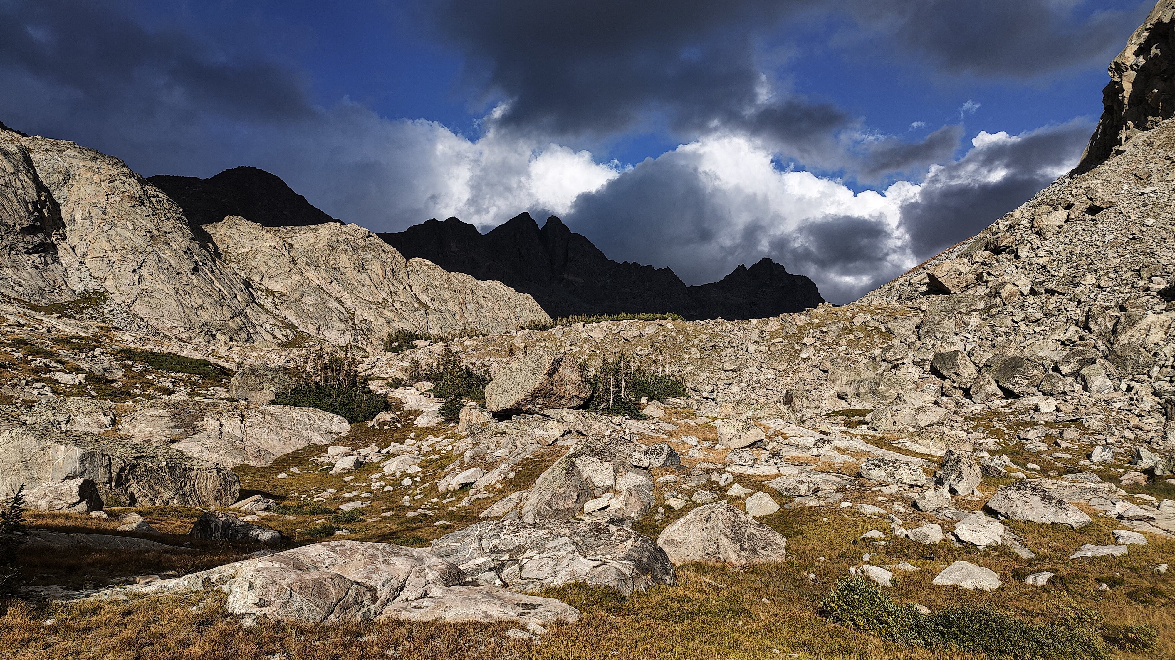 Weather forecasts based on surrounding towns can foretell major changes but they cannot be relied upon to predict localized mountain phenomena like thunderstorms, snowshowers and hail. Even more counfounding, spot forecasts can be wildly misleading. Snow rain and sunshine can all occur simultaneously within a mile or of each other and can change in the space of minutes. This is particularly true of thunderstorms. Add to the mix elevation and the proximity to the Continental Divide, in places exceeding 4000 meters, and you have the true definition of a WAG when it comes to weather forecasts. The expansive and often featureless nature of higher terrain also makes lightning unpredictable. On the high ridges and particularly along the divide, beware. Know the closest route to lower ground and watch the weather. Electrical storms can literally materialize from nowhere in a matter of minutes and move quickly, paradoxically often in the direction you are retreating. As a last resort, when everything is buzzing and your hair is standing on end, separate yourself from your pack and poles, lie flat and pray or curse, whichever is most appropriate for you. There is no season immune from major weather events, but fall is most notorious for delivering foot-deep overnight snow storms. It is common for a mid to late October storm to end the hiking season.