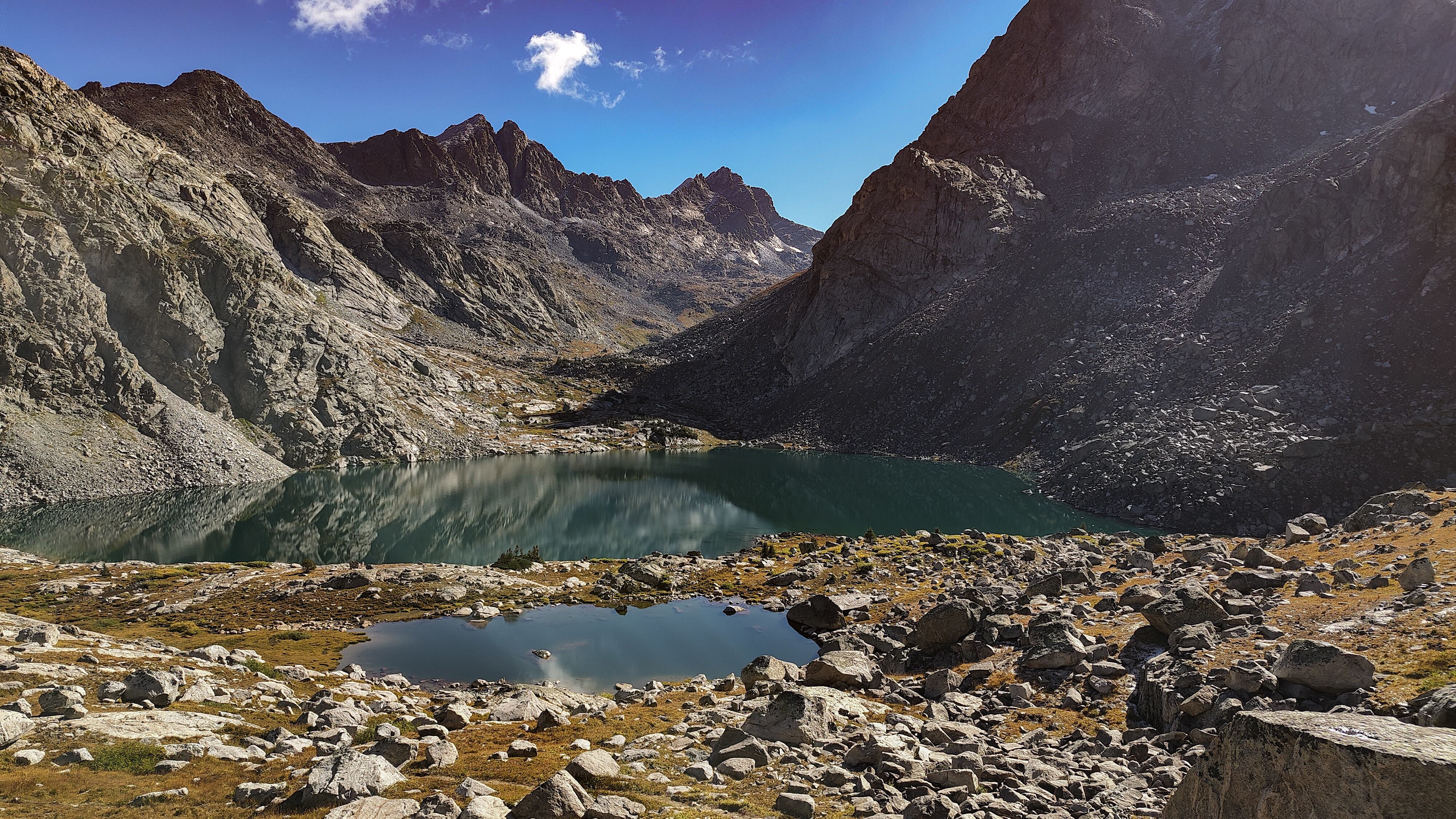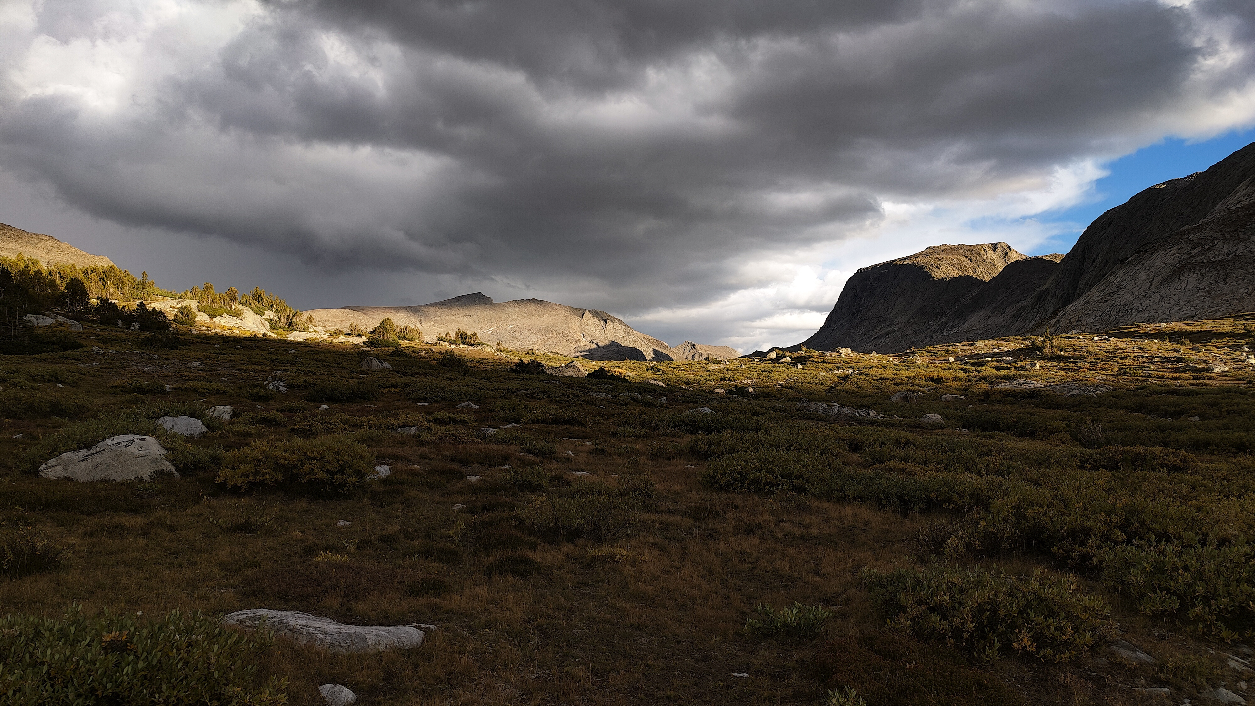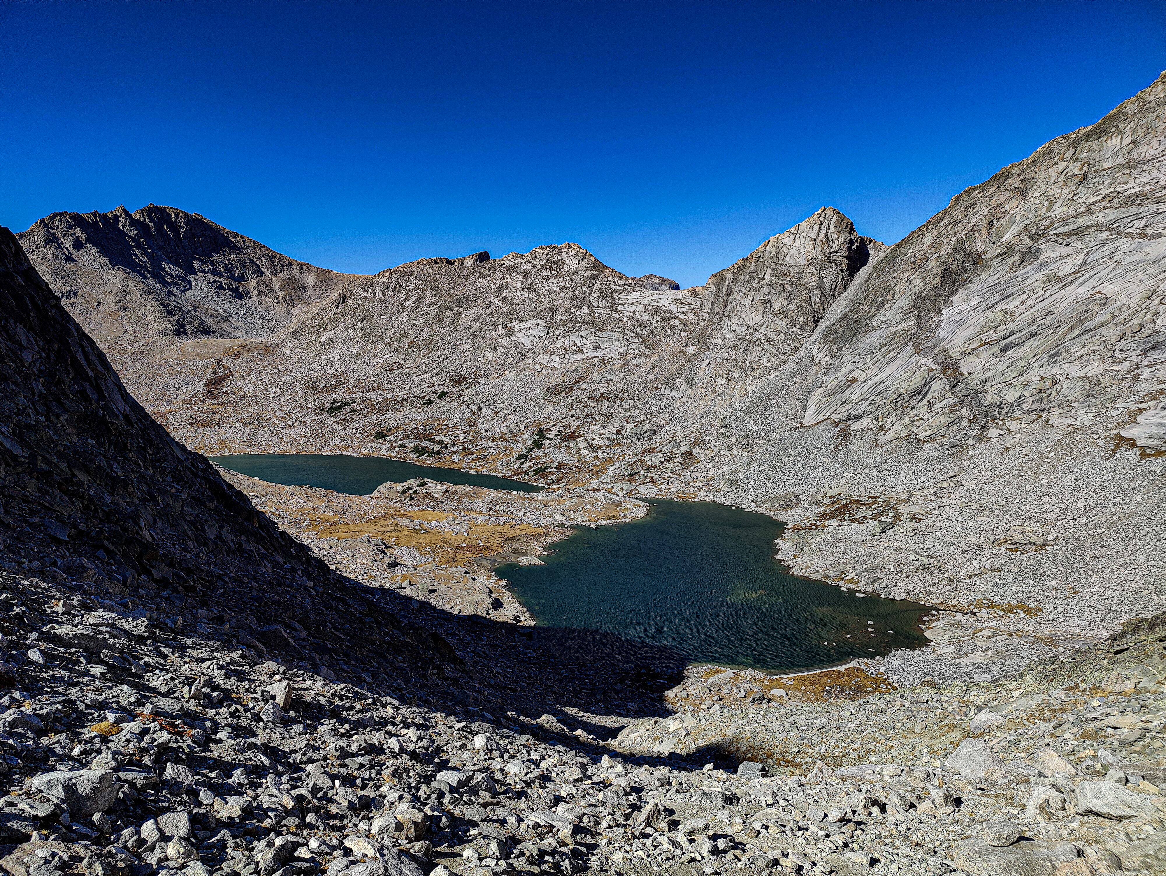 Hay Pass sneaks up on you, and you're not quite sure you've arrived until it becomes apparent that you're headed downhill toward Dennis Lake which eventually, and quite unexpectedly comes into view. I prefer studying maps after a trip rather than before, and in the case of the Winds, where navigation in clear weather with just a simple compass bearing is straightforward, letting the next turn in the path provide some anticipation. For the same reason, my inReach® remains tucked away until an emergency or the end of the day (whichever comes first). Happy to be descending rather than climbing the path, it is a matter of minutes to the Golden Lakes Basin where a left turn takes you up the drainage past three delightful lakes and a remote chance of seeing members of your species fishing the long-ago stocked lakes. Though a trail up Bull Lake Creek leads to the basin from the east, it is next to forever to the trailhead. Upon arriving at Upper Golden Lake, the highest lake in the basin, I once again left the Wilson-Dixon route leading to the Alpine Lakes basin and instead, headed west cross-country up a drainage toward another crossing of the continental divide. I passed a couple of lakes that had, at sometime in the past been stocked for fish were rising to feed on a hatch that was taking place. Eventually I reached the top of a promontory overlooking a rocky basin with some small tarns. I would have to descend 50 meters os so from here in order to continue up to the divide. I couldn't see anything in the surrounding area that might make a better camp than where I was standing, it was getting on into late afternoon and it would take me a full two hours to go up and over the divide, then descend to somewhere suitable for a camp. The possibility of afternoon showers and a desire to spend some time on the divide made this seem as good a spot as any to stop for the day. There was a level patch of sedge between two large rocks and a pond nearby. That sealed the deal. I set up my tent thinking that my freeze-dried Chicken Tetrachloride would taste pretty good tonight.
