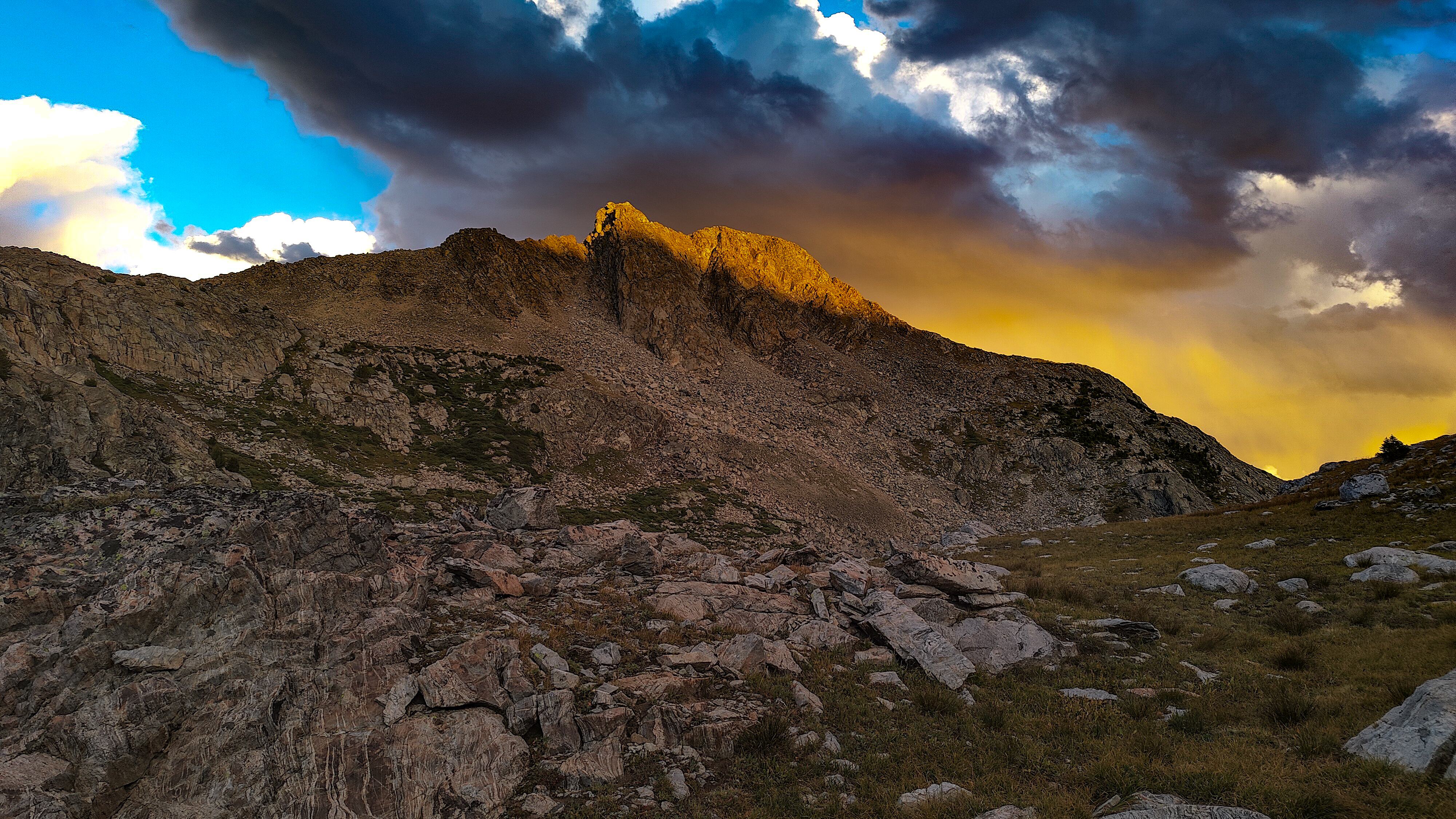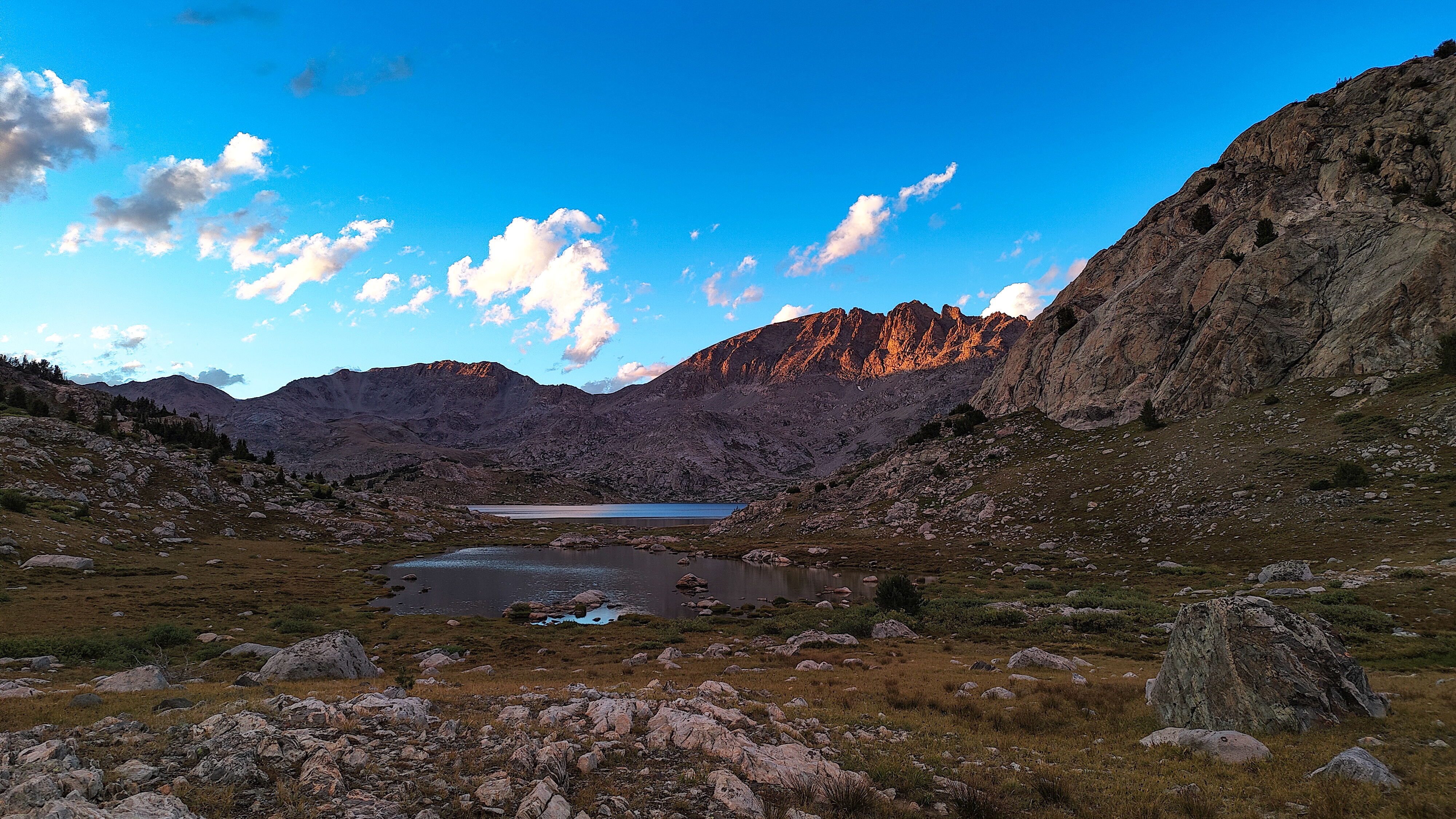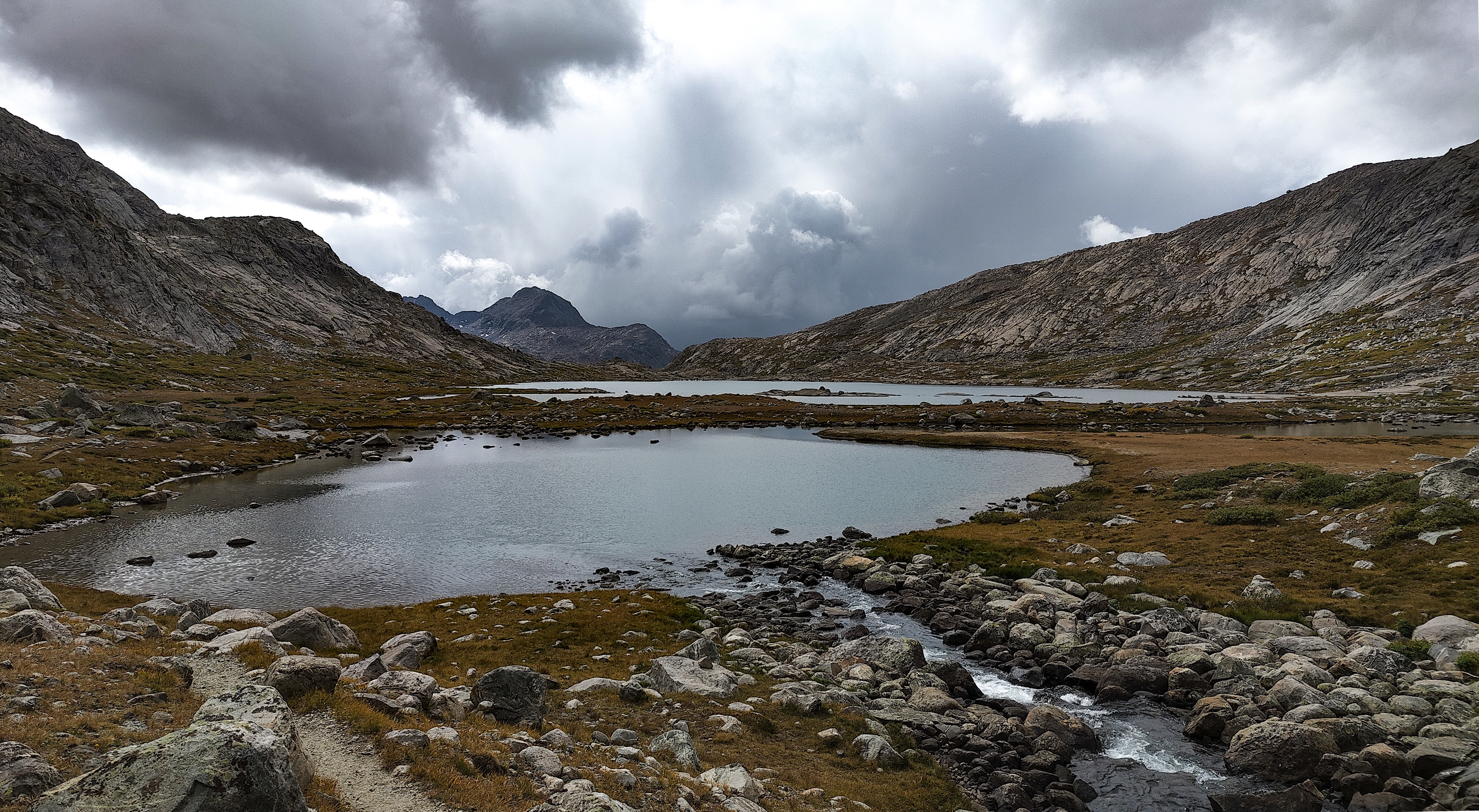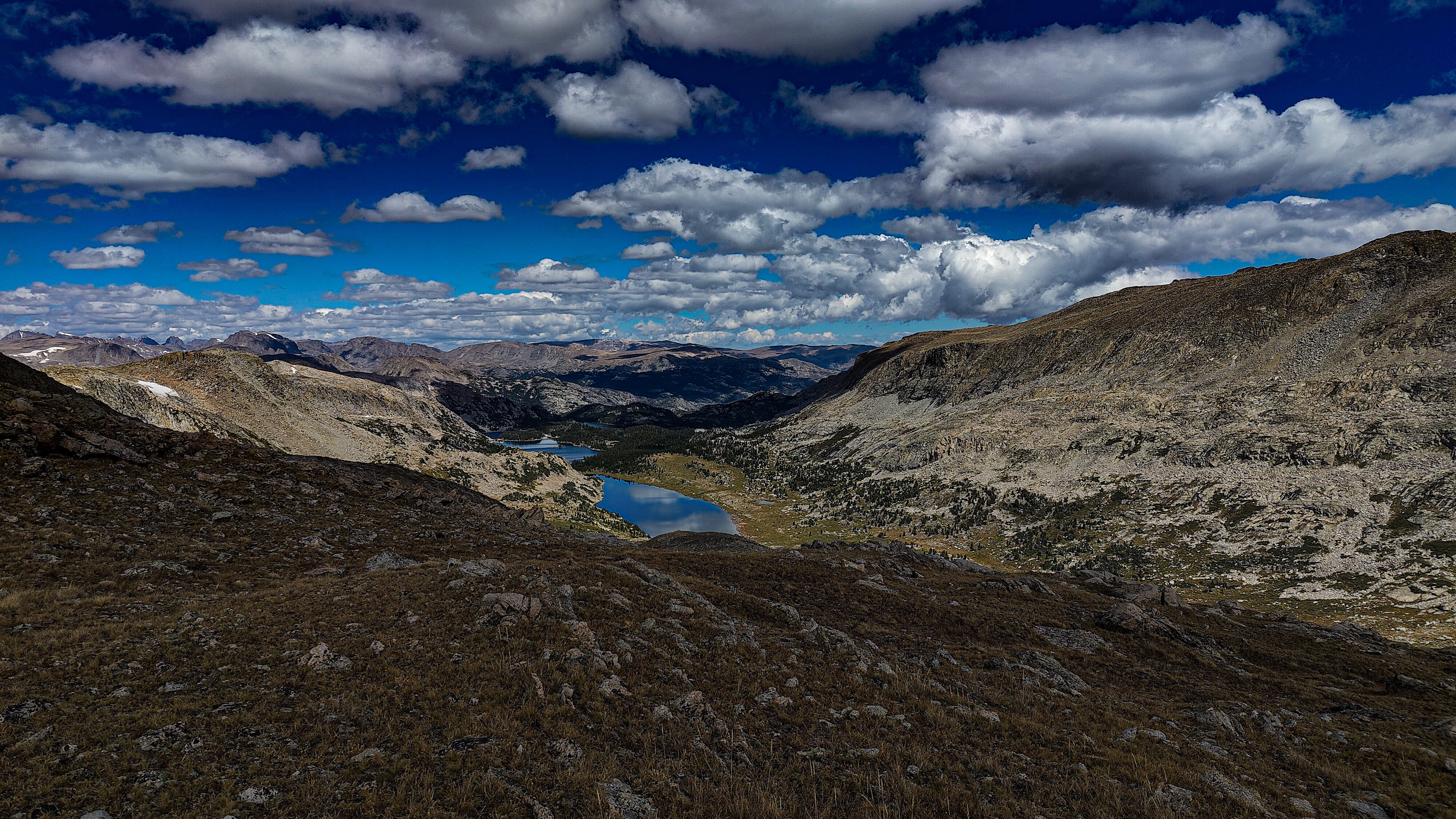 Hay Pass sneaks up on you, and you're not quite sure you've arrived until it becomes apparent that you're headed downhill toward Dennis Lake which eventually, and quite unexpectedly comes into view. I prefer studying maps after a trip rather than before, and in the case of the Winds, where navigation in clear weather with just a simple compass bearing is straightforward, letting the next turn in the path provide some anticipation. For the same reason, my inReach® remains tucked away until an emergency or the end of the day (whichever comes first). Happy to be descending rather than climbing the path, it is a matter of minutes to the Golden Lakes Basin where a left turn takes you up the drainage past three delightful lakes and a remote chance of seeing members of your species fishing the long-ago stocked lakes. Though a trail up Bull Lake Creek leads to the basin from the east, it is next to forever to the trailhead. Upon arriving at Upper Golden Lake, the highest lake in the basin, I once again left the Wilson-Dixon route leading to the Alpine Lakes basin and instead, headed west cross-country up a drainage toward another crossing of the continental divide. I passed a couple of lakes that had, at sometime in the past been stocked for fish were rising to feed on a hatch that was taking place. Eventually I reached the top of a promontory overlooking a rocky basin with some small tarns. I would have to descend 50 meters os so from here in order to continue up to the divide. I couldn't see anything in the surrounding area that might make a better camp than where I was standing, it was getting on into late afternoon and it would take me a full two hours to go up and over the divide, then descend to somewhere suitable for a camp. The possibility of afternoon showers and a desire to spend some time on the divide made this seem as good a spot as any to stop for the day. There was a level patch of sedge between two large rocks and a pond nearby. That sealed the deal. I set up my tent thinking that my freeze-dried Chicken Tetrachloride would taste pretty good tonight.