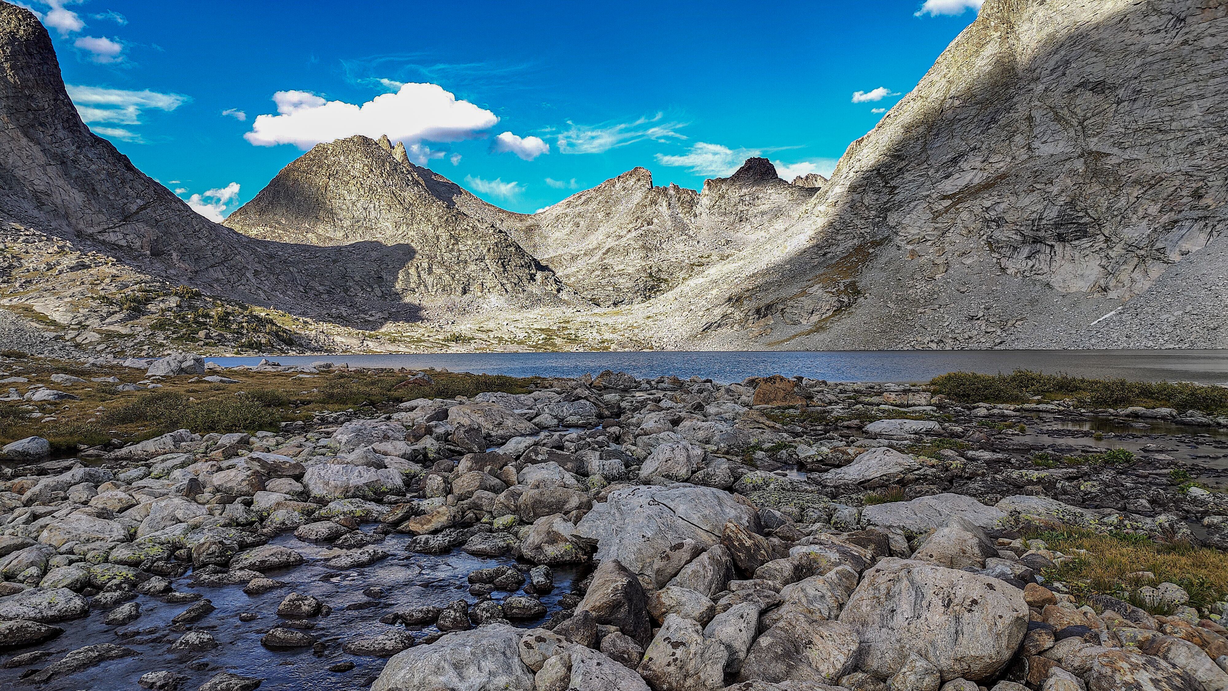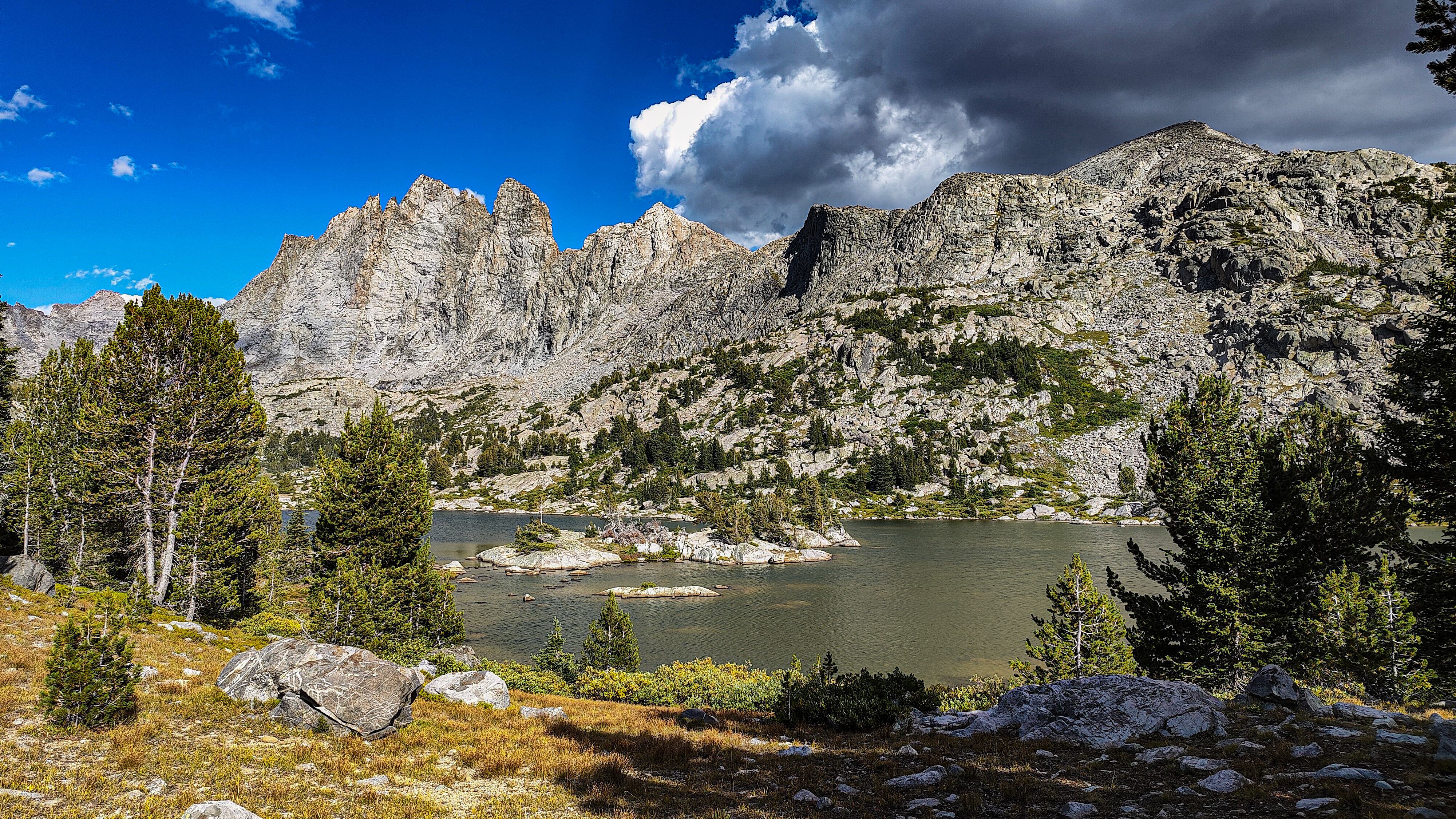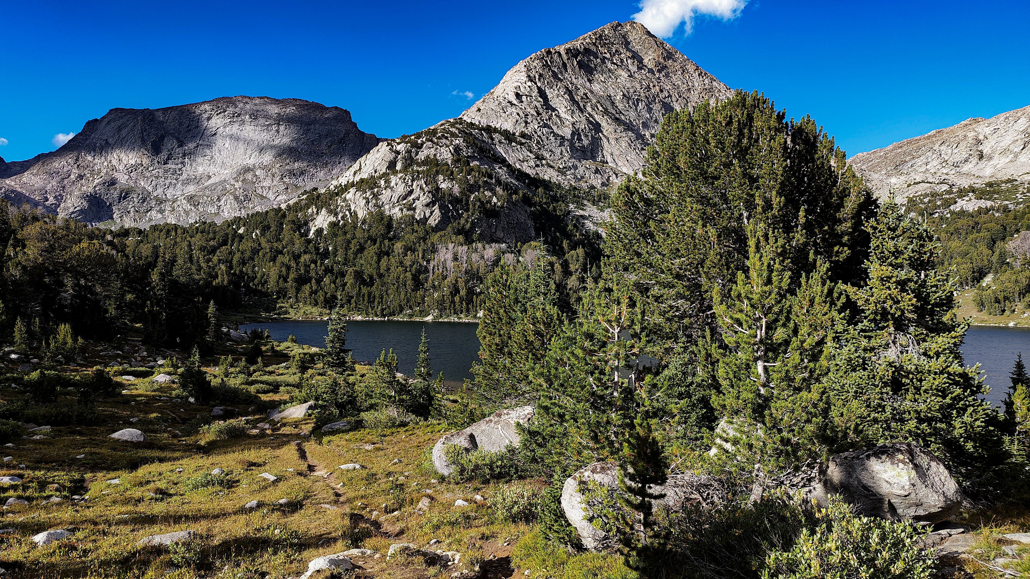 Except for a few climbing parties, all seemingly headed for Pingora, everyone had apparently slept in after last night's excitement for I saw no one until well up the Texas Pass trail where I met an older couple who said they had bivvied just below the pass. They were cautiously making their way down to the lake to regroup following last night's storm. The fellow warned me of the dangers of the terrain above, which I thought odd, then began admonishing me for traveling solo, ticking off each possible "don't you know that this could happen" catastrophe on the list while, who I assumed was his wife, nodded or shook her head with each of his bullets. Yearning to respond to this dressing down with something clever but sensing that doing so would only precipitate an even more comprehensive lecture, I instead thanked them for their concern and continued on, thinking that if I were looking to commit an irresponsible act, Texas Pass at 3500 meters in a thunderstorm would certainly make the short list. During the twenty minutes or so to the pass, I wondered how many others had unintentionally danced with the devil during last night's storm. While a ranger in Grand Teton National Park, it was almost a certainty that we would be fetching someone from the mountains following a storm like last night's. At the pass I was a greeted with a stiff, cool breeze from the north. Sweaty, and with no convenient place to linger out of the wind, I made my way down to Texas Lake, passing several parties laboring up the steep, loose ground, headed to the Cirque. I met two more people crossing Washakie Creek on an otherwise empty trail to Pyramid Lake. By afternoon both the wind and clouds had disappeared. It was still early when I arrived at the lake which looked to be deserted as well. The day had been a relatively easy one and I considered scrambling up Mt. Hooker to look down its immense north face, but by the time I had set up camp, a second look at the 500m of slabs and talus made a swim and a nap in the afternoon sun seem much more appealing. There were fish here, and it only took a couple of minutes to catch two 8-inchers and stretch tonight's noodles.