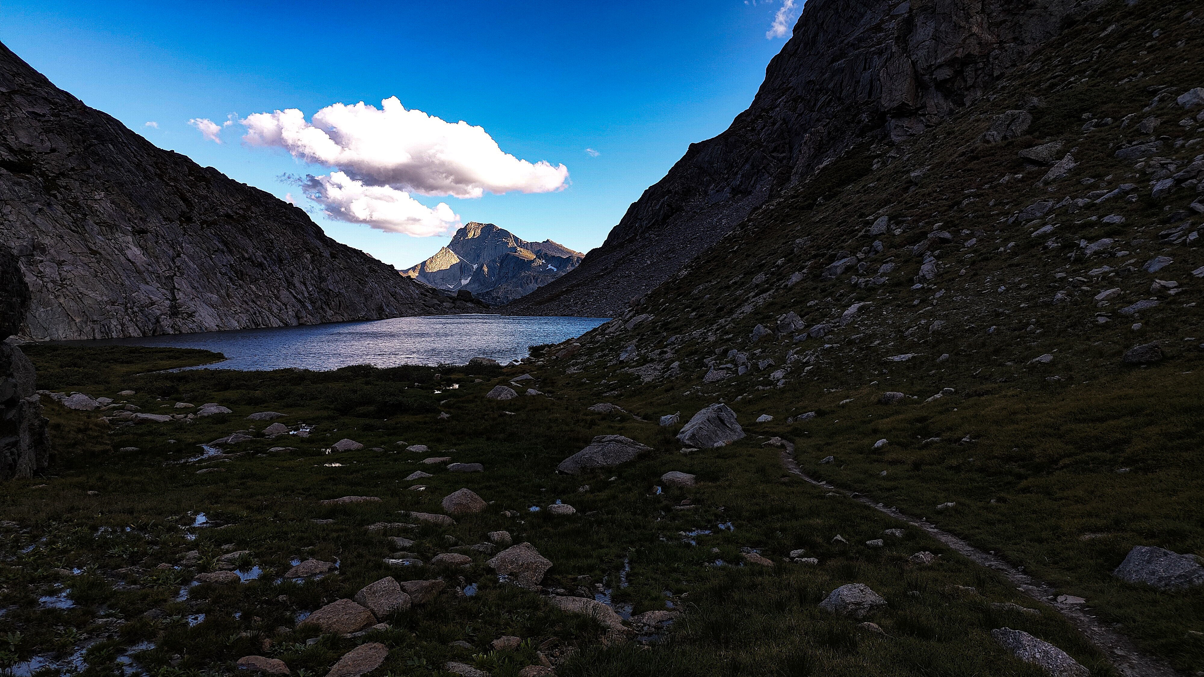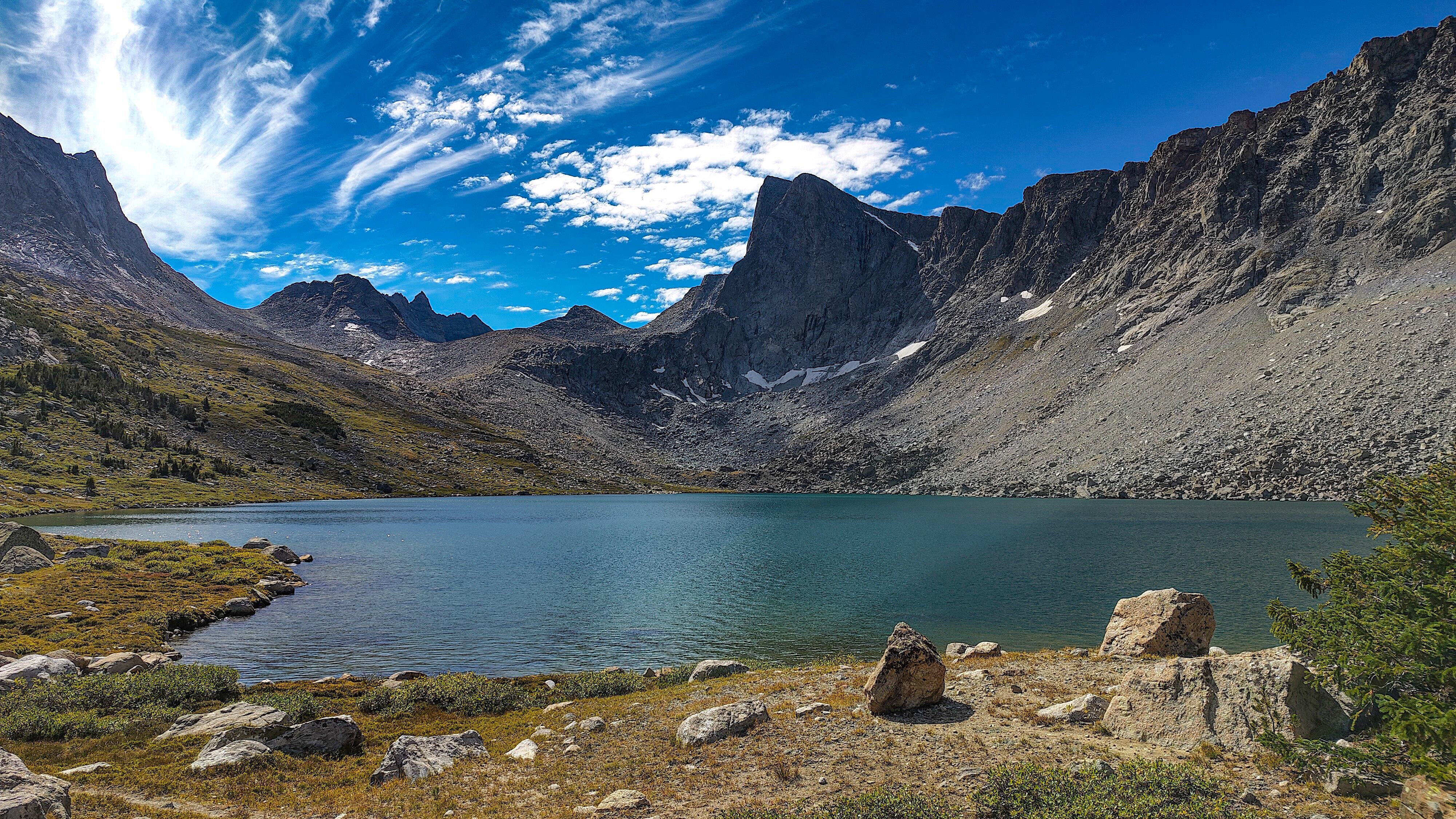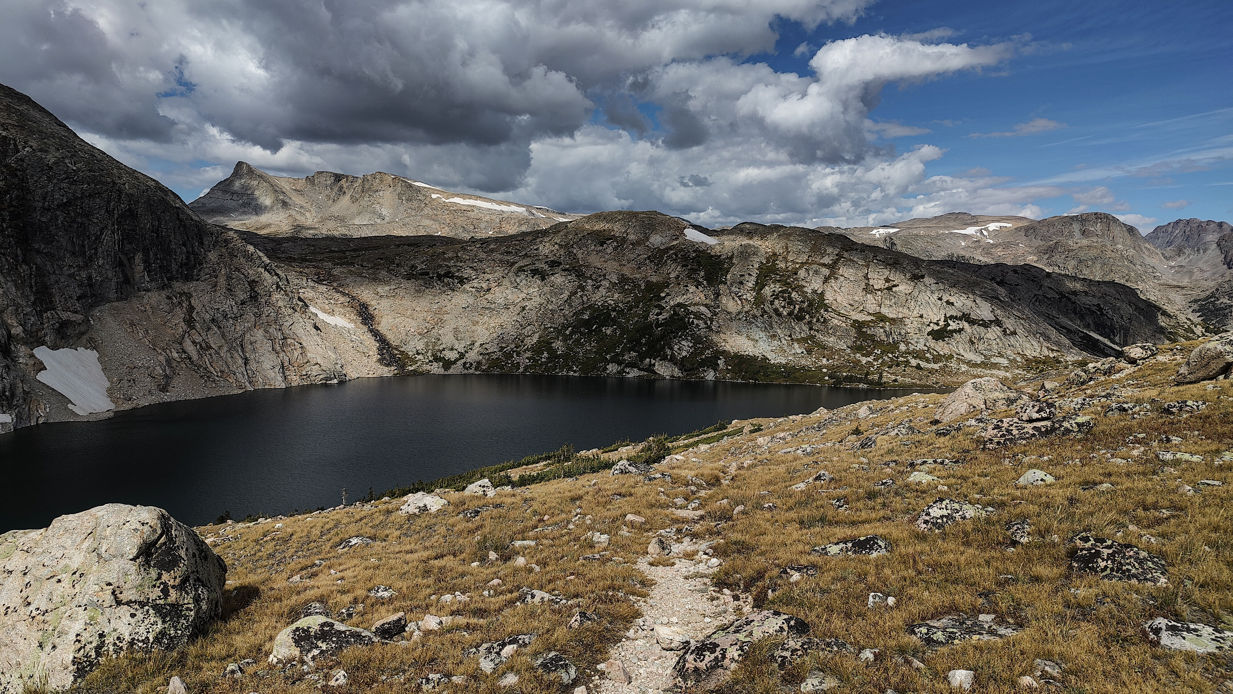 Except for a few climbing parties, all seemingly headed for Pingora, everyone had apparently slept in after last night's excitement for I saw no one until well up the Texas Pass trail where I met an older couple who said they had bivvied just below the pass. They were cautiously making their way down to the lake to regroup following last night's storm. The fellow warned me of the dangers of the terrain above, which I thought odd, then began admonishing me for traveling solo, ticking off each possible "don't you know that this could happen" catastrophe on the list while, who I assumed was his wife, nodded or shook her head with each of his bullets. Yearning to respond to this dressing down with something clever but sensing that doing so would only precipitate an even more comprehensive lecture, I instead thanked them for their concern and continued on, thinking that if I were looking to commit an irresponsible act, Texas Pass at 3500 meters in a thunderstorm would certainly make the short list. During the twenty minutes or so to the pass, I wondered how many others had unintentionally danced with the devil during last night's storm. While a ranger in Grand Teton National Park, it was almost a certainty that we would be fetching someone from the mountains following a storm like last night's. At the pass I was a greeted with a stiff, cool breeze from the north. Sweaty, and with no convenient place to linger out of the wind, I made my way down to Texas Lake, passing several parties laboring up the steep, loose ground, headed to the Cirque. I met two more people crossing Washakie Creek on an otherwise empty trail to Pyramid Lake. By afternoon both the wind and clouds had disappeared. It was still early when I arrived at the lake which looked to be deserted as well. The day had been a relatively easy one and I considered scrambling up Mt. Hooker to look down its immense north face, but by the time I had set up camp, a second look at the 500m of slabs and talus made a swim and a nap in the afternoon sun seem much more appealing. There were fish here, and it only took a couple of minutes to catch two 8-inchers and stretch tonight's noodles.