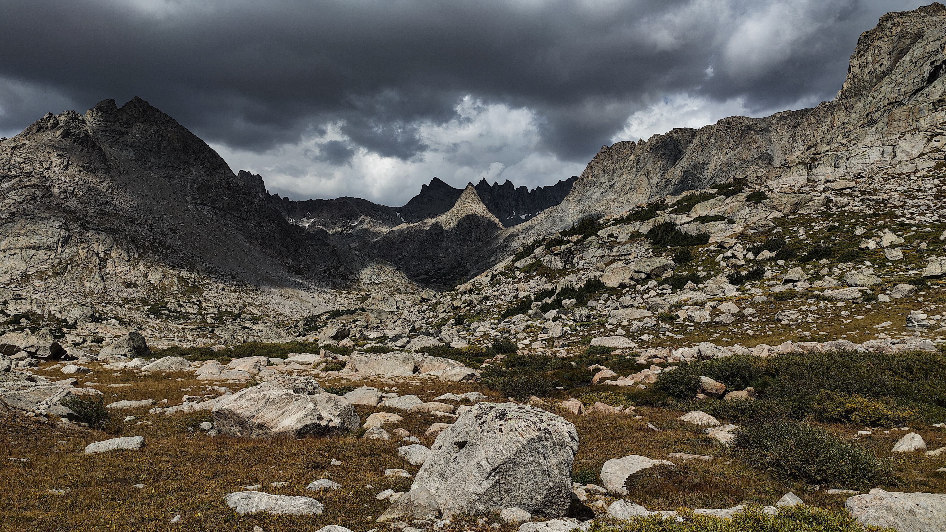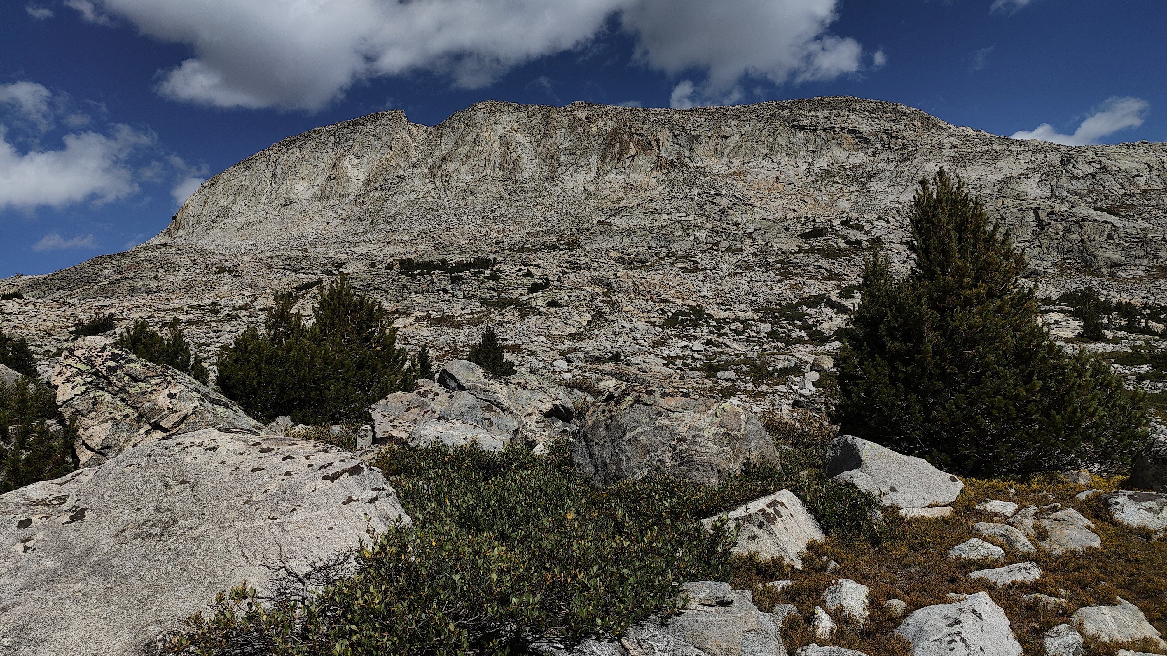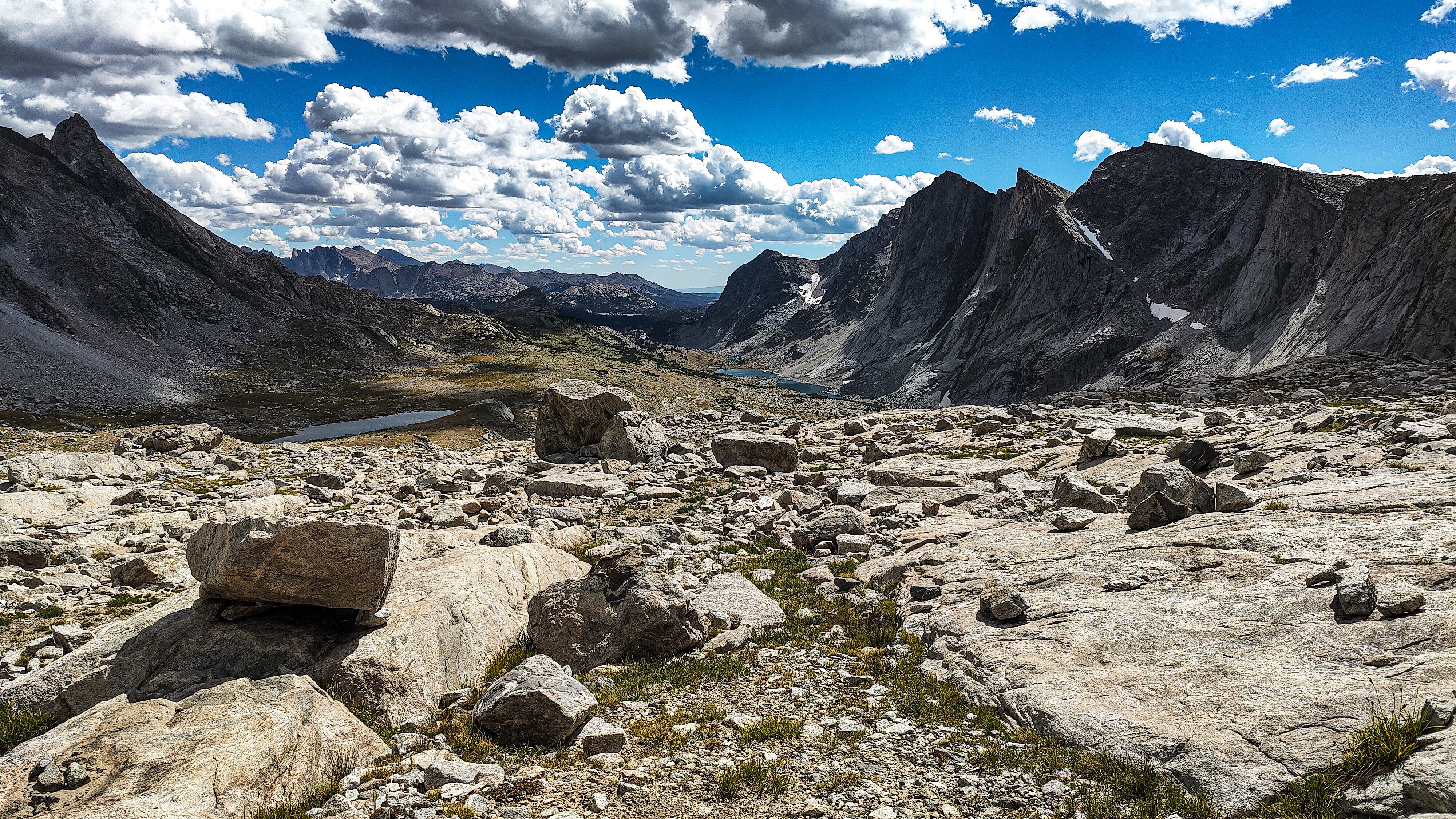 I discovered that I had shared Pyramid Lake with one other quiet party camped across the water, and we acknowledged each other with a wave as I left. The marked trail ended at the lake but an obvious use path heading west to the East Fork River divide and north along a broad bench above Desolation Valley appeared in its place. At this divide, the view is stunning. The Wilson-Dixon route is visible as a slight disturbance across the grassy meadow to the north. While there are lakes on the floor of this treeless valley cradling the headwaters of the East Fork River, it is the impressive 3 km long wall of 3700 + meter peaks marching from Mt. Geikie, Peak 12,183 , and Peak 12,187 with its curious giant black "M" intrusion, to Raid and Bonneville peaks that not only define the drainage, but stand as the westernmost bastion of summits rising above the skirt of granite that encircles and isolates the range from the Wyoming sagebrush plains. As you walk up the vally, alpine tundra replaces scrub pine but that soon gives way to headwalls, glacier-polished bedrock and finally the slopes of extra-large talus through which lies the path to the aptly-named "Pain In The Ass Pass" separating Raid and Bonneville Peaks. At near 3600 meters, this pass overlooks a broad swath of the southwestern Winds, the distant high plains and the mouth of Bonneville Basin directly below. I took advantage of three bars on the phone and reported in before descending into the Basin. The descent wandered through gentle headwalls and scree to the basin. There I caught the well-defined path that led past the lakes and up to my camp for the night at a lilliputian pond in the meadows below Sentry Pass.