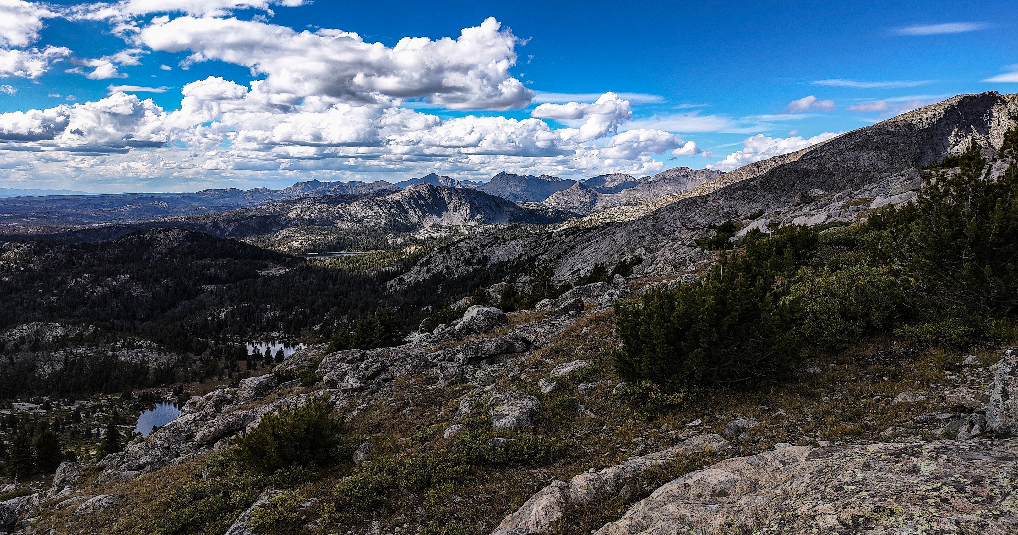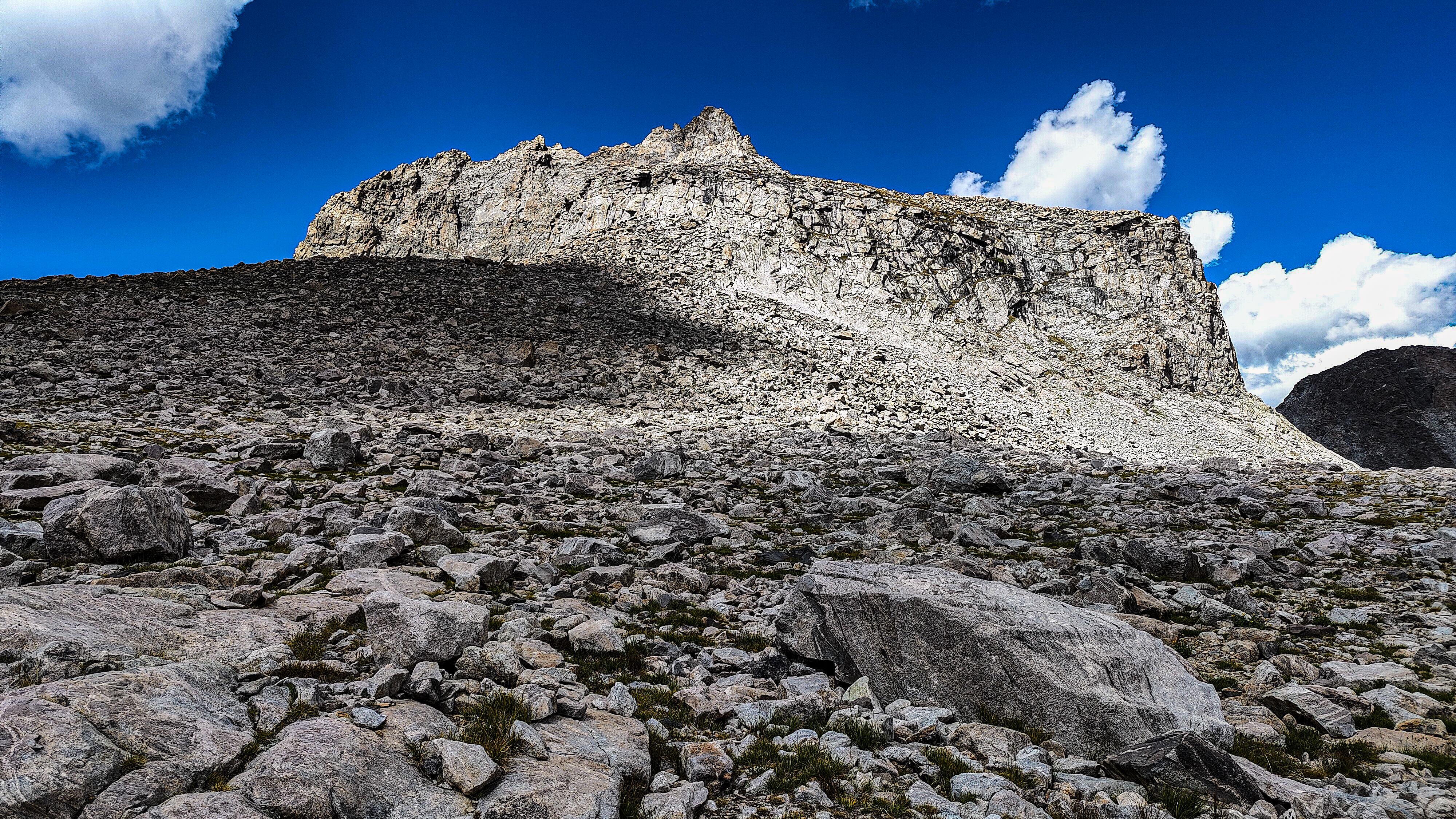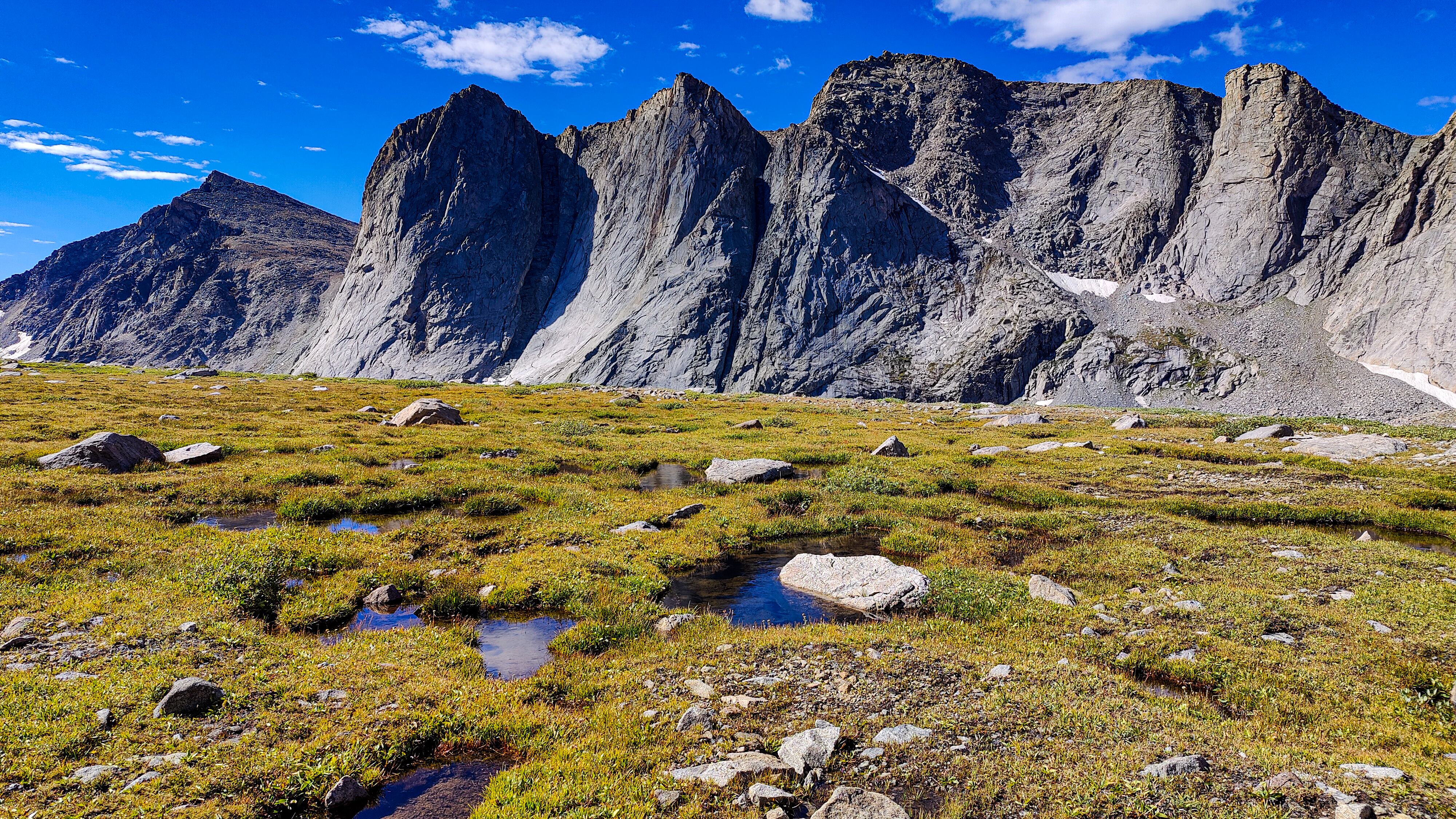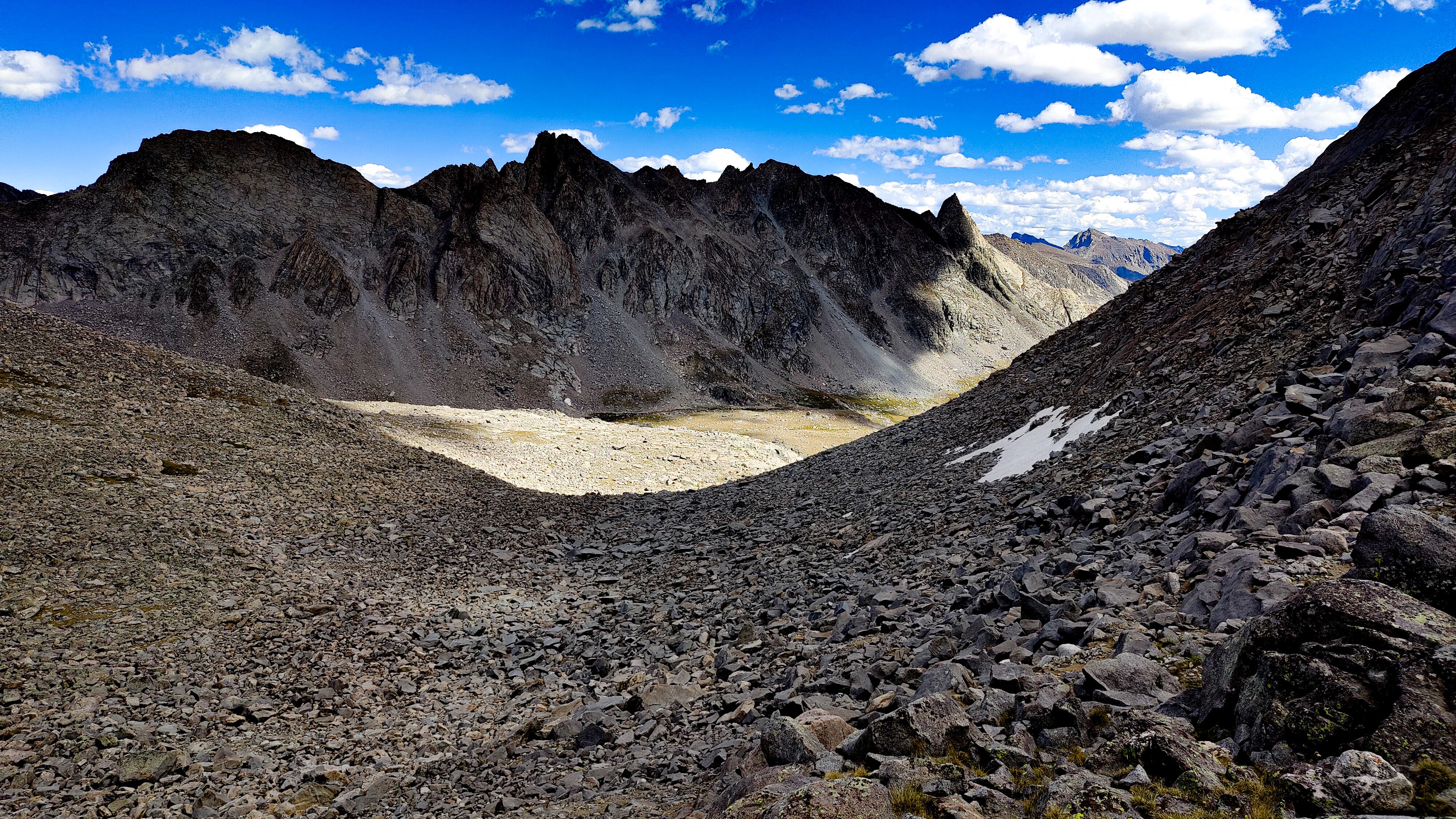 I discovered that I had shared Pyramid Lake with one other quiet party camped across the water, and we acknowledged each other with a wave as I left. The marked trail ended at the lake but an obvious use path heading west to the East Fork River divide and north along a broad bench above Desolation Valley appeared in its place. At this divide, the view is stunning. The Wilson-Dixon route is visible as a slight disturbance across the grassy meadow to the north. While there are lakes on the floor of this treeless valley cradling the headwaters of the East Fork River, it is the impressive 3 km long wall of 3700 + meter peaks marching from Mt. Geikie, Peak 12,183 , and Peak 12,187 with its curious giant black "M" intrusion, to Raid and Bonneville peaks that not only define the drainage, but stand as the westernmost bastion of summits rising above the skirt of granite that encircles and isolates the range from the Wyoming sagebrush plains. As you walk up the vally, alpine tundra replaces scrub pine but that soon gives way to headwalls, glacier-polished bedrock and finally the slopes of extra-large talus through which lies the path to the aptly-named "Pain In The Ass Pass" separating Raid and Bonneville Peaks. At near 3600 meters, this pass overlooks a broad swath of the southwestern Winds, the distant high plains and the mouth of Bonneville Basin directly below. I took advantage of three bars on the phone and reported in before descending into the Basin. The descent wandered through gentle headwalls and scree to the basin. There I caught the well-defined path that led past the lakes and up to my camp for the night at a lilliputian pond in the meadows below Sentry Pass.