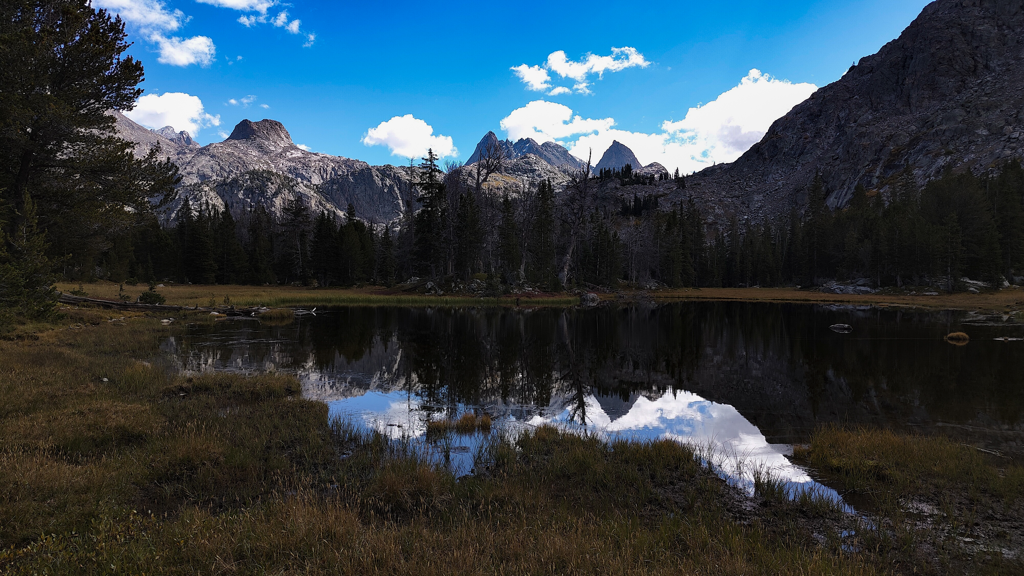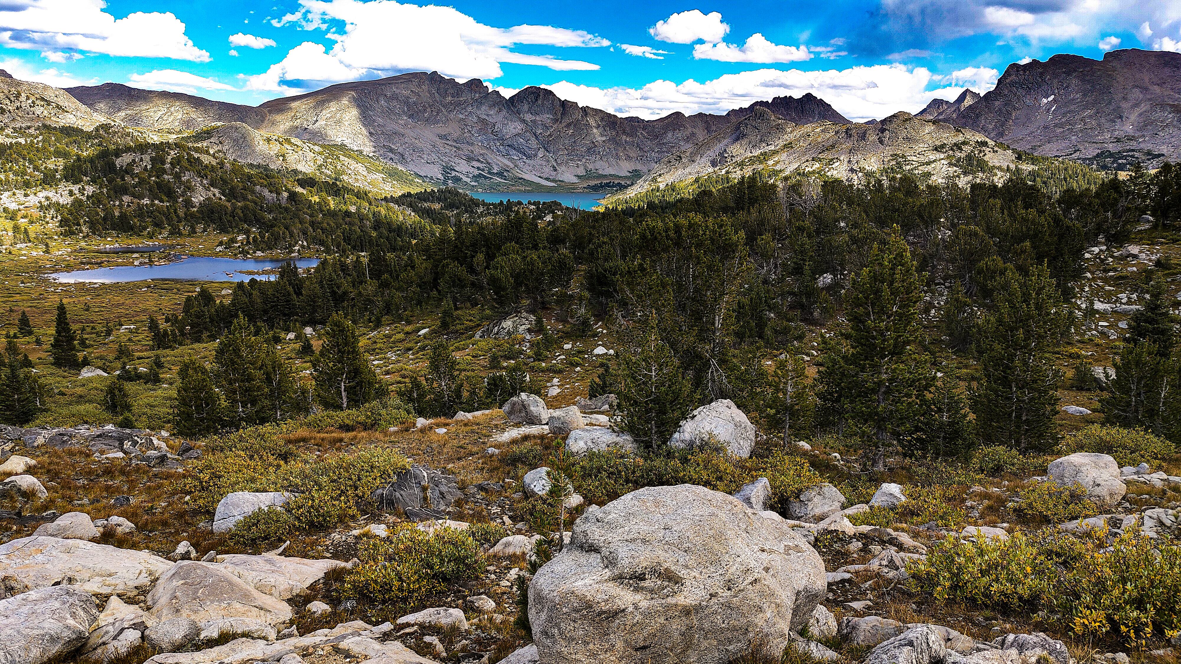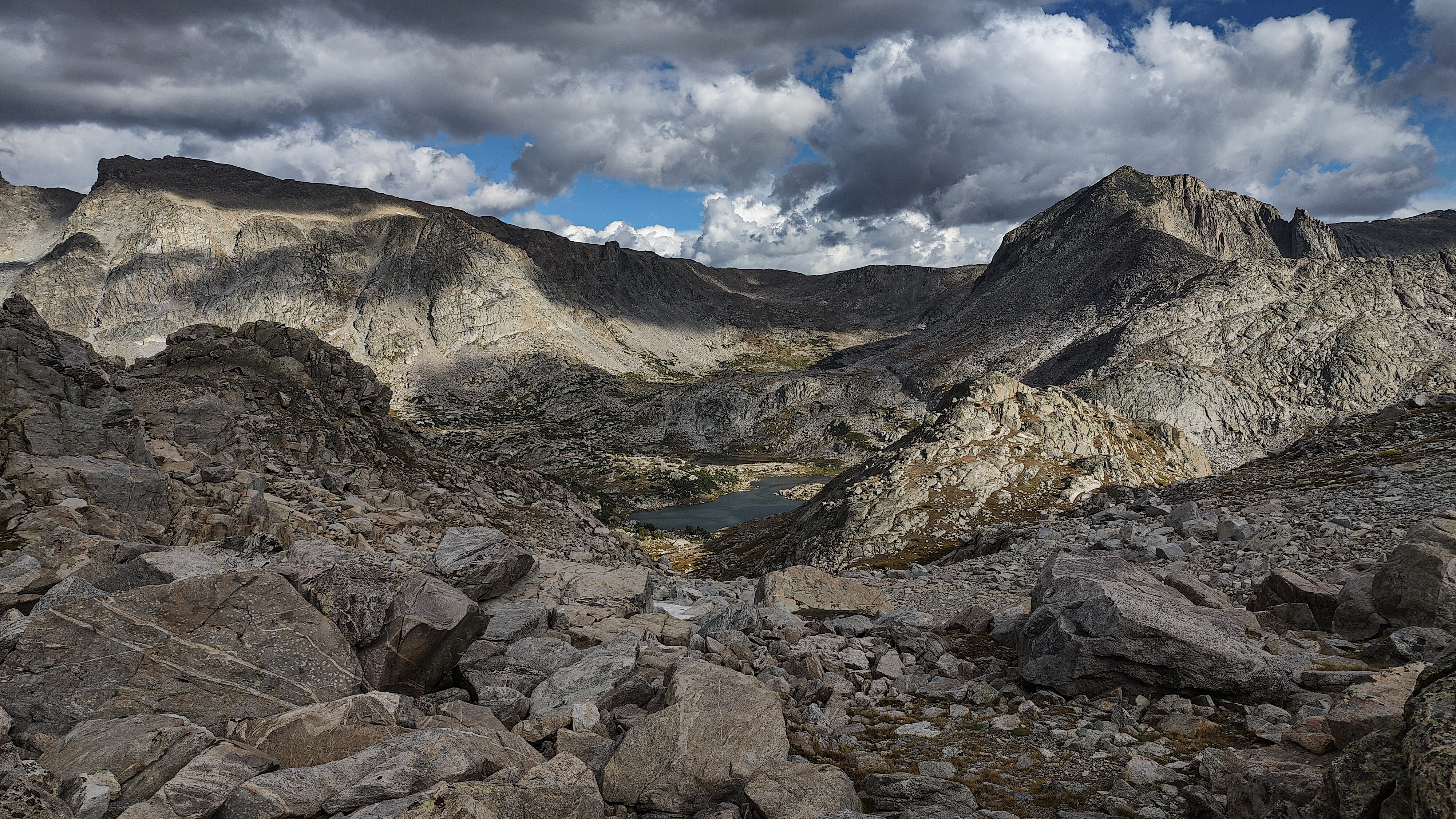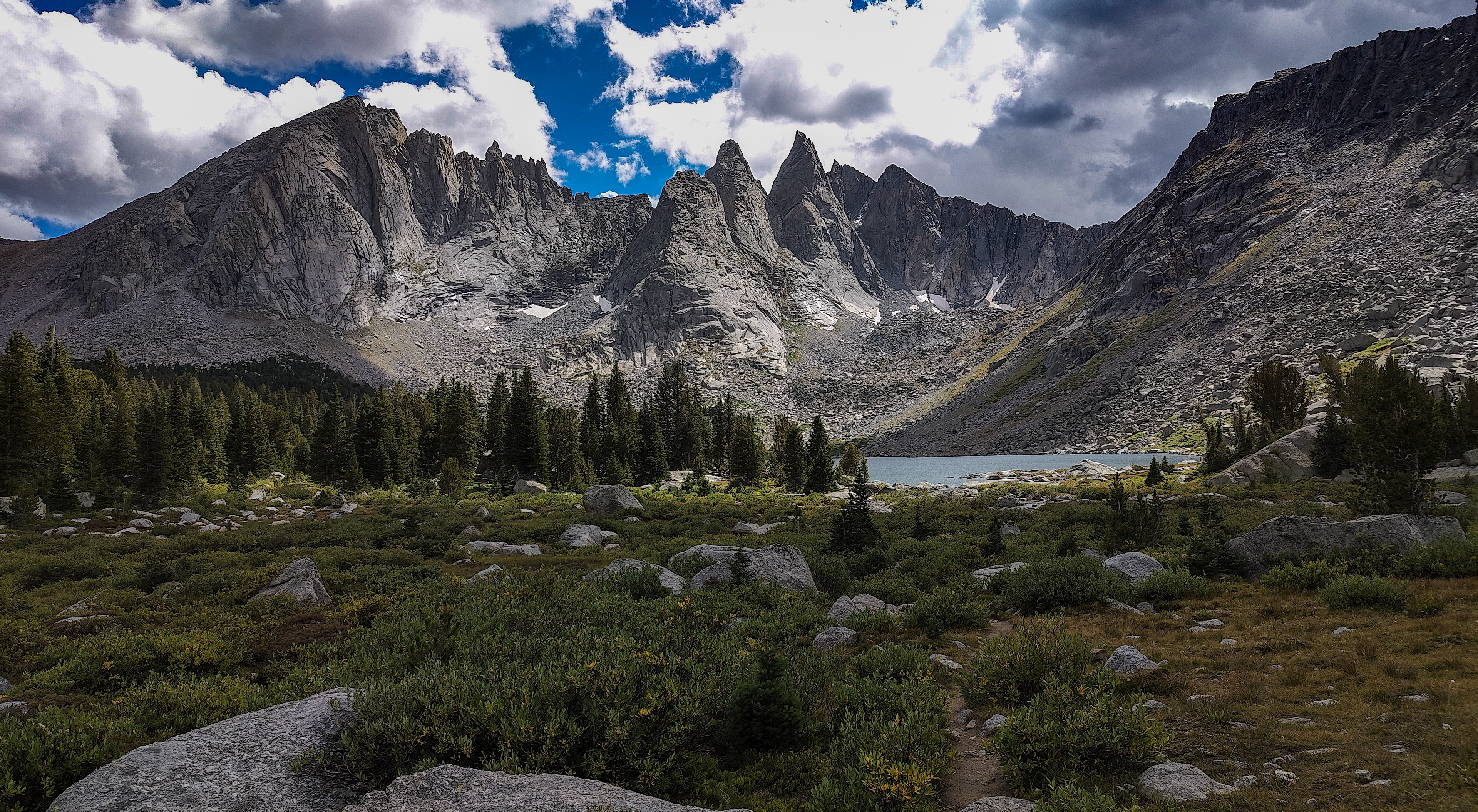 Taking advantage of a forecast for a cold snap and prolonged spell of good weather, I began the High Route in early September. After a forced 6 am start, spending most of the day spotting a vehicle and wanting no part of it in the first place, the relief on my wife's face was palpable as she headed back down the shock-busting Big Sandy road without a backward glance. Sidestepping the cloud of dust, I began my south to north journey, preferring the sun to my back and to camp the first night in the Cirque rather than along the Green with its increased bear activity. Within a minute all systems had rebooted and I was living in the moment. Like the Green, the walk along the Big Sandy River offers a gentle beginning to any adventure. With its glimpses of Wind River grandeur, Big Sandy Lake is where the warm-up ends and the fun begins. It was the Tuesday following Labor Day and still busy. The departing cold front made for cool and breezy walk up to Jackass Pass. I followed the last group of young, oxygen-starved stragglers through the "boulder problem" at Arrowhead Lake and up toward the pass. They turned out to be a young couple on their honeymoon and had driven straight through from South Bend Indiana, stopping only for gas and restrooms. Both had been up since the ceremony and as the woman said, "We were 50 miles down the road before we finished our cake". The groom was managing only 10 steps between rests but the bride, obviously in better shape and seemingly unaffected by the altitude, was determined to connsumate their marriage in the Cirque of the Towers according to the plan she outlined. I suspected there was no plan B and that anything short of a camp at Lonesome would be a cruel disappointment. We reached the pass. "It's all downhill from here" I exhorted encouragingly before realizing what I had said. He was wasted, she remained a pillar of matrimonial determination, and I feared that anything further from me would only make matters worse. I offered to follow them down to the climber's cutoff and hopefully point out a campsite. After a few minutes of downhill, progress improved and we reached the cutoff. As I pointed out an empty spot just outside the 1/4 mile limit, the woman turned and embraced me. What I assumed to be relief and the beauty of the Cirque working its magic I then realized was a touching gesture of gratitude. She had tears in her eyes. I had simply failed to appreciate how important being here was to them. We shook hands, exchanged more embraces and I kissed the bride before we separated. I watched them descend for a minute or so before going on my way. Though the Cirque was predictably busy, I found a spot to camp among some climbers in the meadows below Pylon Peak. The departing weather system exited around midnight with a ferocious hour-long thunderstorm replete with all the trimmings. Not bad for the first day. Drifting off, my last thoughts were of the honeymooners and how we had been the most ephemeral of friends - we had never told each other our names.