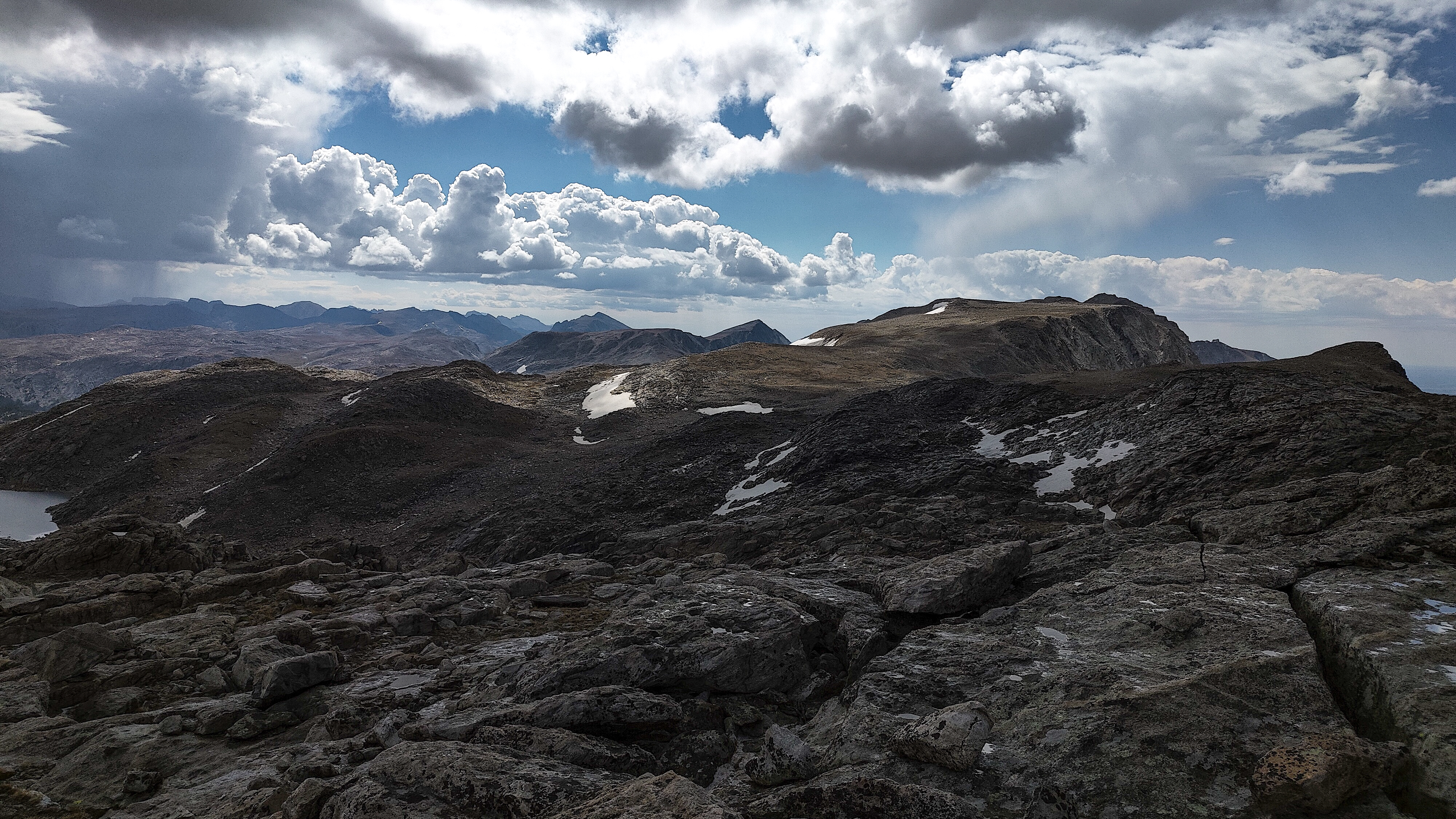 The intense thunderstorms of last night grudgingly dissipated by morning so the plan to climb Europe Peak and walk the Continental Divide to Hay Pass seemed like it might be possible. However, the air remained heavy with moisture and by the time I gained the 250 m to Europe Pass, the clouds were moving in. With some misgivings, I continued up the increasingly intricate route along the divide and after an hour, reached the summit and a good 360° view. What was becoming obvious over the past hour was now undeniable. Walking along the talus-strewn exposed 8 km ridge today would probably be risky and committing, with no quick way off the broad flat expanse. I believe there is more danger in being terrified of lightning than actually being struck by it, having seen bruises, cuts, broken bones and a death due to panic rather than electrocution. However, there's nothing like a bit of static electricity in the air to prompt a quick attitude adjustment. With sprinkles here and there, the descent from the summit required a bit of attention, being rocky and somewhat exposed in sections. But just as I reached the pass, the sun broke out again. In my experience, morning thunderstorms are rarely harbingers of pleasant afternoons so I returned to my camp, still some 250m below. The further I descended, the bigger the sucker holes became and by the time I reached camp, the skies had taken on a begnign summery appearance. Screw you nature. I had resigned myself to resuming the Wilson-Dixon route. I packed up, made a short descent down-canyon and turned north, soon reaching Long Lake and the intricate, cliff-filled passage along its east shore where, like one of Pavlov's dogs, I now reflexively chose the higher route, eventually rounding the head of the lake and the shallow pass marking the head of the North Fork of Boulder Creek. The water here flows along a broad, nearly flat glacial valley in a northerly direction past Glacier Lake (of course) and toward the base of Hay Pass before dog-legging abruptly back south through the North Fork Canyon on its journey to join the Green. By the time I reached the dog leg, the day was ending and the final decision was that of picking a campsite among dozens. There was no decision to be made on dinner. It was an Ichiban evening. The stuff has roughly the same caloric content as a serving of freeze dried food and weighs in at a mere 100 grams. Some butter, onion flakes and a dash or two of habañero sauce adds some character. Best of all, it is cheap, helping to defray the exhorbitant cost of my nascent romance with the ultralight. Somewhere on the site there is an equipment list.