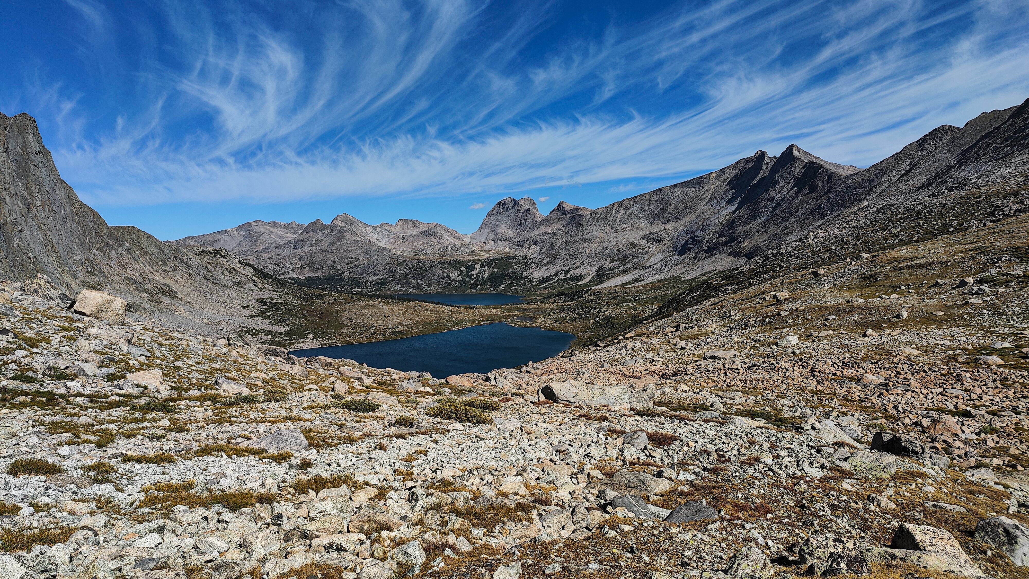 The Wind River High Route, Haute Route or Highway is a north-south route in the Wind River Range of western Wyoming that closely follows the Continental Divide for about 90 miles. It is widely considered to be the finest non-technical distance walk in the United States. The Wind River Range is a roughly 100 by 40 mile uplift containing over 150 distinct granitic peaks, of which 37 exceed 4000 meters, extensive glaciers and hundreds of lakes. Upon reaching 3000 meters, the route remains above that elevation for its entirety. About 2/3 of the route is off the established trail system and typically takes 7 to 10 days to complete. There are two popular flavors and a number of variations of the route first completed by Alan Dixon and Don Wilson in 2013. They walked from the Green River Lakes trailhead south to Big Sandy Opening, a distance of about 85 miles. A popular alternative to the Wilson-Dixon route is Andrew Skurka's "Complete Wind River High Route", lying between Bruce Bridge near Lander and Trail Lakes near Dubois. The Skurka route is a few miles longer, includes a couple of gratuitous, 13,000+ ft. peaks, and keeps mostly to the east side of the continental divide while the Wilson-Dixon favors the west side. Peak-bagging is an option on both routes. The Skurka route also passes through the Wind River Indian Reservation which requires a permit that can be most conveniently puchased at the tribal headquarters in Fort Washakie, but that stage (from Photo Pass to Europe Pass) can easily be bypassed by staying west of the divide. Both routes can be done in either direction but most favor a southern start for the Skurka and a northern start for the Wilson-Dixon. Neither route can claim passage through undiscovered country. Rather, they are ingenious weddings of sections of the range that have most certainly felt the past footsteps of those drawn to the area to explore, survey, plant or catch fish (there are no native fish in the high lakes), and graze sheep and cattle. The open nature of the terrain, particularly in the southern portions of the range, allows for many variations. The section of the Skurka route from Alpine Lakes north is spectacular.