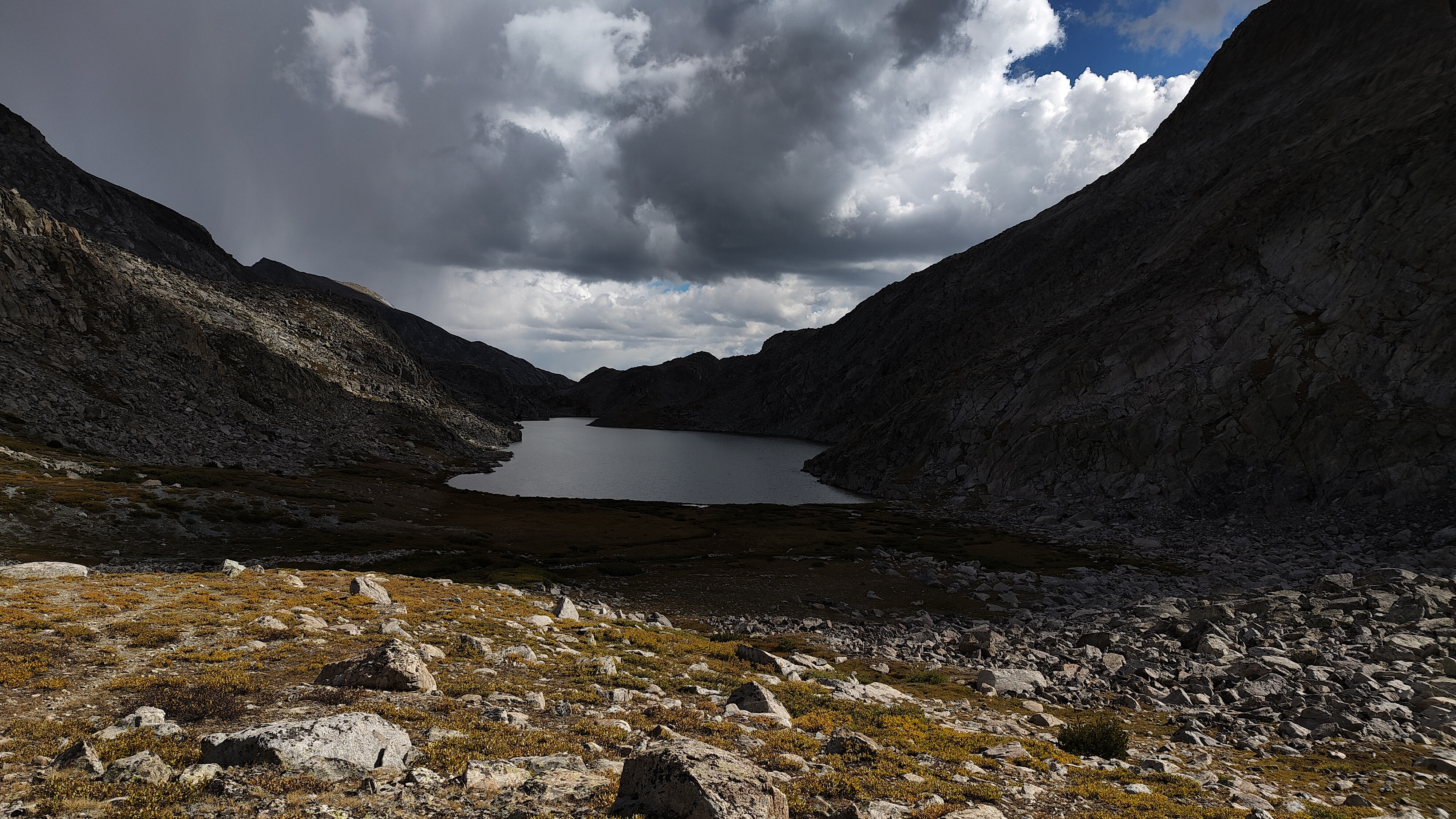 My original plan had been to combine sections of the Wilson-Dixon and Skurka high routes, as well as substituting the Alpine Lakes stage with what seemed an obvious line between Upper Golden Lake and Island Lake but for which I could find no information. The now-abandoned stage through the Milky Lakes basin and back up to Europe Pass was to be followed by a walk from there over Europe Peak then along the Continental Divide to Hay Pass. The new plan would now take me from Hall's Lake into upper Europe Canyon. I had the choice of reaching Europe Canyon via the natural contour through the low pass east of Medina Mountain or climbing out of the Hall's Lake basin due north and descending into upper Europe Canyon via a high pass on the ridge separating the two dainages. In spite of previous visits to the upper reaches of Europe Canyon, I could not recall if the pass I was studying high on the ridgeline would actually "go". After some time mulling the decision, I concluded that the distastful thought of retreating from the pass in the event of questionable terrain would only encourage risk-taking simply to save some time, and of that I had no shortage. As it turned out, the lower traverse into Europe Canyon and the walk up to its head was a pleasant stroll. As a significant passage across the great divide, I had expected to see someone in Europe Canyon but the place was empty. Once I reached the upper reaches of the canyon, a close examination of the descent from the pass I had considered earlier looked intricate but doable. I congratulated myself for my wisdom/cowardice/restraint, hastily set up camp on the shore of the upper lake and jumped in the tent just before the afternoon thunderstorms arrived. I had never used the tent, a 2 year-old Zpacks Plexamid in the full-on conditions it appeared were about to develop and I was a little skeptical with a tent weighing in at only 400 grams holding up in real life circumstances. As the storm rolled in, so did my eyes as I watched the translucent dyneema fabric strain under what I estimated to be 50 knot gusts. I briefly thought about space-age technology, Saran-Wrap, and 2.5 mm guylines, and whether my tiny titanium stakes would stay in the soft ground. The door closure design concerned me the most though because it was a simple set of toggles that held the two panels together with a two inch overlap. I was certain wind from the right direction would force water through the overlap, but whoever came up with such a minimalistic and improbable design had apparently tested it, for as the wind swung from one direction to another, the overlap stayed stubbornly snug. I sent a nice note to the company after the trip relating my experience. They returned an even nicer note, with congratulations (...for either my wise purchase or my survival, I could not tell), and assurances that the tent had been tested in much more "robust" conditions. How much was "much more robust...?" They didn't say but I guess you get what you pay for. Whatever knowledge Floridians might be suspect, concerning tents, they more than make up for with their knowledge of sails.