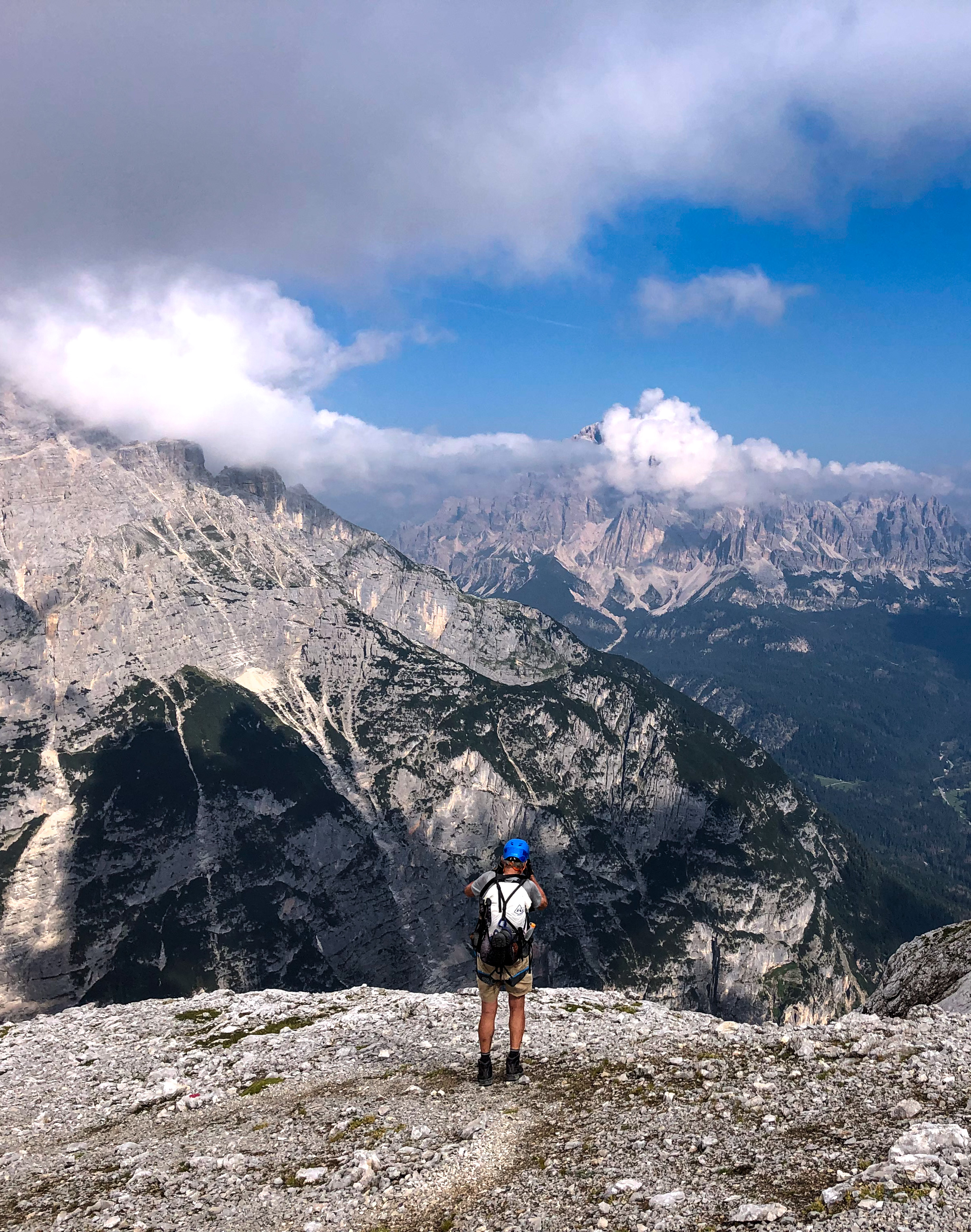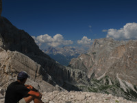 Both the Alta Via 4 and 5 share the path from Forcella Grande to Rifugio Antelao and on to the common finish in Pieve di Cadore. The three of us had followed this path on the Alta Via 4 the year before. The Alta Via 3 also visits Rifugio san Marco on its way westward, so this was my third visit, and it is a favorite. However, our day's destination, Rifugio Antelao, has first place in my heart. It looked like today would be a nice day to go there as we headed to Forcella Piccolo and down to Rifugio Galassi, where the route turned upward to the west and the Ferrata Ghiacciaio. At Galassi Claudio was told that a group of 75 young people and their instructors were also headed up the route and had left about an hour earlier. Since we would be following them up the cables, we took our time with the 400 meter ascent to its start. When we arrived, only 20 of the group were on the cable, and the remainder were queued-up below. With constant shouts of Roccia! from above, we dropped our packs, turned on the music, and kicked back. Four of the Italian military chaperones were nearby and told us that they were training this group of students who were not soldiers and thanked us for our patience and good humor. It reminded me of a NOLS outing in the States.