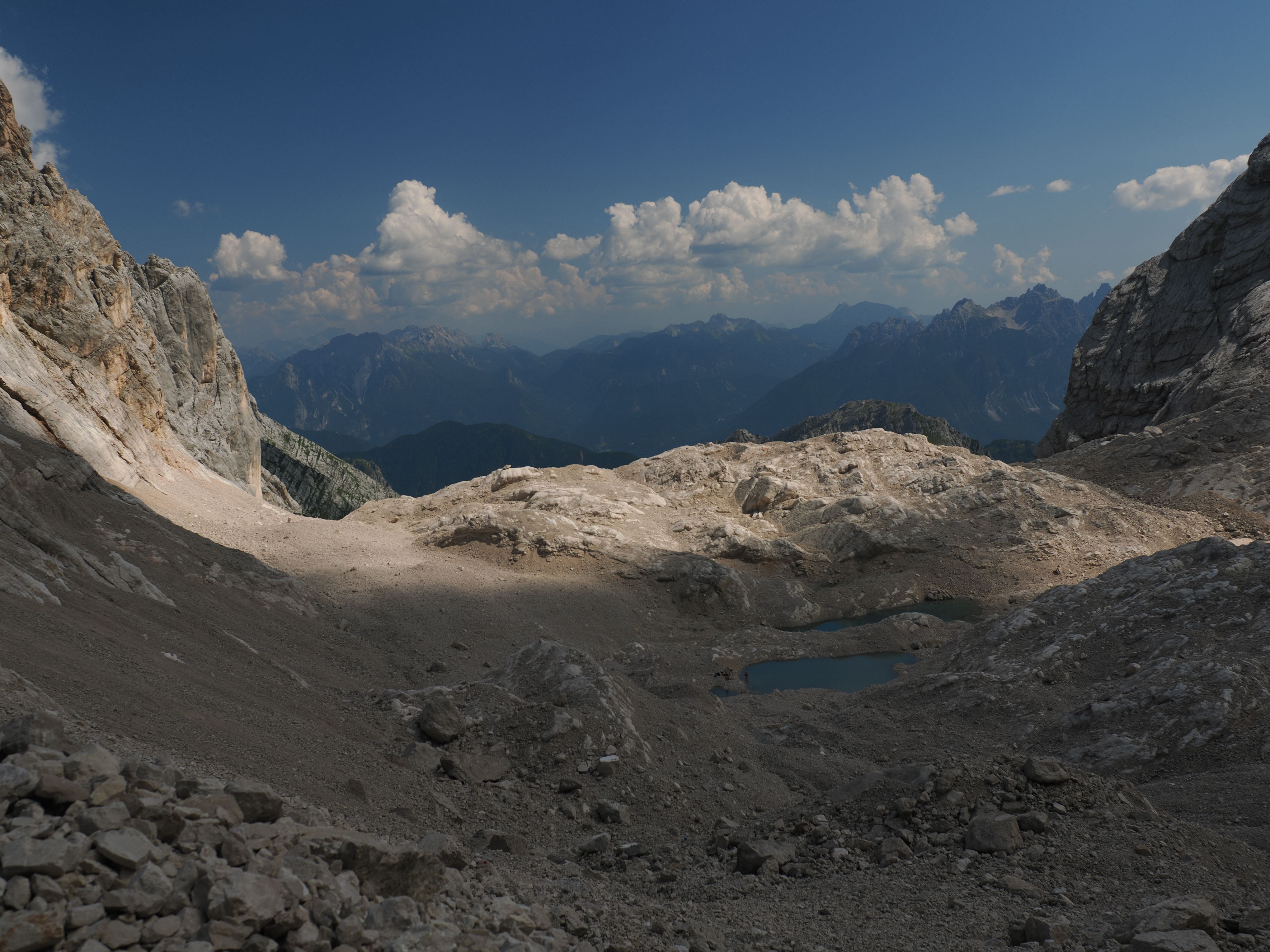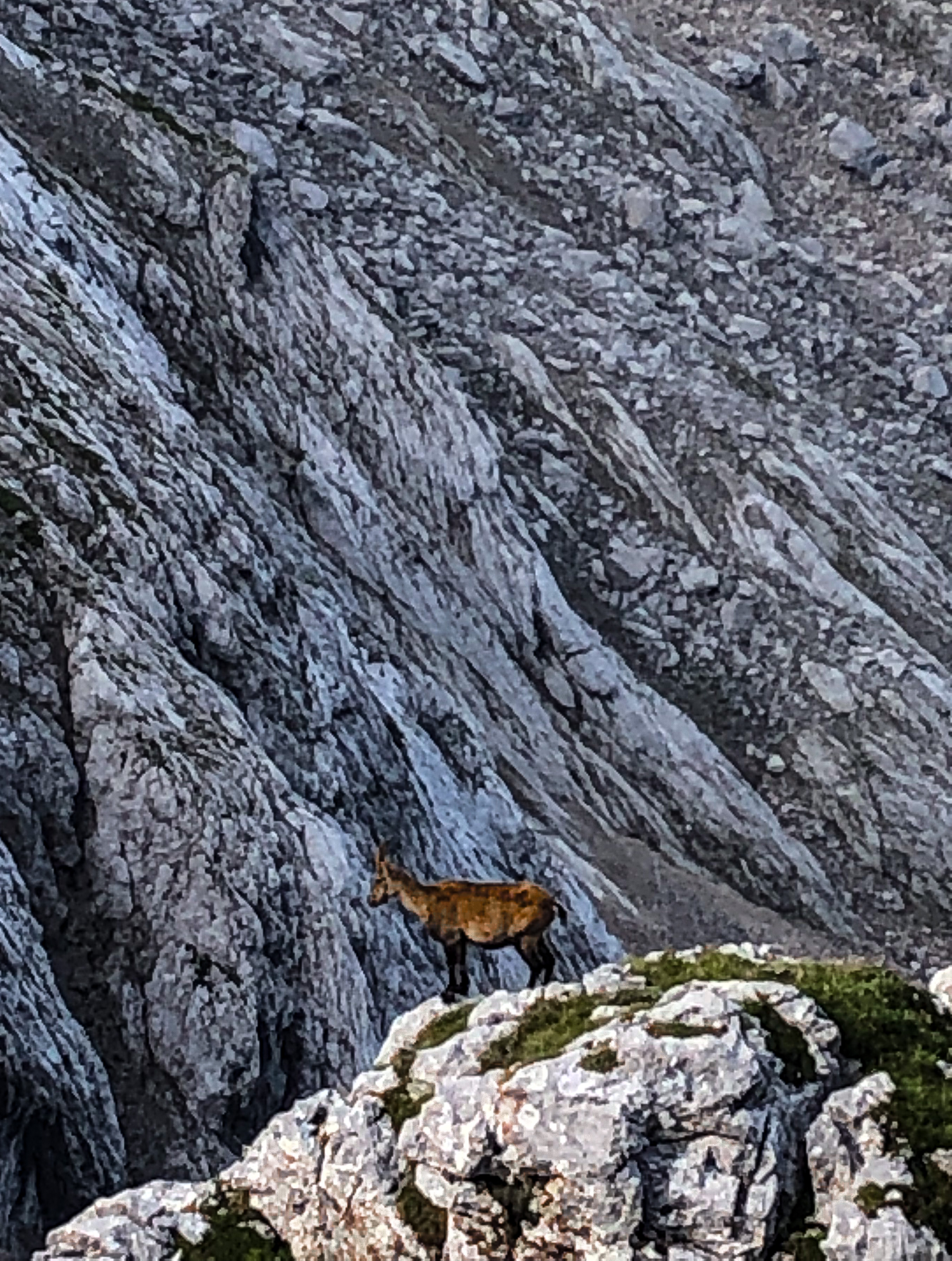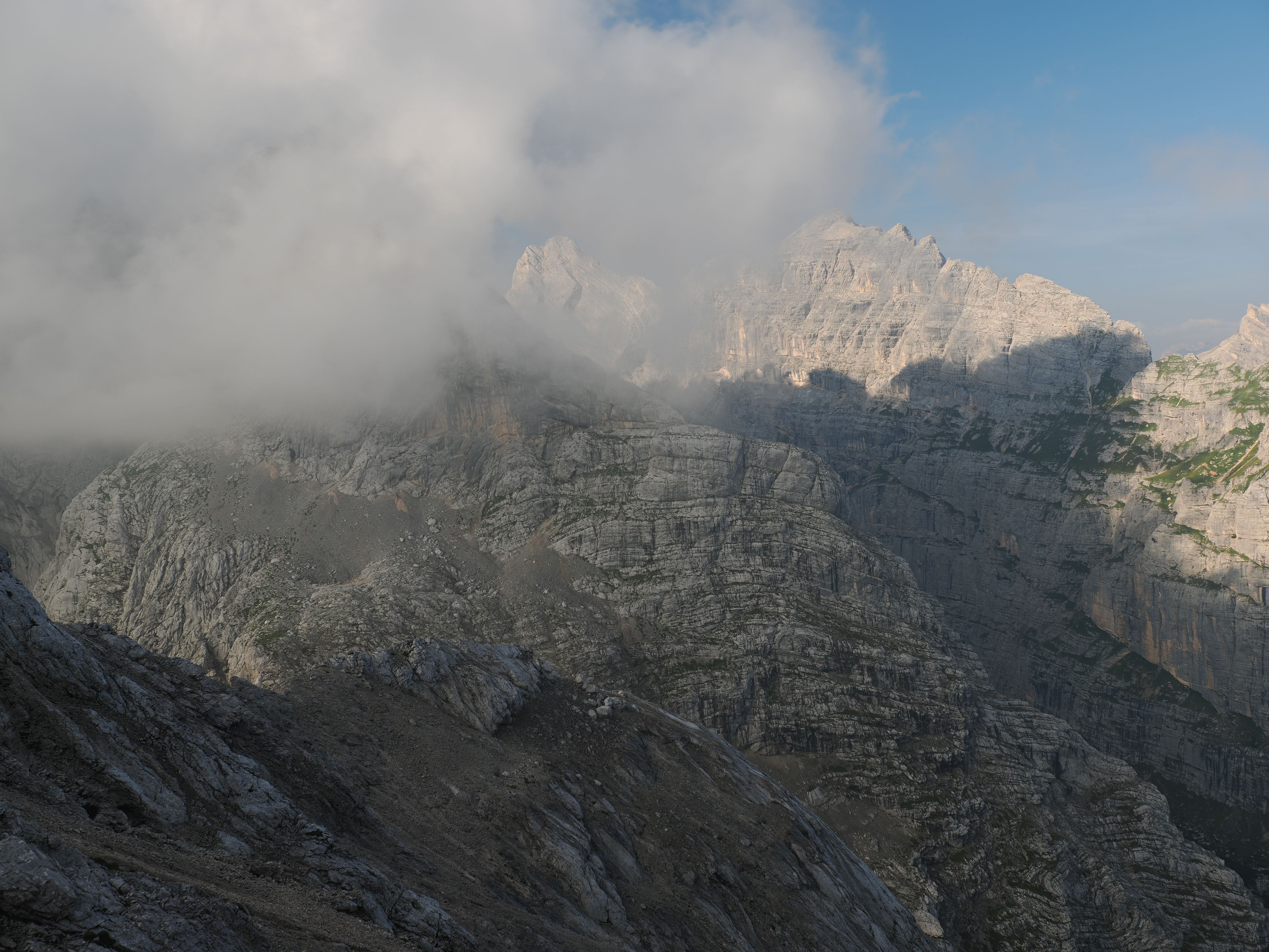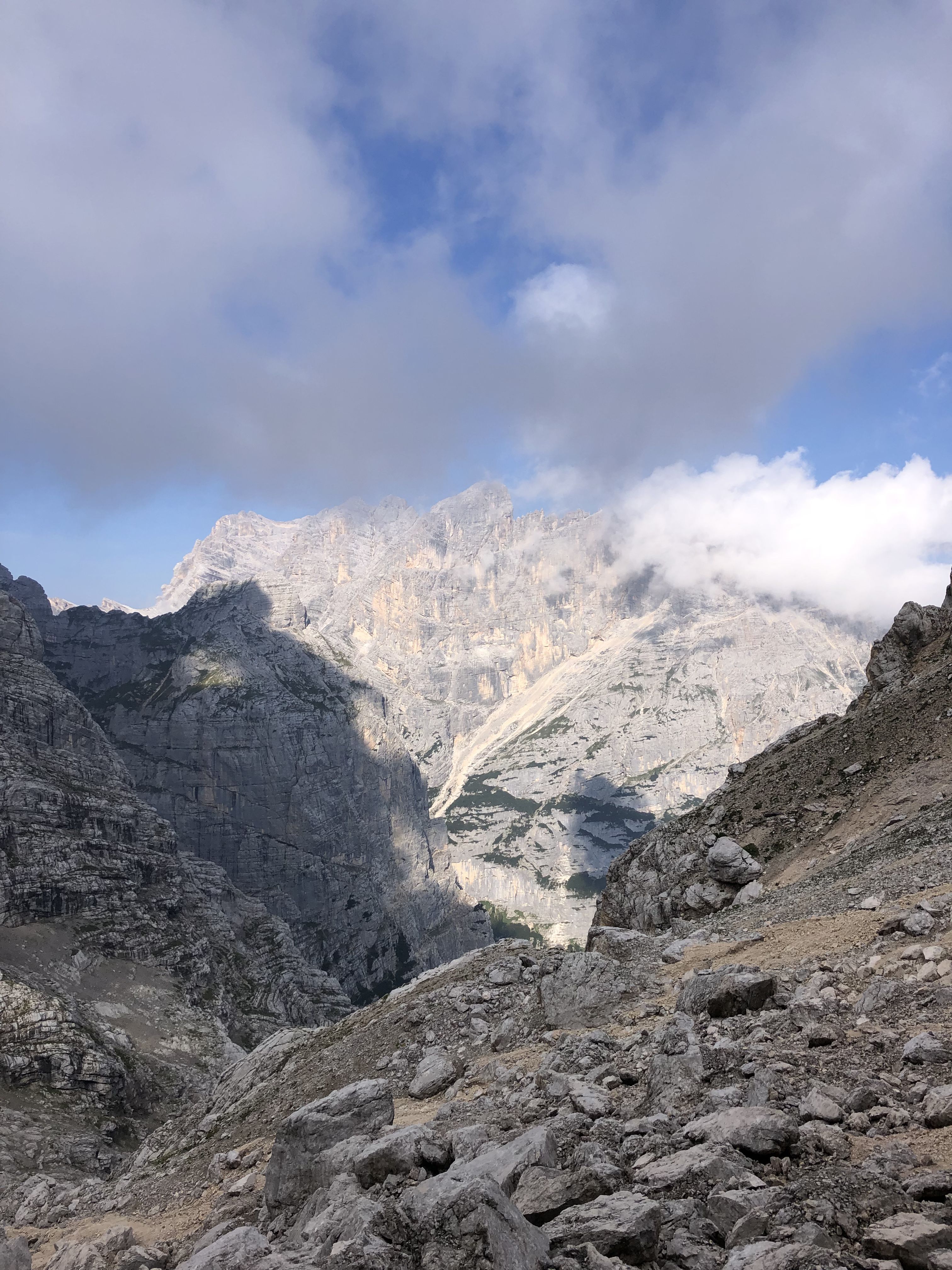 Along the crest of this airy spine, the views opened again and the path became a delightful scramble along the narrow ridge, climbing to 2,600 meters before descending a long switchback and across a face where Claudio found a seep while a chamois watched intently as he collected water. We descended the only small patch of snow we would encounter, hidden deep in the north-facing recess of this huge bowl. The path now wandered through a maze of gigantic boulders and headwalls, then back onto the grassy slopes with the bivacco now in sight. The Bivacco Musatti was a near clone of the Bivacco Tiziano and already had an occupant who, unable to afford lodging in the valley some 1,000 meters below, had hiked up to spend the night. He was a self-described tourist and it seemed, perfectly happy to descend, take in the sights, and return to Musatti at the end of his day. He was on a shoestring budget and this kept it alive and well. We claimed our bunks just as two others arrived, and shortly thereafter, two more, and then two more - the last a desperately romantic young couple. It looked like the bivacco would be packed, but after some discussion, two departed and we were down to 7. This was cramped but tolerable - or so we thought. At lights-out we discovered that the lovers would not be denied, and that one of the other pair was a world-class snorer. His companion, rather than disturbing the bliss of his larger and decidedly moodier buddy, chose instead to entertain himself with videos on his phone - a double-whammy. Then, someone added flatulence, creating the perfect trifecta of sensory abuse. I whimpered quietly, my head buried in my bag. It seemed nothing, including procreation, was taboo in this tiny space. I offered Claudio earplugs but he declined and seemed to fall asleep - how, I did not know...