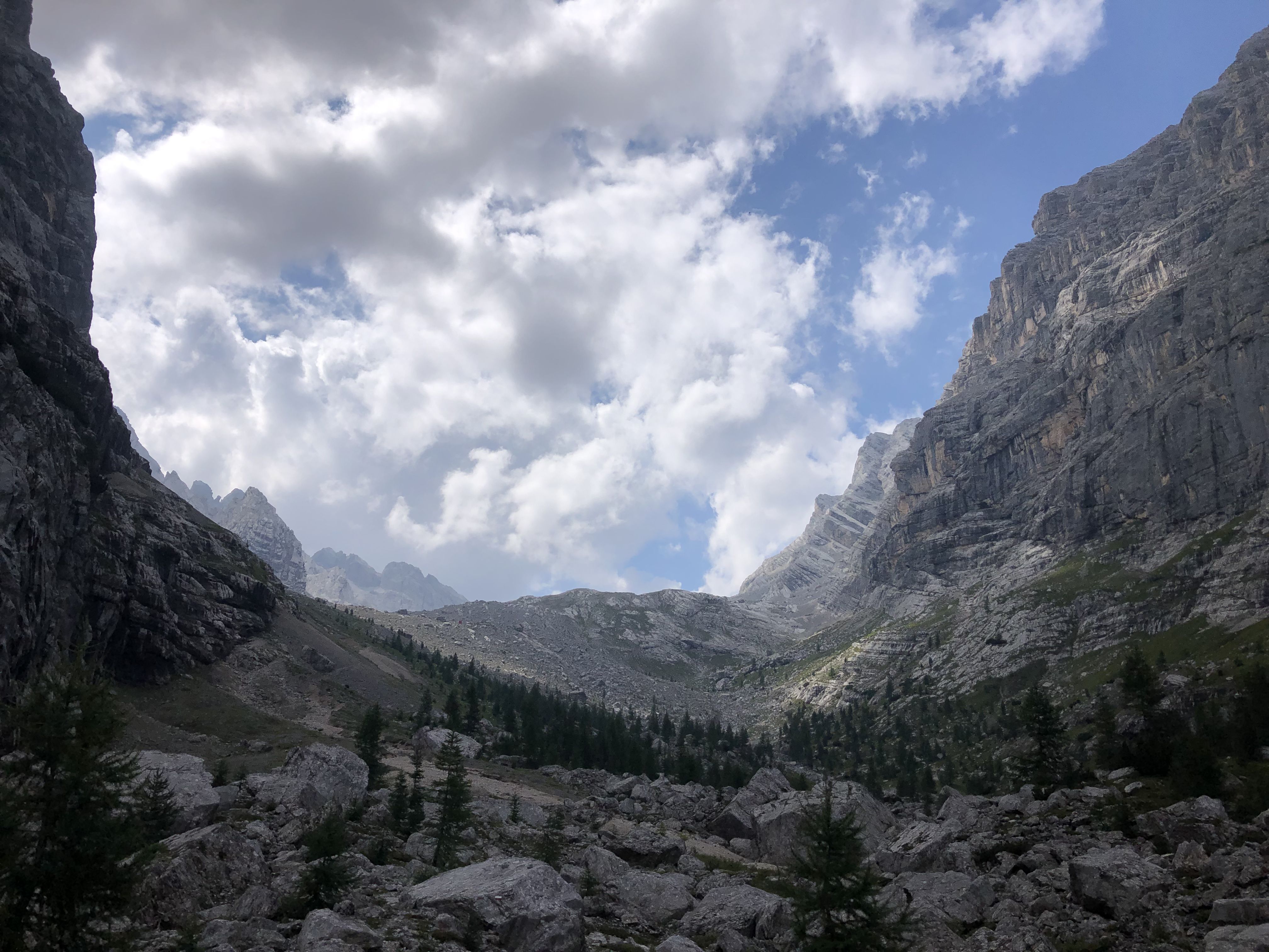 Last night we had discussed the weather. The forecast was for a decent day, but with the standard August disclaimer of afternoon thunderstorms. Our original plan was to walk to Bivacco Voltolina, a long day taking us over two lengthy stretches of high ground. Harboring a lingering distrust of the now-blue skies overhead and eager to avoid being burned once again, we elected instead to do a shorter day to Bivacco Musatti and finish the high ground earlier. We set out along the grassy path into Val Longa which had been filled with camoscio the evening before. The distinct path in the grass soon became rocky and I followed cairns up into the basin before becoming suspicious: there was no obvious exit ahead, only the 2,800 meter summit of the Pale de Meduci. My GPS confirmed that we had wandered too far up the valley. With some red-green color-blindness, I had missed the turn in the path where it met the rock. After a bit of thrashing back across the hillside, we were back on the steep path of the Strada Sanmarchi that ascended the now-obvious break to the ridge above.