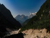 Our bunks were among the dozen or so in the "Gazebo", a temporary overflow tent. The toilet was in the main building. Throughout the night, many tried but none succeeded in silencing the sliding door. Every passage, whether in or out, regardless of stealth, created a metallic screech, quickly punctuated with a quietly-muttered apology, profanity or a simple, resigned sigh. For those without earplugs and pee-bottles, morning took its sweet time arriving. Some preferred to doze in the main building or huddle in their bag on the deck until reveille rather than deal with the door. Unimpressed, but well-fed and with a long day ahead, we made for the sunlit slopes a few minutes away. The river was 1,300 meters below and the Val Giralba so extensive that it needed two names. We reached the river just at lunch time. It was hot and there were no shady tables at the little restaurant that lay at the start of our afternoon climb. I thought of beer but settled on two liters of water instead. Here, Claudio introduced me to another delight, the Club Sandwich, Italian style, more evidence that there is no such thing as bad food in Italy. Cleaning up the crumbs and slipping into our packs, we shuffled up the pistes.