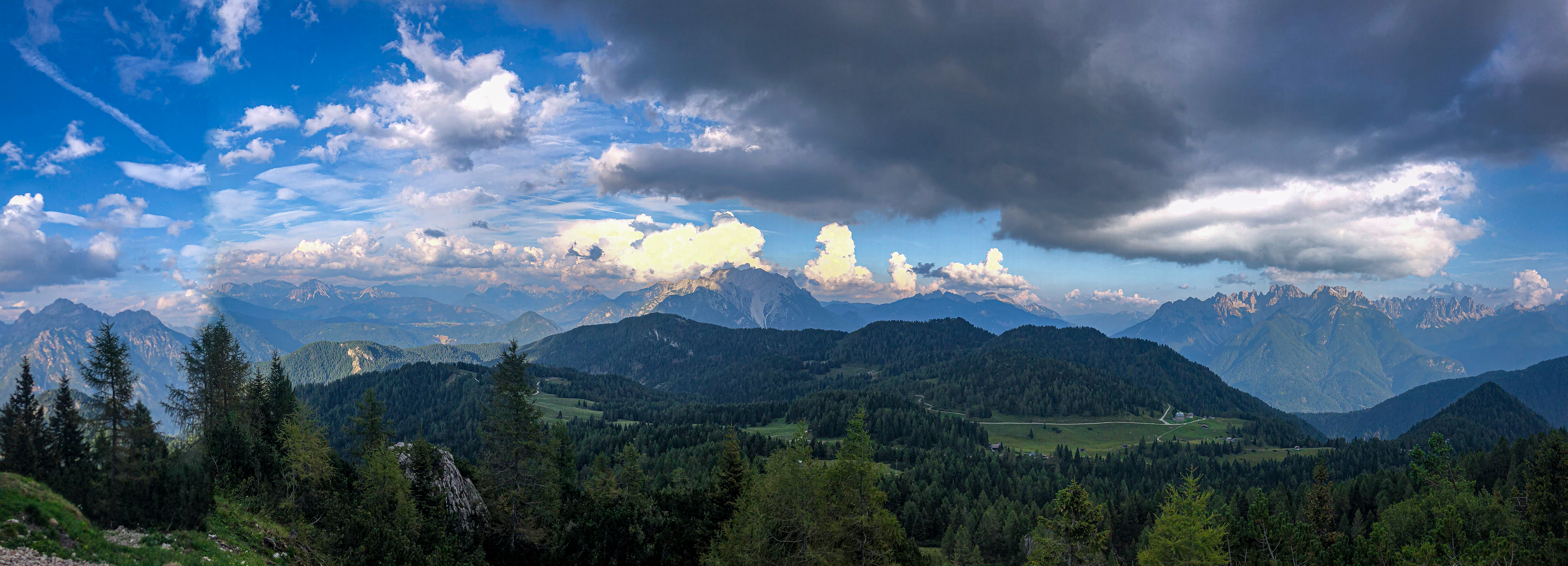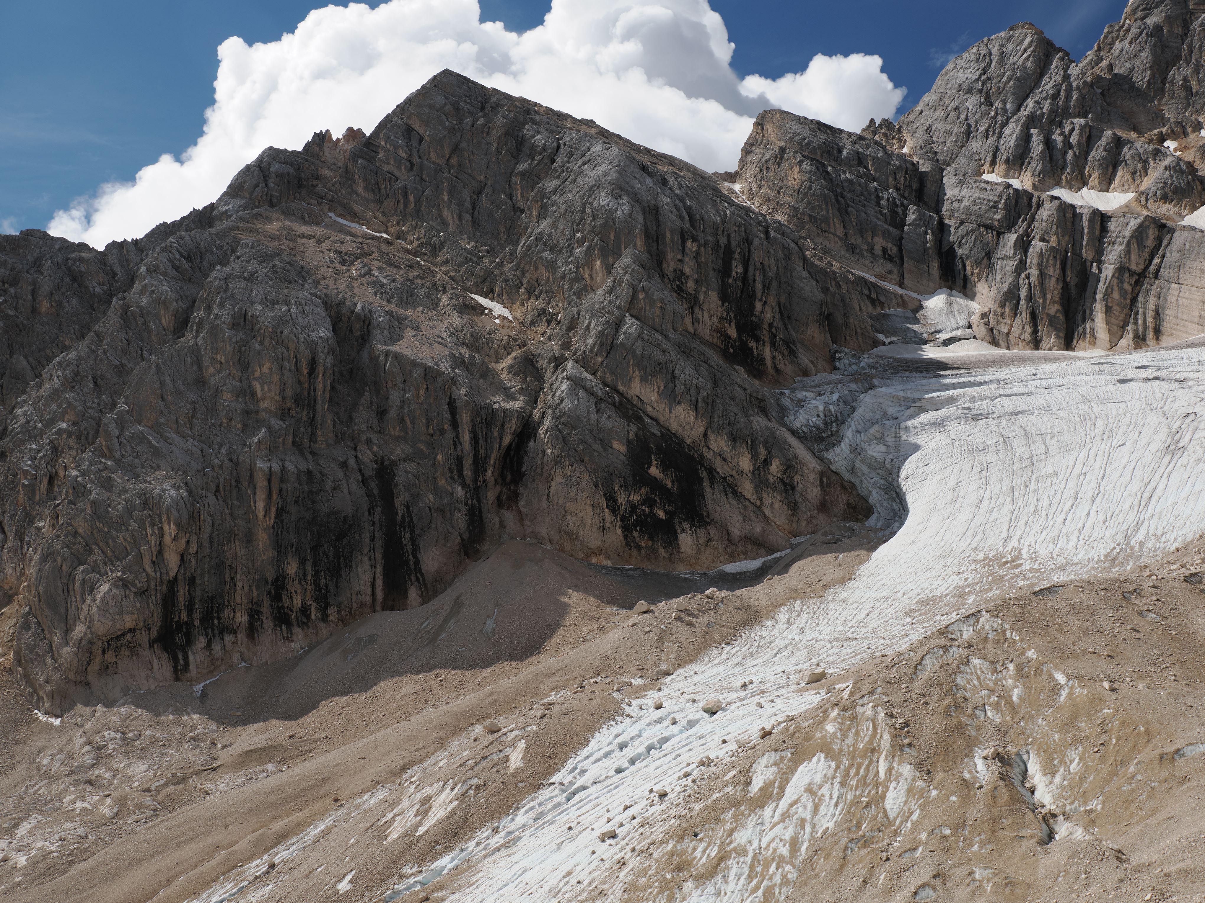 After an hour of deceptively pleasant walking , we began our ascent in earnest, climbing a mixture of ever-steepening scree gullies, buttresses and grassy slopes. Eventually, we reached the first cable in a broad, steep, dirt-filled slot. I cursed and grunted to the finish, then turned to watch the more elegant efforts of my younger friend. Ahead the path was reduced to small depressions leading across a 40° slope of turf, its convex nature only sharpening the airiness. Choking my uphill pole midway and placing the front half of each boot in its respective pocket, I tippy-toed across the first of the many shits and giggles this path would provide. As the final one of six Alta Vias, I found the minimal presence of 'equipped passages' appropriate for the extraordinary character and wildness of Marmarole and the tiny footholds confirmation of its seldom-visited nature. There are easier ways to do the Alta Via 5 and still be able to say you did it. This passage however was the real deal. We crossed a large bowl and made our way up more cables and ladders, reaching Forcella Giau de la Tana, our high point of 2,650 meters. The storm clouds, which had been threatening for the past hour, broke over us. We had just enough time to get our bearings and begin the descent of the 300 meters of scree slope below before the view disappeared.
