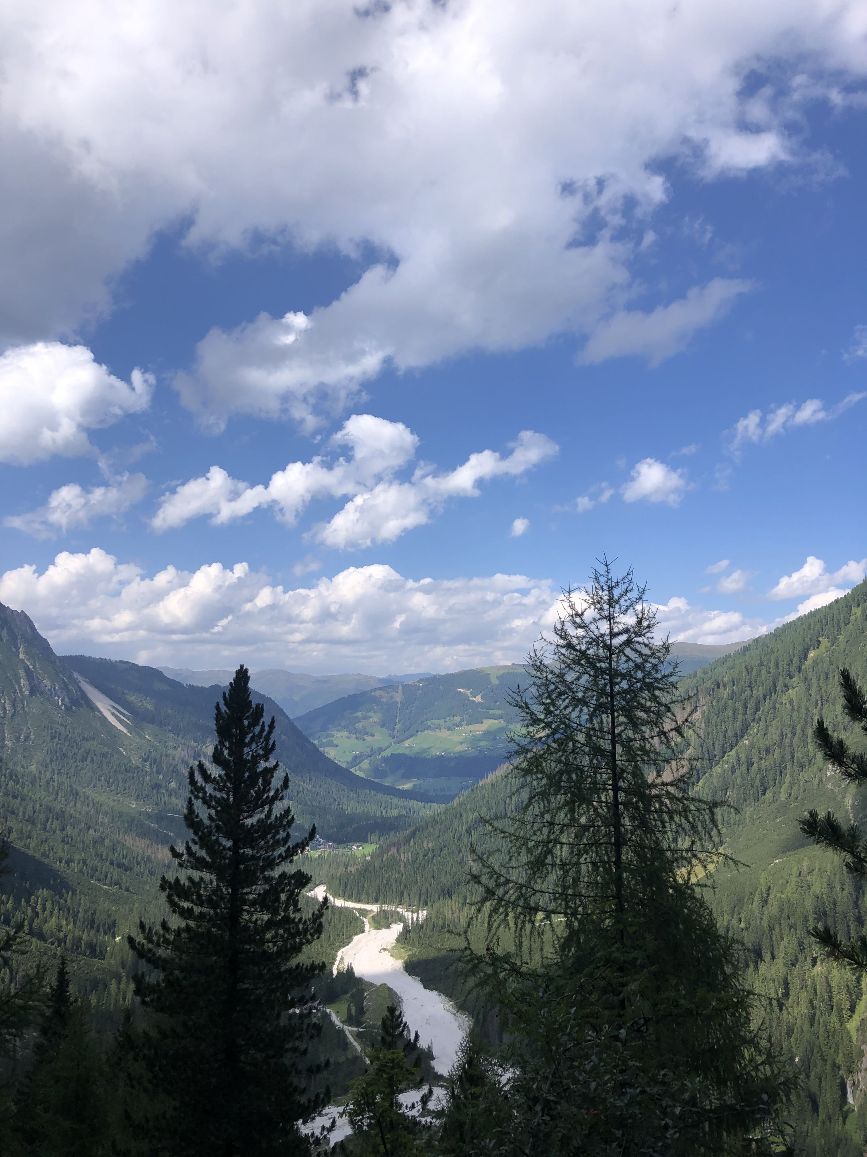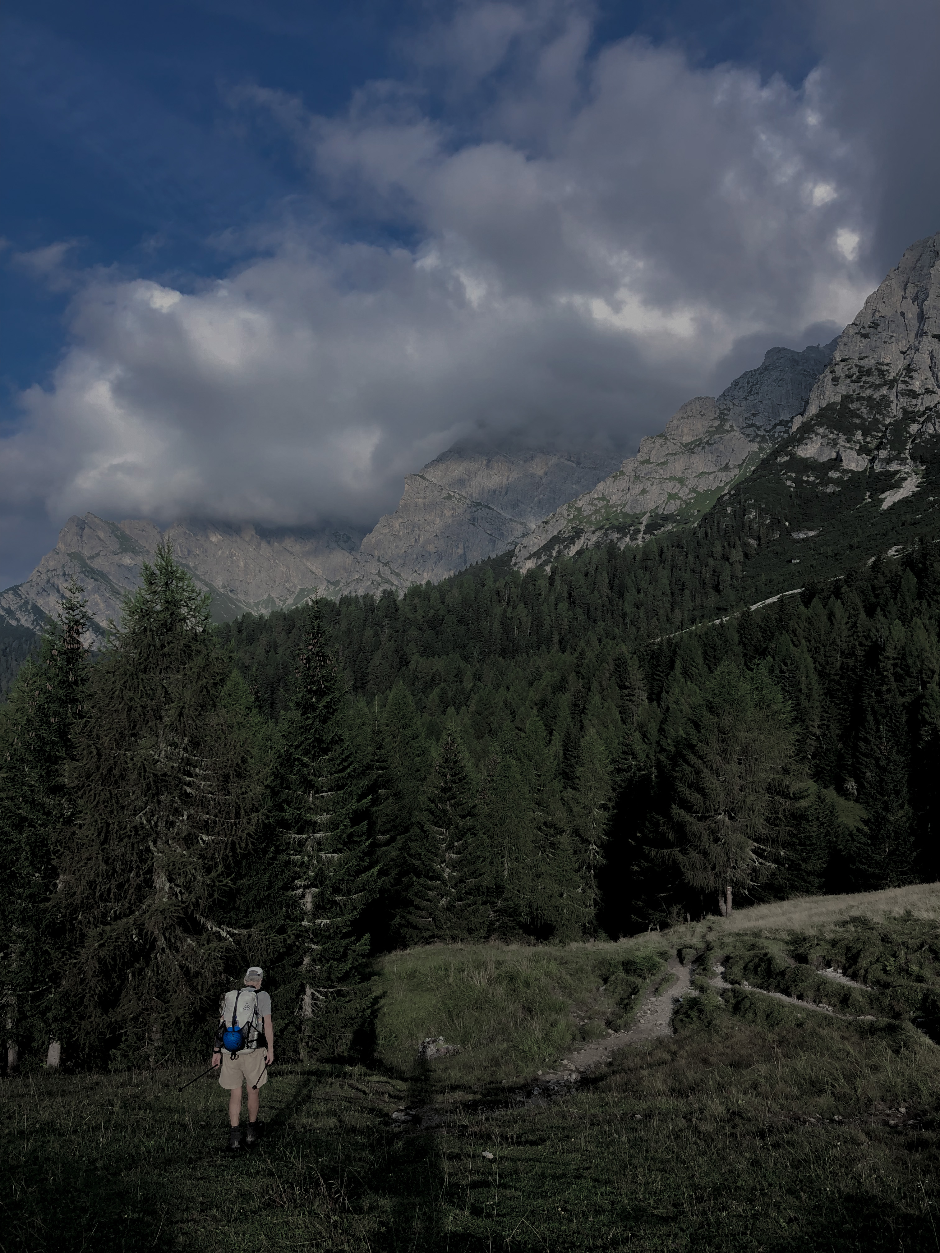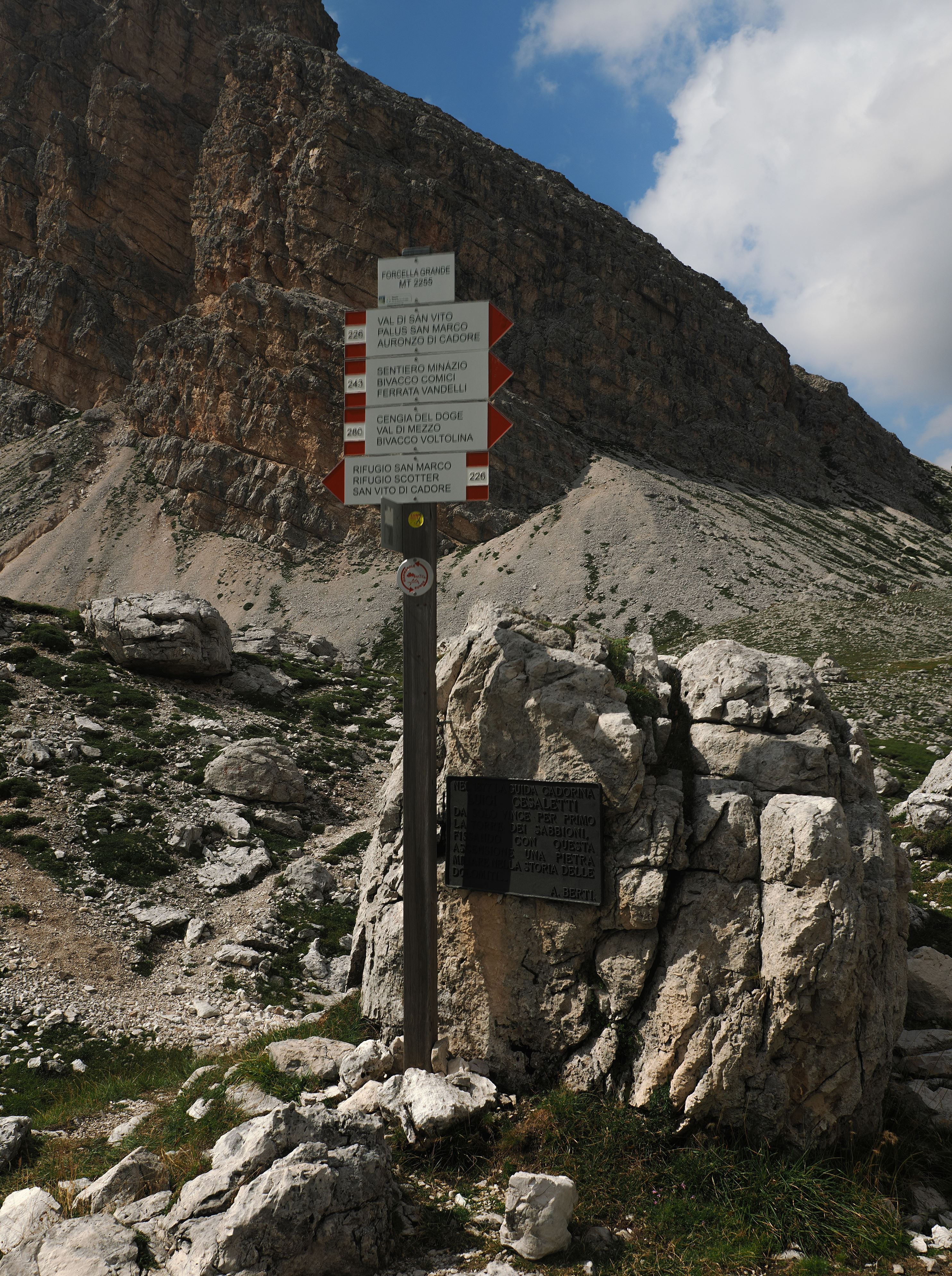 I 'll meet you at 8:30 Claudio emailed, "Where are you?" I had two addresses for the hotel where I'd been staying in Vittorio Veneto since completing the Alta Via 6 a few days earlier; one on the business card and one the gate. Taking no chances, I gave him both. This little part -actually Serravalle - of the bigger city, was on the Venetian Plain , tucked up against the very southern end of the mountains - a scant 100 meters above sea-level and very hot. Nearly everything closed during the heat of midday, but the brave, or unwary could still be found wandering the streets, looking for ice cream. I was almost certain that Italians possessed a gene for heat tolerance that Scandinavians lacked. My friend arrived at precisely 8:30 the next morning just as I was checking out. I had become quite attached to my temporary home and was encouraged by my hosts to return during the fall months when it was cool and quiet. Claudio and I would follow SS51 up the valleys of the Piave and Boite rivers to Dobbiaco, then east up Val Pusteria to the start of the Alta Via 5. It was a Sunday and this main artery into the mountains was busy. Claudio is a superb mountain companion - young, strong and competent - and also a great tour guide. I peppered him with questions along the route. Fueled by cappucinos and chased with rock-and-roll, the kilometers rolled by and we were soon at the village of Moso and the beginning of the walk. As we started up the path we thought about our missing companion, Claudio's daughter Anna who, with her now-retired father, had just burned through her vacation on the GR10 . They had completed nearly 1,000 kilometers from sea to sea along the northern flank of the Pyrenees in less than a month earning her the nickname "La Fusée" . Were it not for her work, we would be chasing her now... We would have to make do with each other. See the Alta Via 4 for more about "The Rocket".