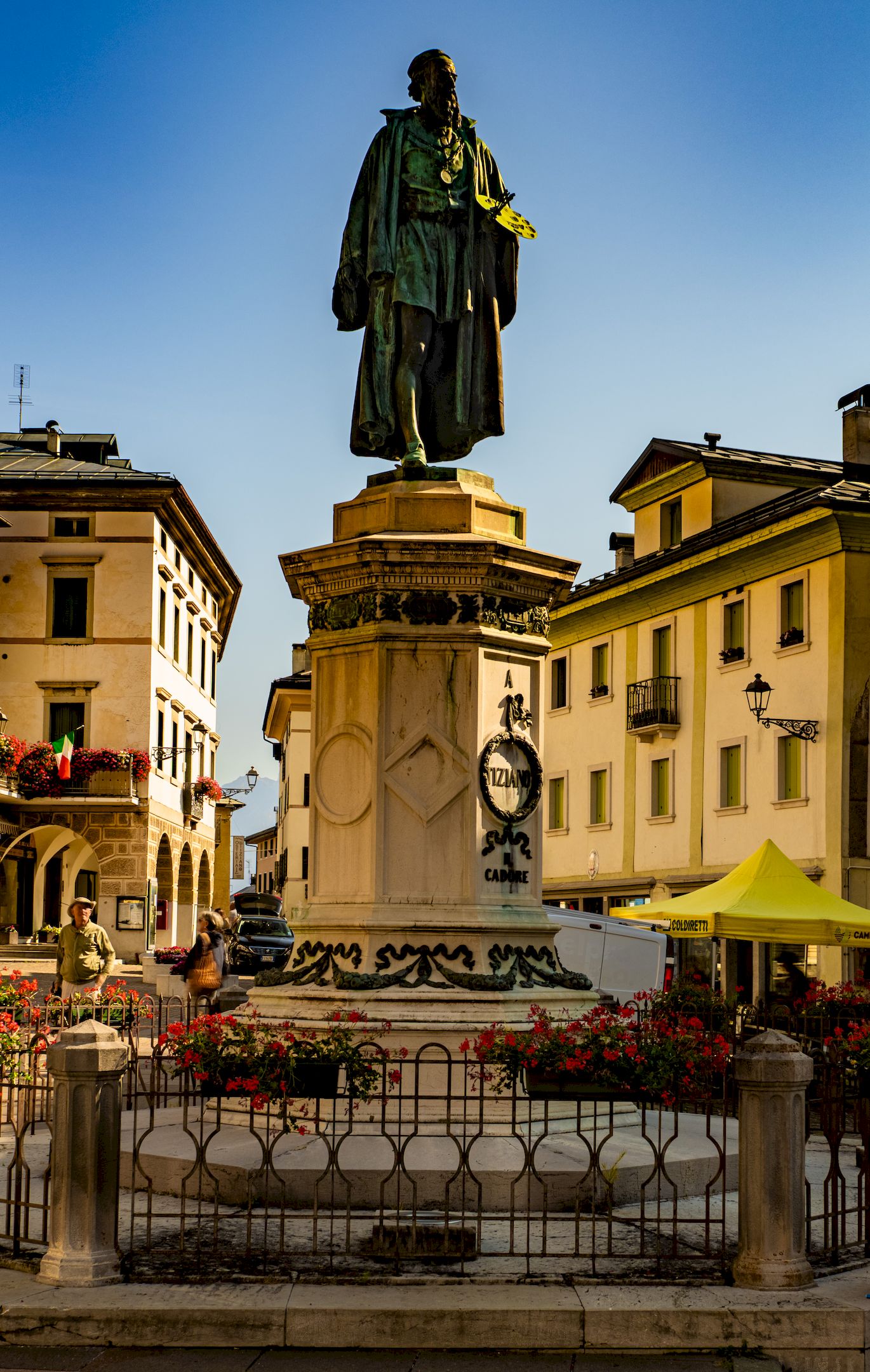 We said goodbye to Livio and began our walk down to Pieve di Cadore. After only a short way down the road, Claudio turned onto a trail that wandered down through the beech forest. Here, he said was where he, and his dog Book, would make forays from Pozzale to Antelao. He seemed deep in memories, so we walked these last few kilometers in silence, enjoying our thoughts in the morning sun. Soon, we could hear the traffic below and then were in Pozzale. We passed the summer home of his youth, now seemingly vacant, and found a bar where we had cappuchinos and I, always hungry, a cornetto. Pieve di Cadore was only a few minutes down the road and along the way, we met his brother-in-law Roberto. I caught only a few words as they chatted but understood that he was the widower of Claudio's sister and remained unmarried. A few minutes later, we were at the tourist office, signing the record book and receiving our pins for the Alta Via di Tiziano . In the town center is a statue of Tiziano Vecellio, aka Titian, with easel and brush in hand. This was the home of this remarkable Venetian Renaissance painter, considered the greatest 16th-century master of color. That the Alta Via 5 would be named after him seemed fitting. We caught the first bus of the three that would take us back to the van at Moso. In Cortina, during our wait for the second, Claudio described skiing on the pistes of Tofane, directy across the valley. It was steep terrain and, he hinted, could be a challenge when icy. It seemed comparable to the skiing at my home in Jackson Hole, and I wondered if the notorious glamour factor of Cortina would dampen my enthusiasm. I had seen people walking the streets, flaunting sunglasses worth more than my pickup truck: transcending the caiman leather cowboy boots and diamond-studded belt buckles of my home-town entitled. He remarked that there was a time and place for everything, but that Cortina was no longer for him either.