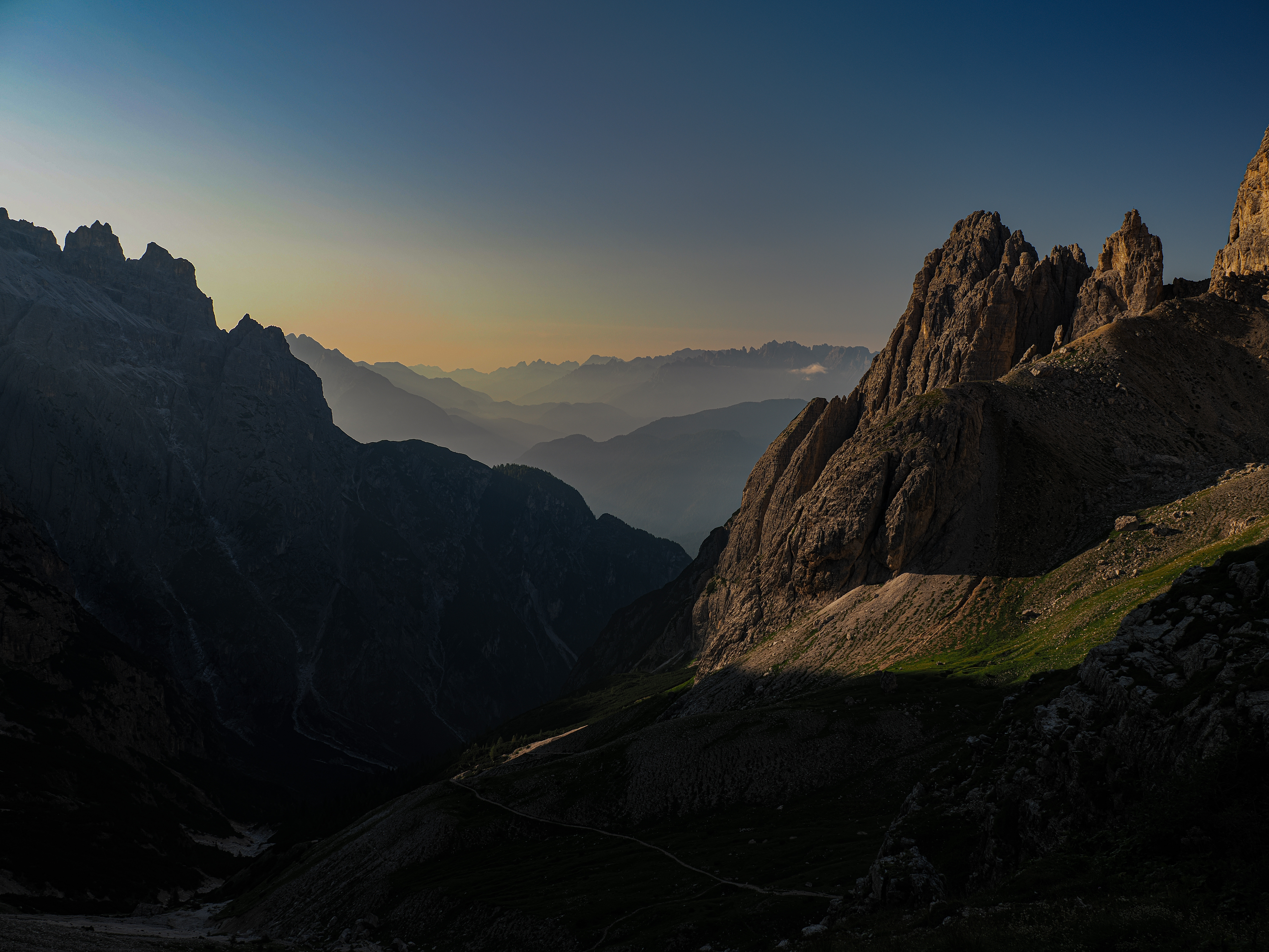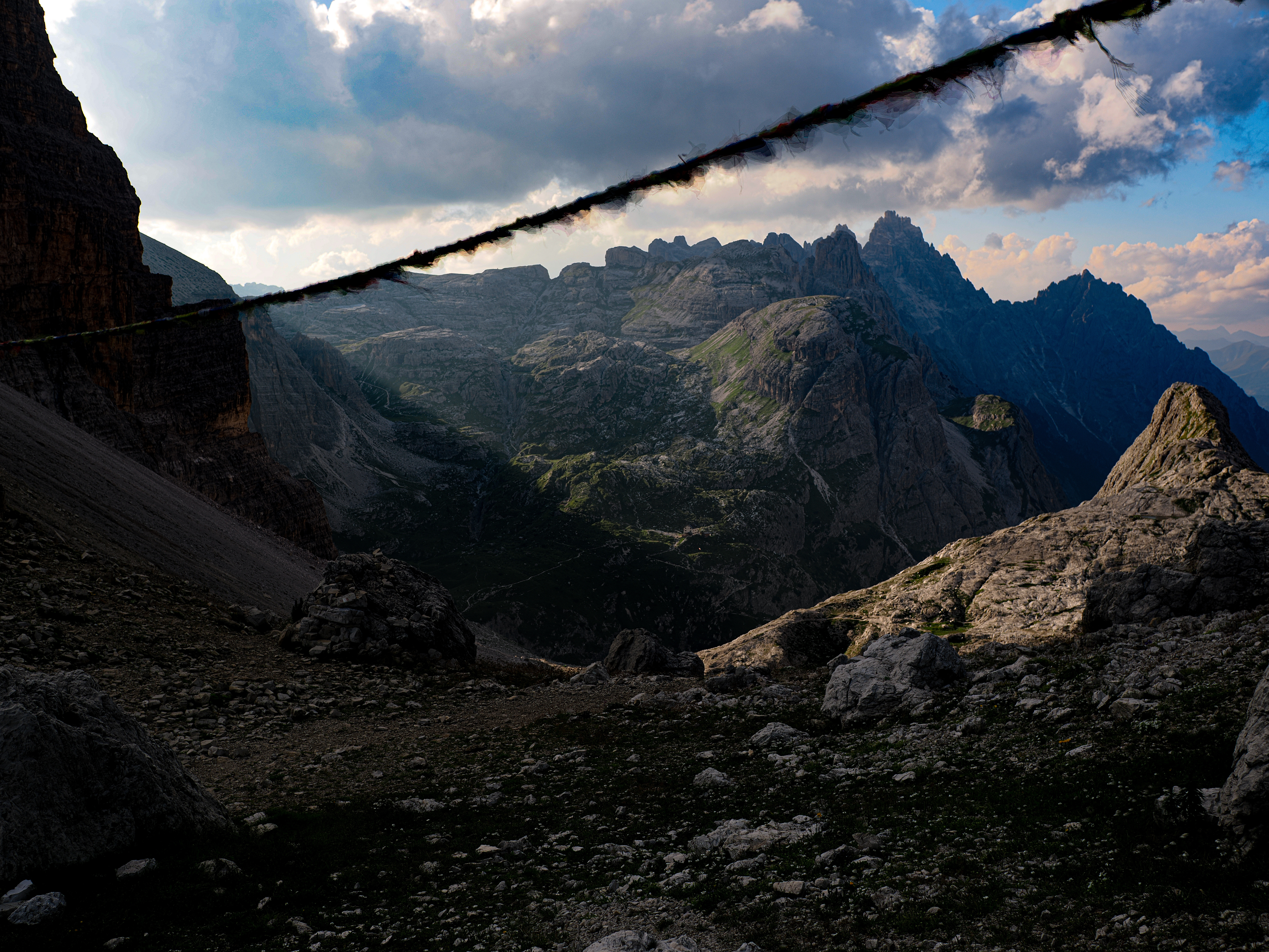 In less than an hour we had left the crowds behind, and, being mid-afternoon, most of the walkers were headed the other way. Many of the Alta Via's begin with this modest, yet tantalyzing approach: up a pleasant valley, or past a pretty lake before an ascent that leaves you breathless with the spectacle of the Dolomites. Ours was Val Fiscalina, which soon climbed steeply up the eastern flanks of the Tre Scarperi until meeting the walls of Croda dei Toni which towered at the head of the valley. We took a quick break at Rifugio Comici before finishing our 1,300 meter climb to Forcella Giralba which separates the Val Pusteria, who's waters flow west into the Adige, from the Val D'Ansiei, which drains east into the Piave. These rivers bound the central section of the Dolomites, home to five of the six great Alta Vias. It speaks to the marvelous complexity of these mountains that the neighboring Alta Via 4 was but a few kilometers to the west and though sharing sides of the same mountain (Tre Scarperi), we were looking across a completely different landscape. Here the prayer flags were fluttering in the last rays of the afternoon sun. We marveled at the surroundings: the immense Val Giralba that marked tomorrow's descent to the river below and the expanse of mountains beyond. In the shadows, only a little way below, was Rifugio Carducci and the end of our day.