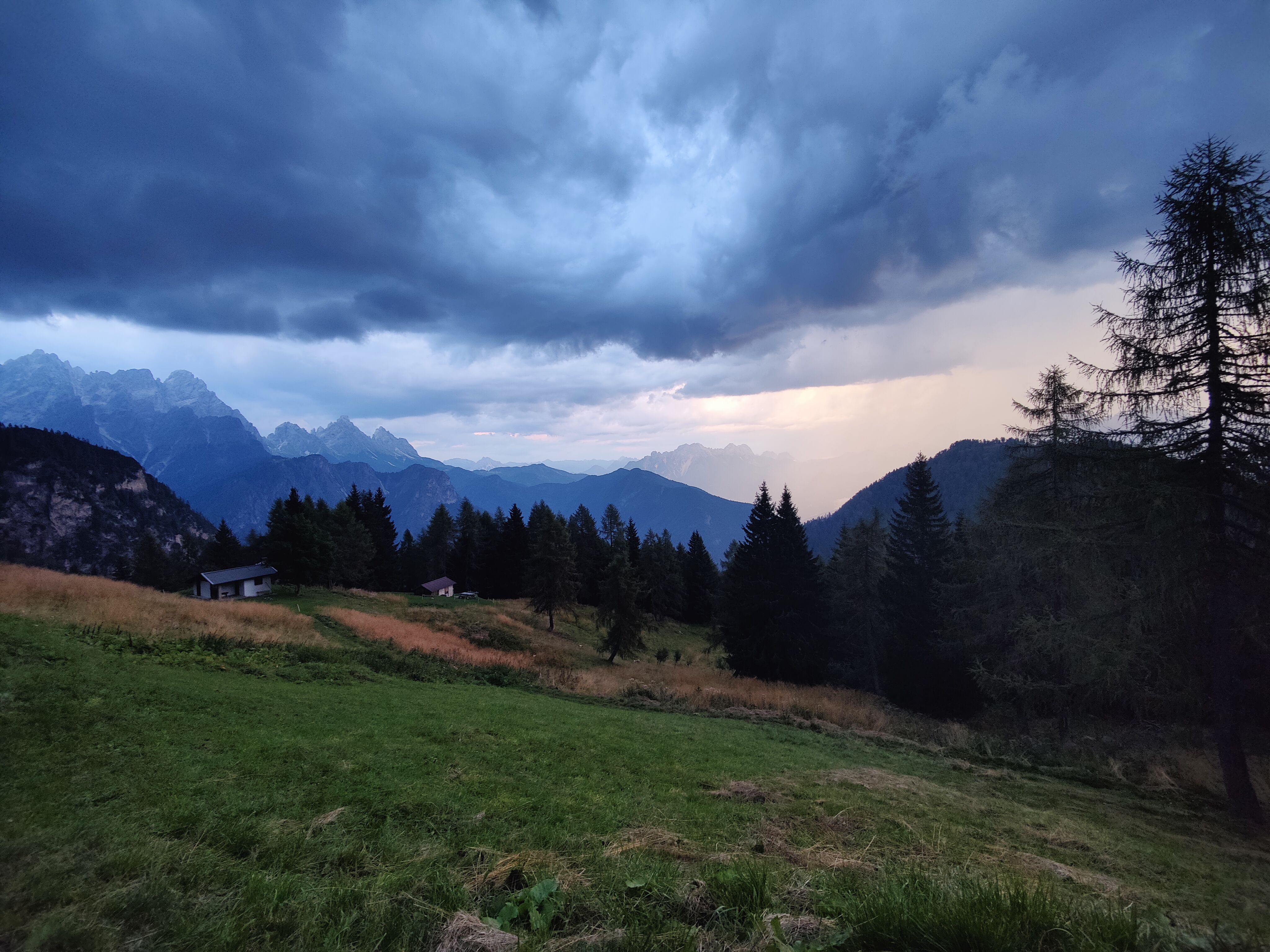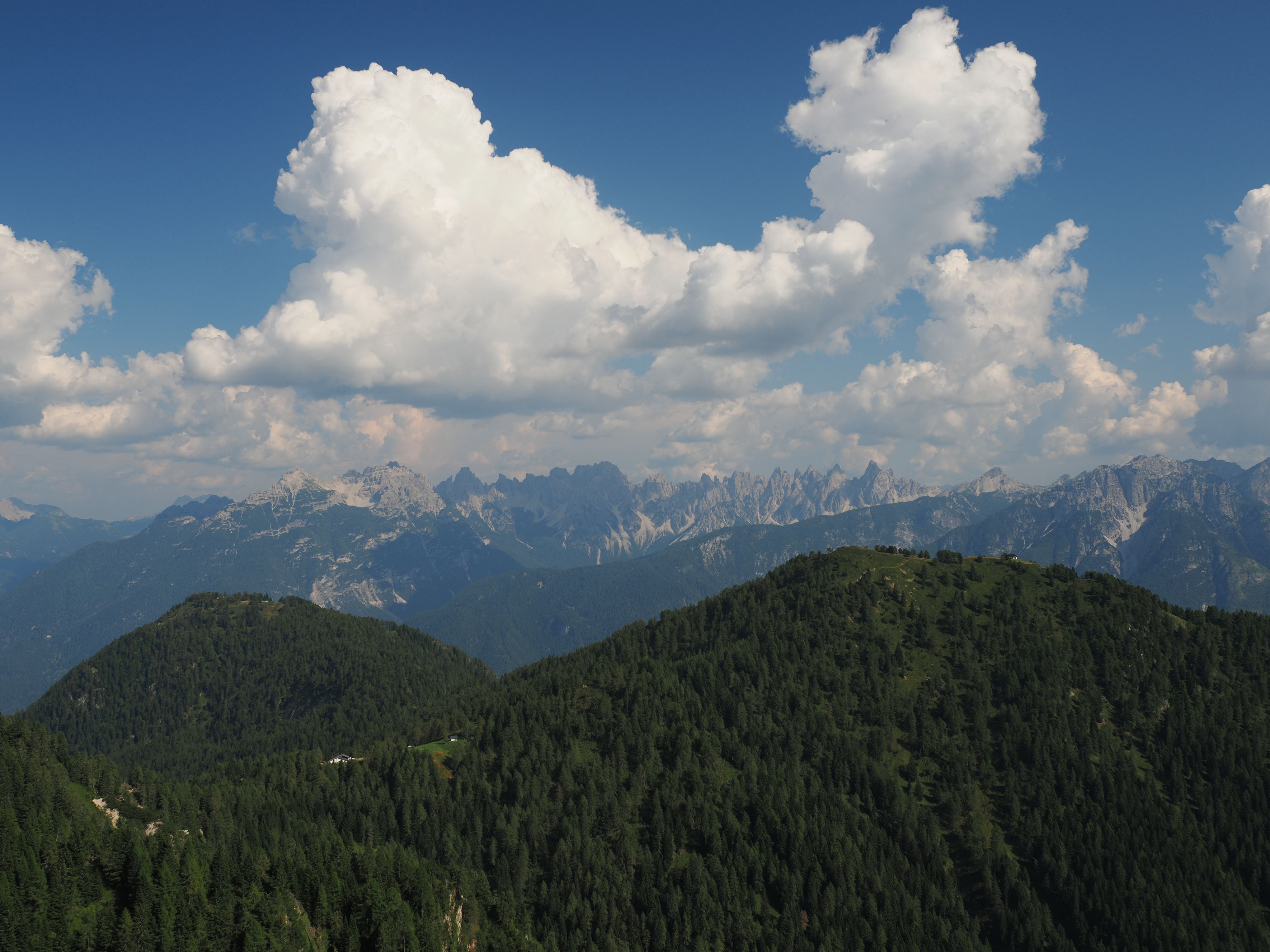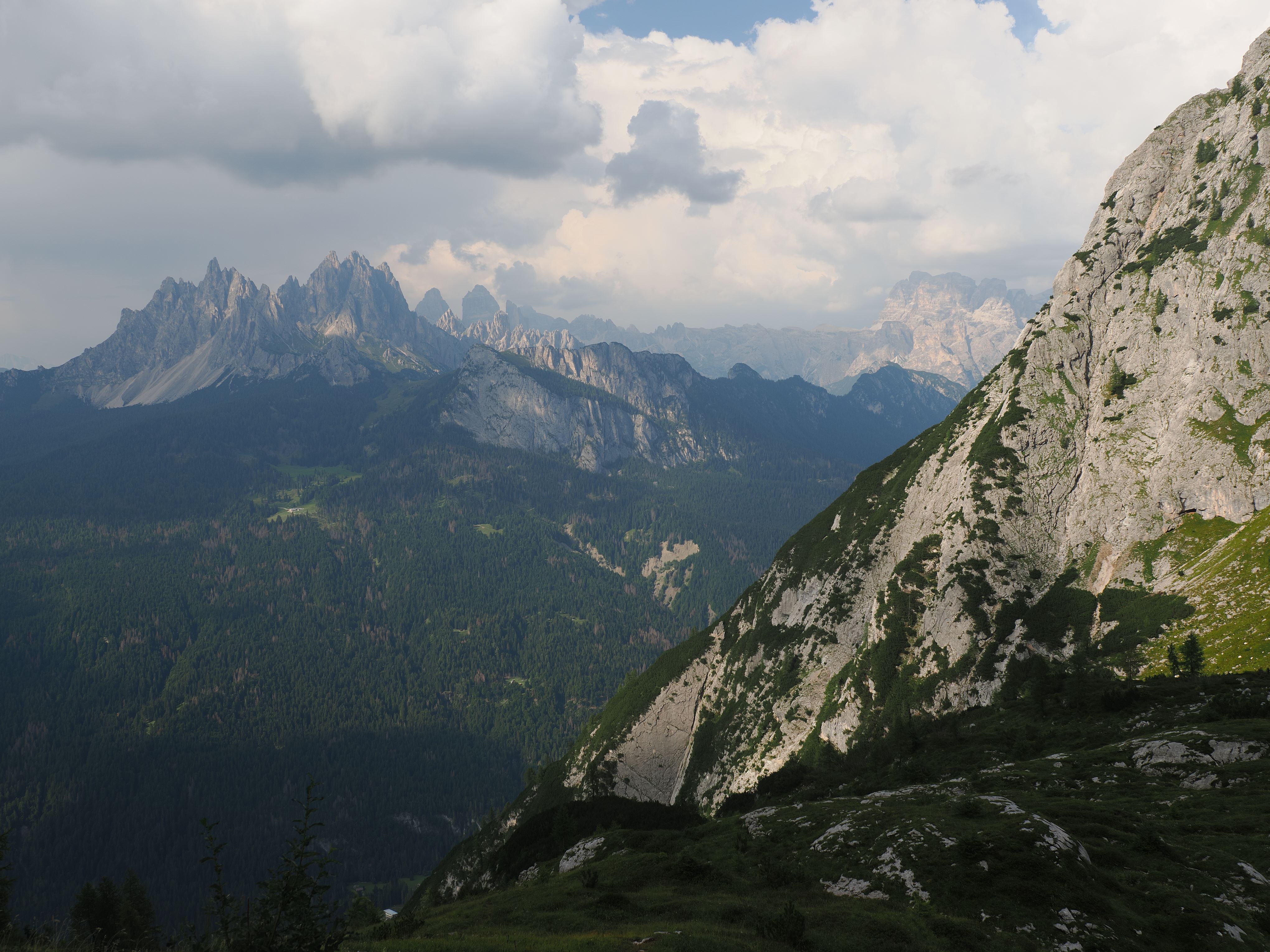 When in doubt, have some ice cream. At the top of the little ski area was a rifugio and a sweeping view to the north. There was also ice cream and coke. With my blood glucose back to its brain-buzzing level, we wandered along wooded hillsides and forest roads, forsaking the standard route in the valley below for this loftier alternative. Claudio had made a good choice for we wandered in solitude for several kilometers. Eventually we reached a crest and a series of large meadows with Monte Ciarido above, the first in the long, arcing chain of peaks of Marmarole (which we had glimpsed from Val Giralba). As we walked the last few kilometers to the rifugio, my friend told me of the visits he had made to these meadows, the picnics and family gatherings, and I understood why we had come this way. We finished our 1,100 meters to Rifugio Ciaréido and sat down for a beer. To the southeast lay Monte Cridola and off its shoulder, on the distant skyline, the phalanx of towers known as Spalti de Torro . With a little imagination I thought I could make out the location of Rifugio Tita Barba, my fourth stop along the AV6 just two weeks before. There wasn't enough water for the showers, so we freshened-up at the sink and sat down for another beer in the dining room to wait for dinner.