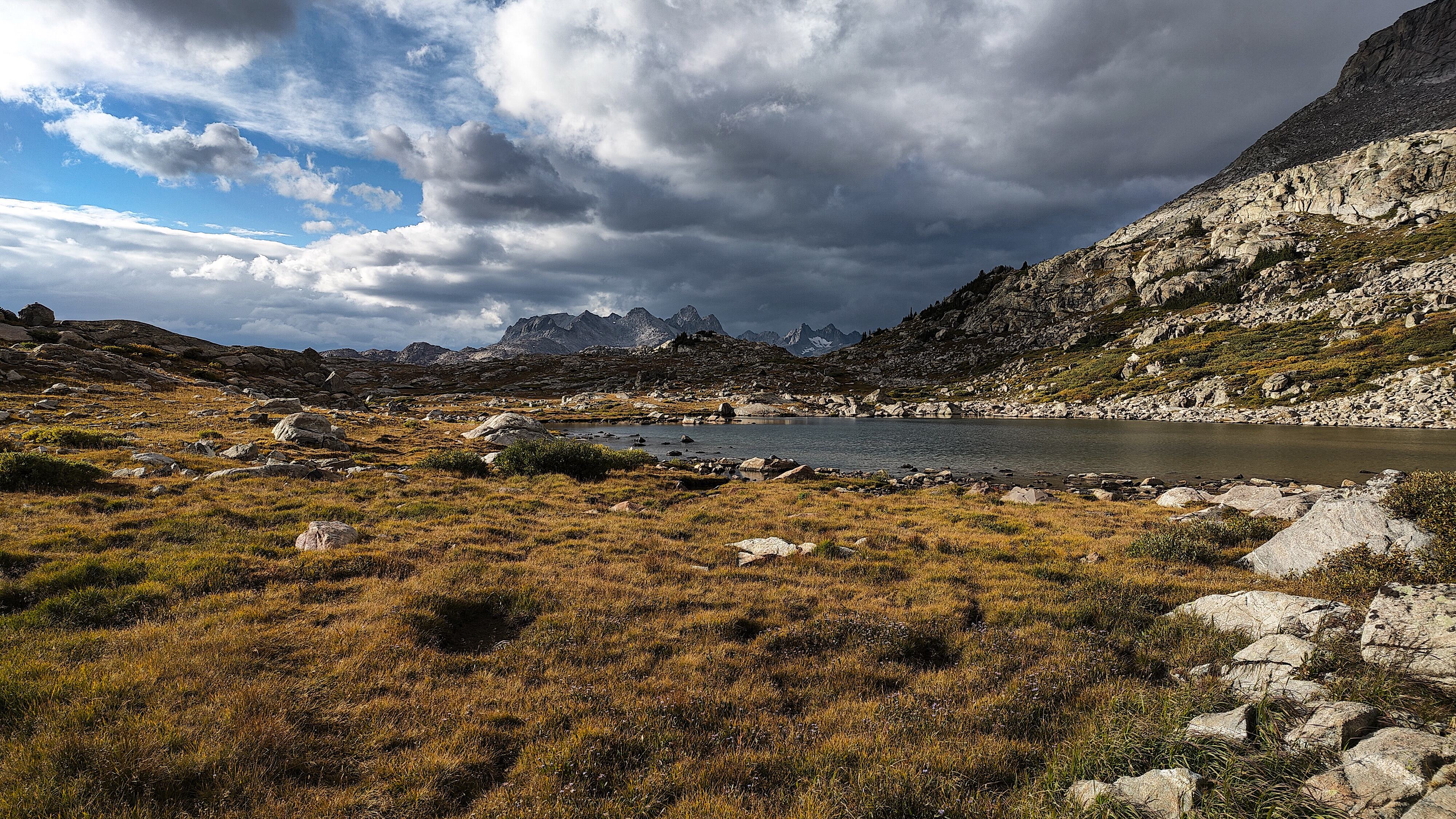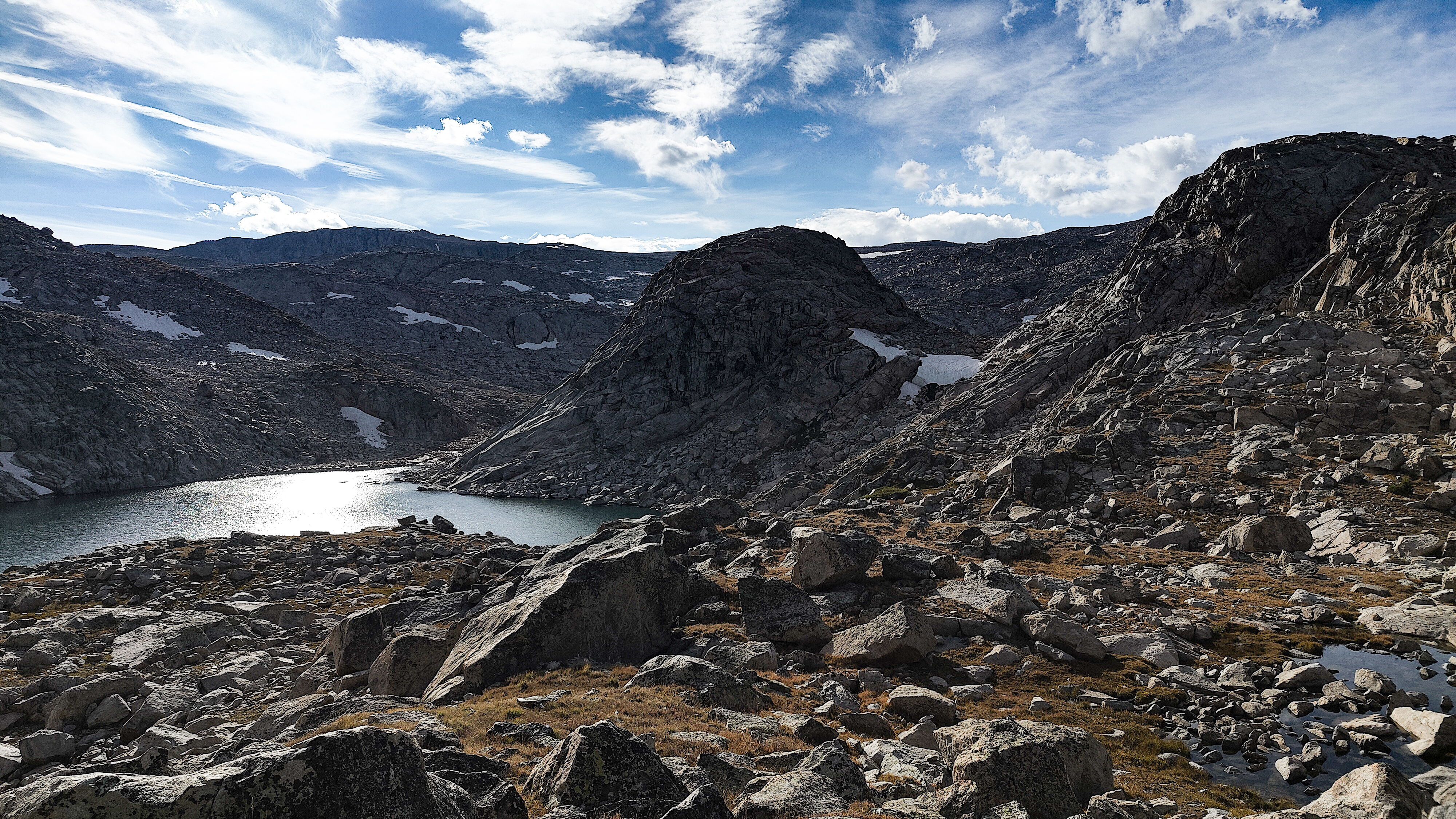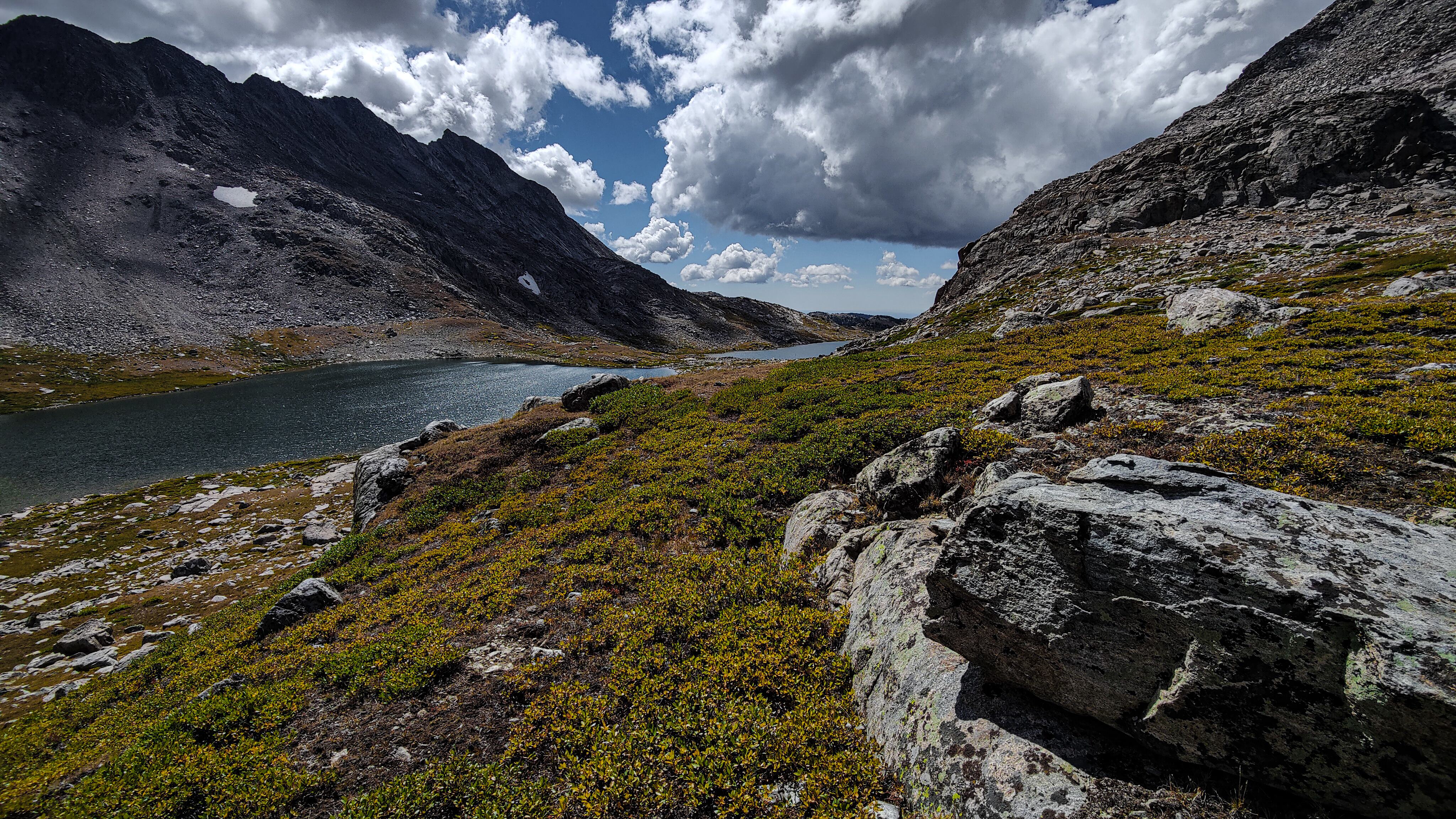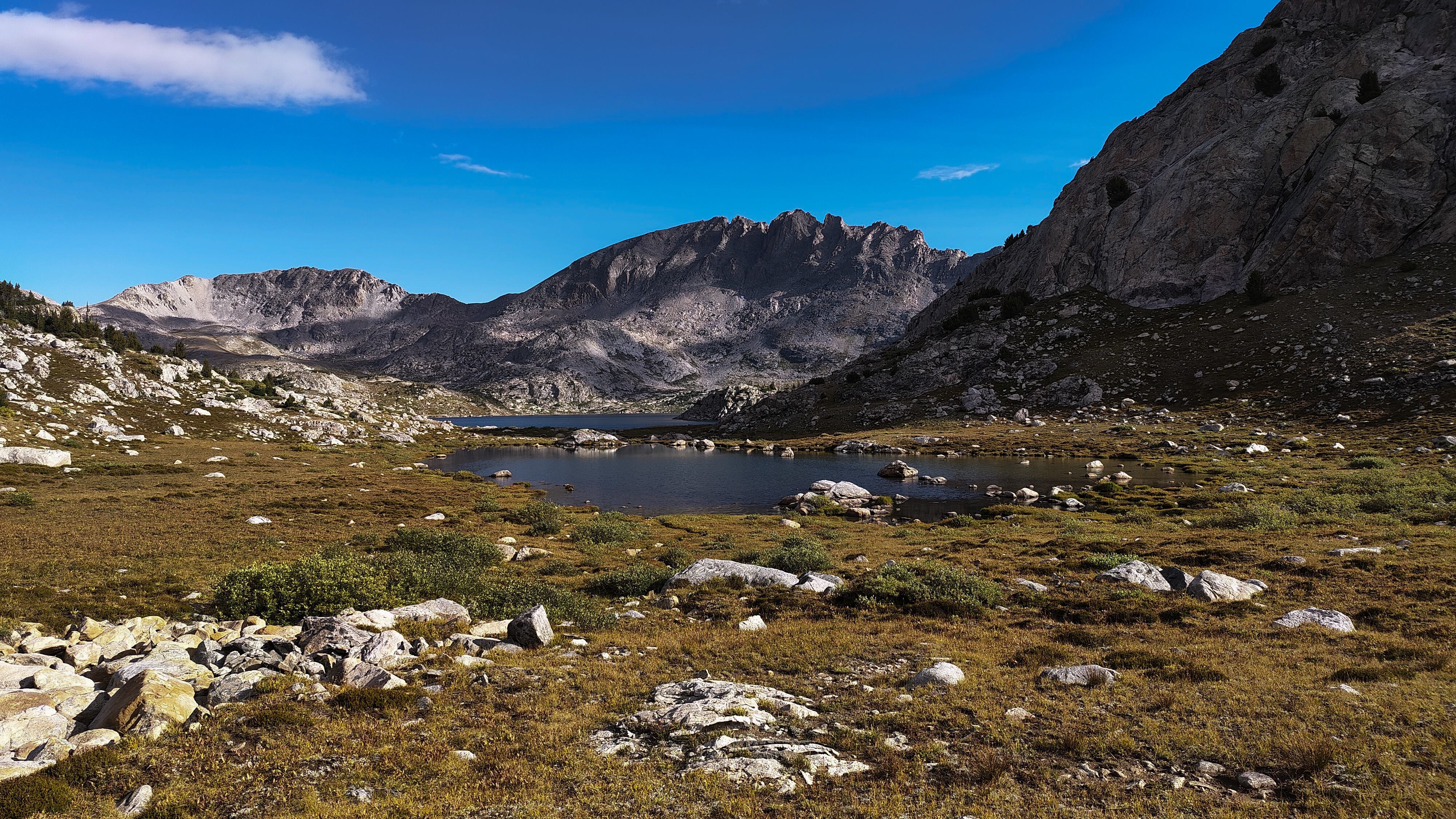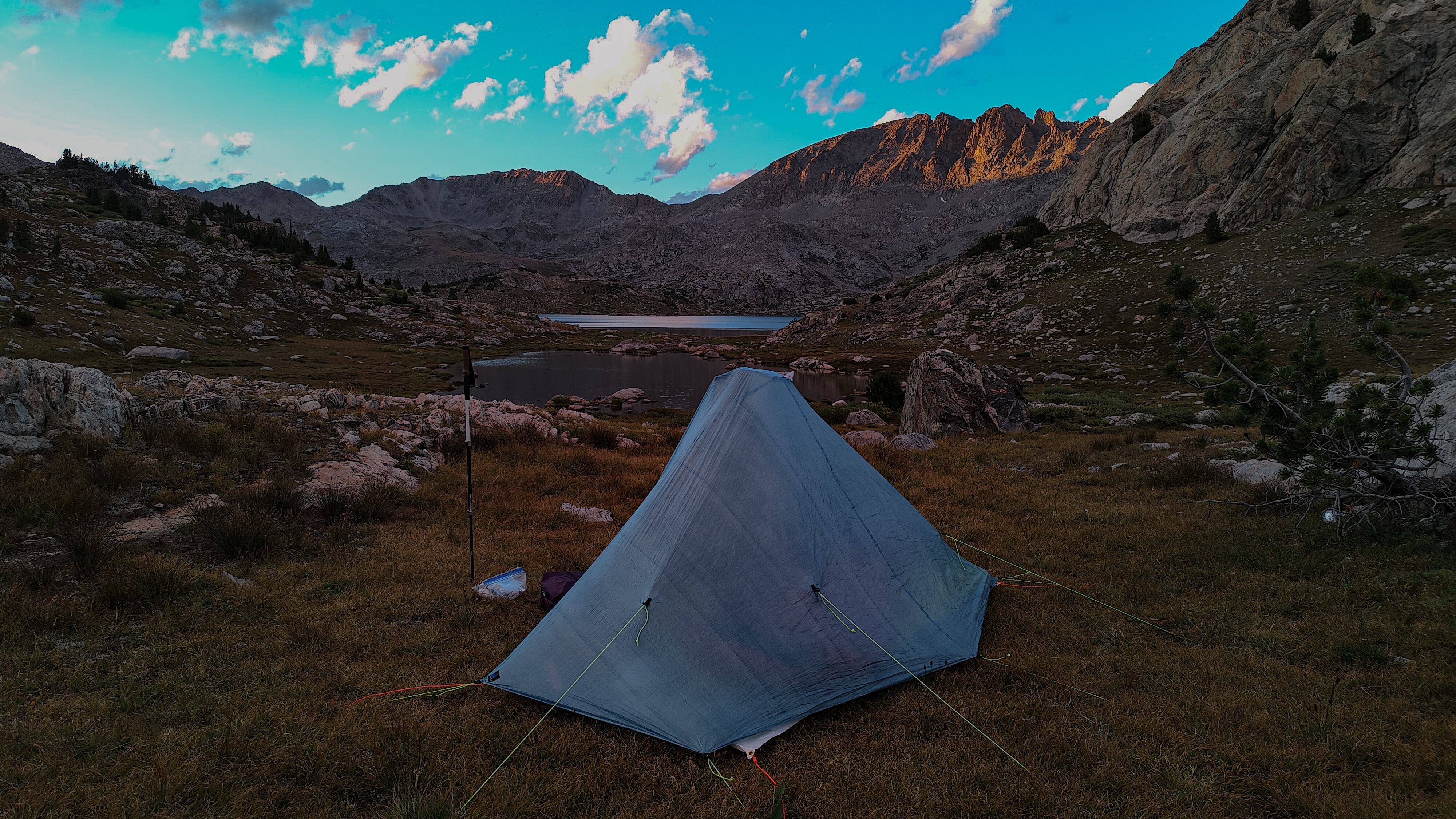 Hay Pass sneaks up on you, and you're not quite sure you've arrived until it becomes apparent that you're headed downhill toward Dennis Lake which eventually, and quite unexpectedly comes into view. I prefer studying maps after a trip rather than before, and in the case of the Winds, where navigation in clear weather with just a simple compass bearing is straightforward, letting the next turn in the path provide some anticipation. For the same reason, my inReach® remains tucked away until an emergency or the end of the day (whichever comes first). Happy to be descending rather than climbing the path, it is a matter of minutes to the Golden Lakes Basin where a left turn takes you up the drainage past three delightful lakes and a remote chance of seeing members of your species fishing the long-ago stocked lakes. Though a trail up Bull Lake Creek leads to the basin from the east, it is next to forever to the trailhead. Upon arriving at Upper Golden Lake, the highest lake in the basin, I once again left the Wilson-Dixon route leading to the Alpine Lakes basin and instead, headed west cross-country up a drainage toward another crossing of the continental divide. I passed a couple of lakes that had, at sometime in the past been stocked for fish were rising to feed on a hatch that was taking place. Eventually I reached the top of a promontory overlooking a rocky basin with some small tarns. I would have to descend 50 meters os so from here in order to continue up to the divide. I couldn't see anything in the surrounding area that might make a better camp than where I was standing, it was getting on into late afternoon and it would take me a full two hours to go up and over the divide, then descend to somewhere suitable for a camp. The possibility of afternoon showers and a desire to spend some time on the divide made this seem as good a spot as any to stop for the day. There was a level patch of sedge between two large rocks and a pond nearby. That sealed the deal. I set up my tent thinking that my freeze-dried Chicken Tetrachloride would taste pretty good tonight.