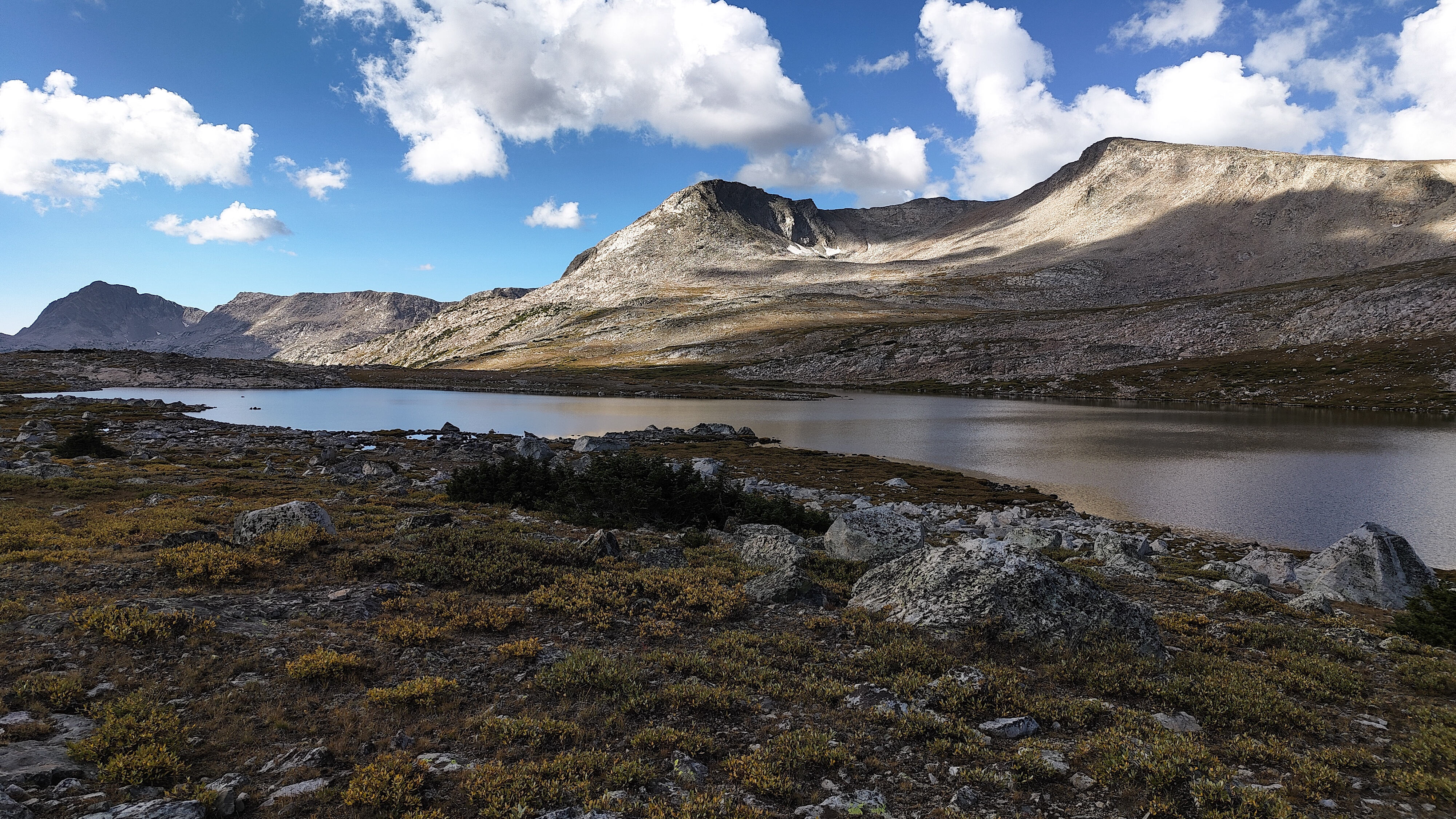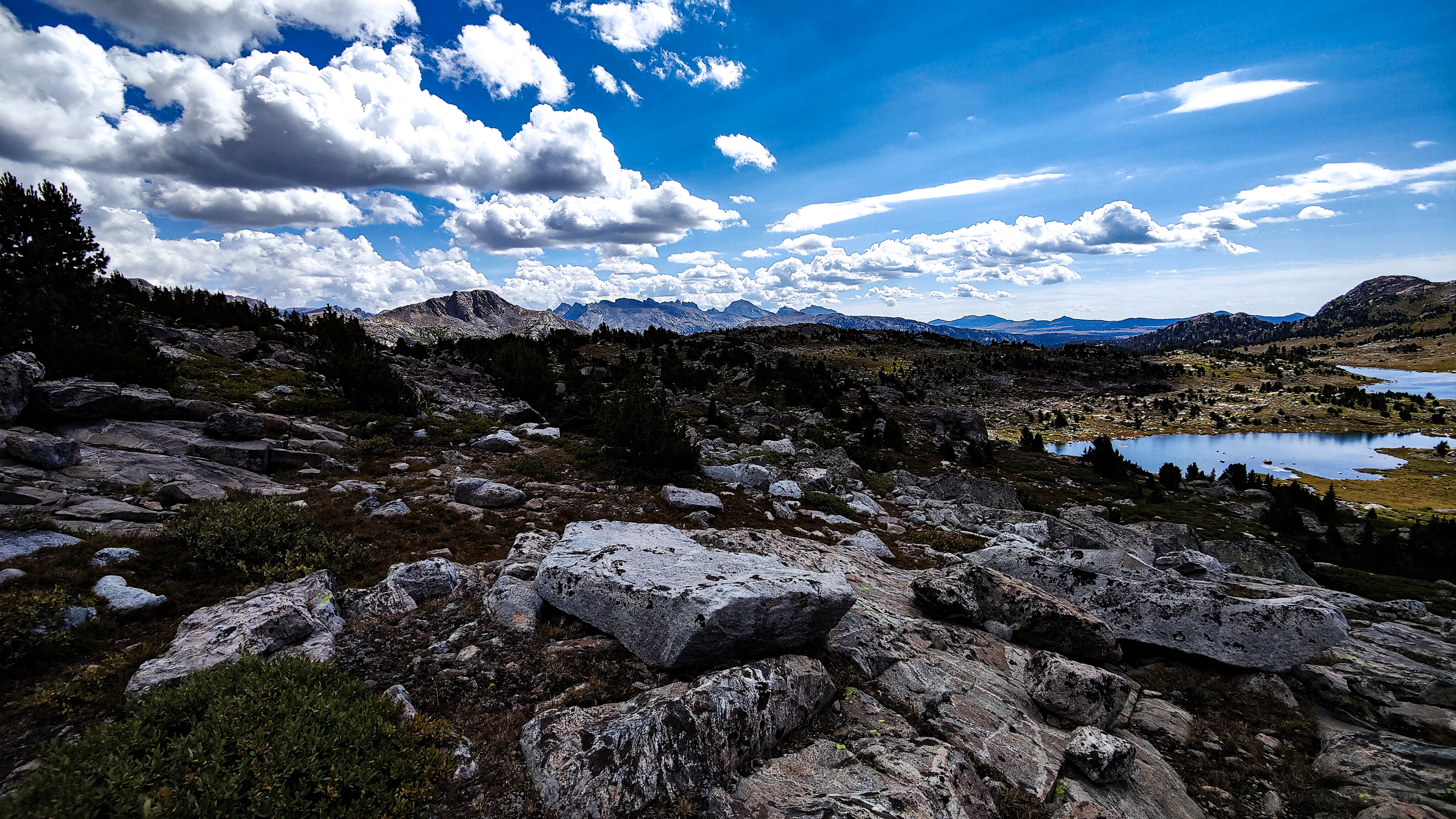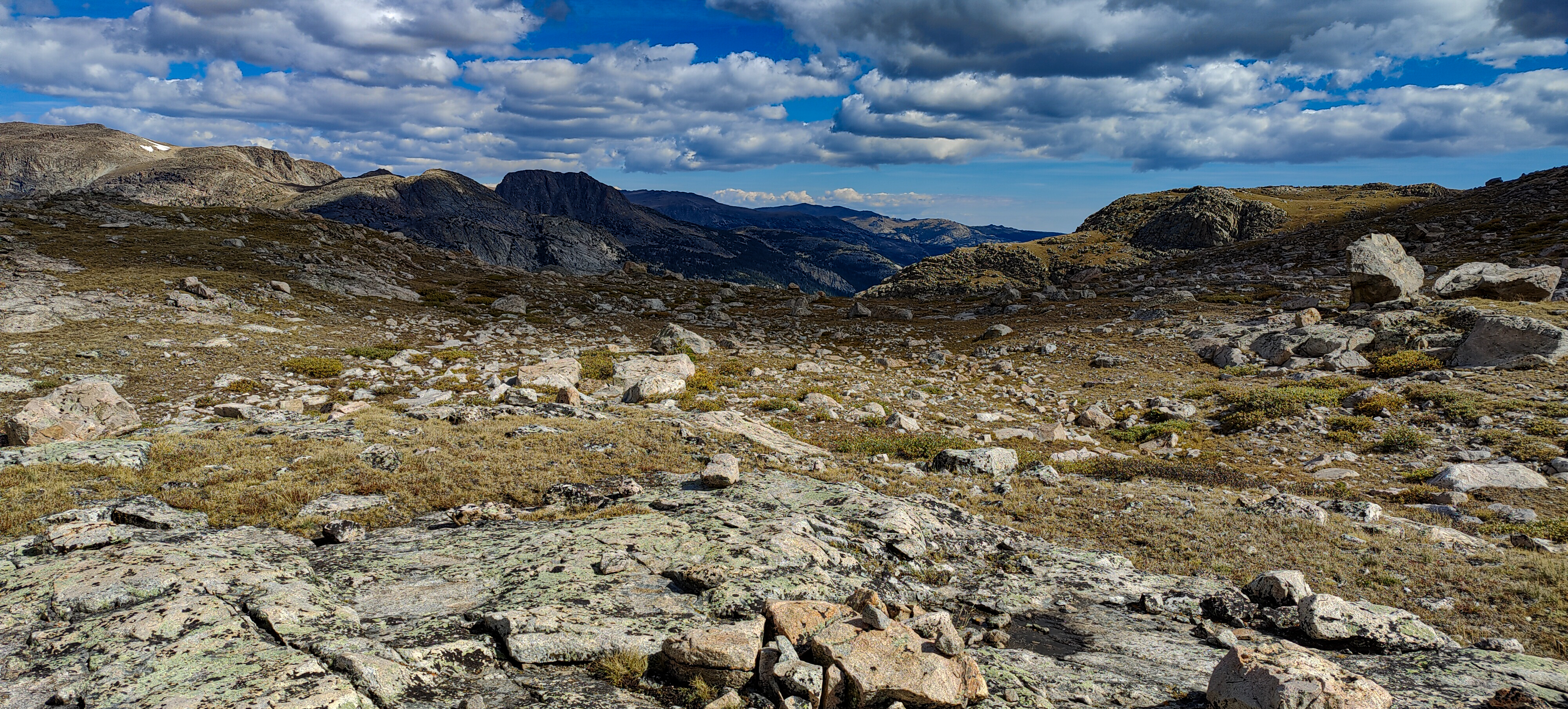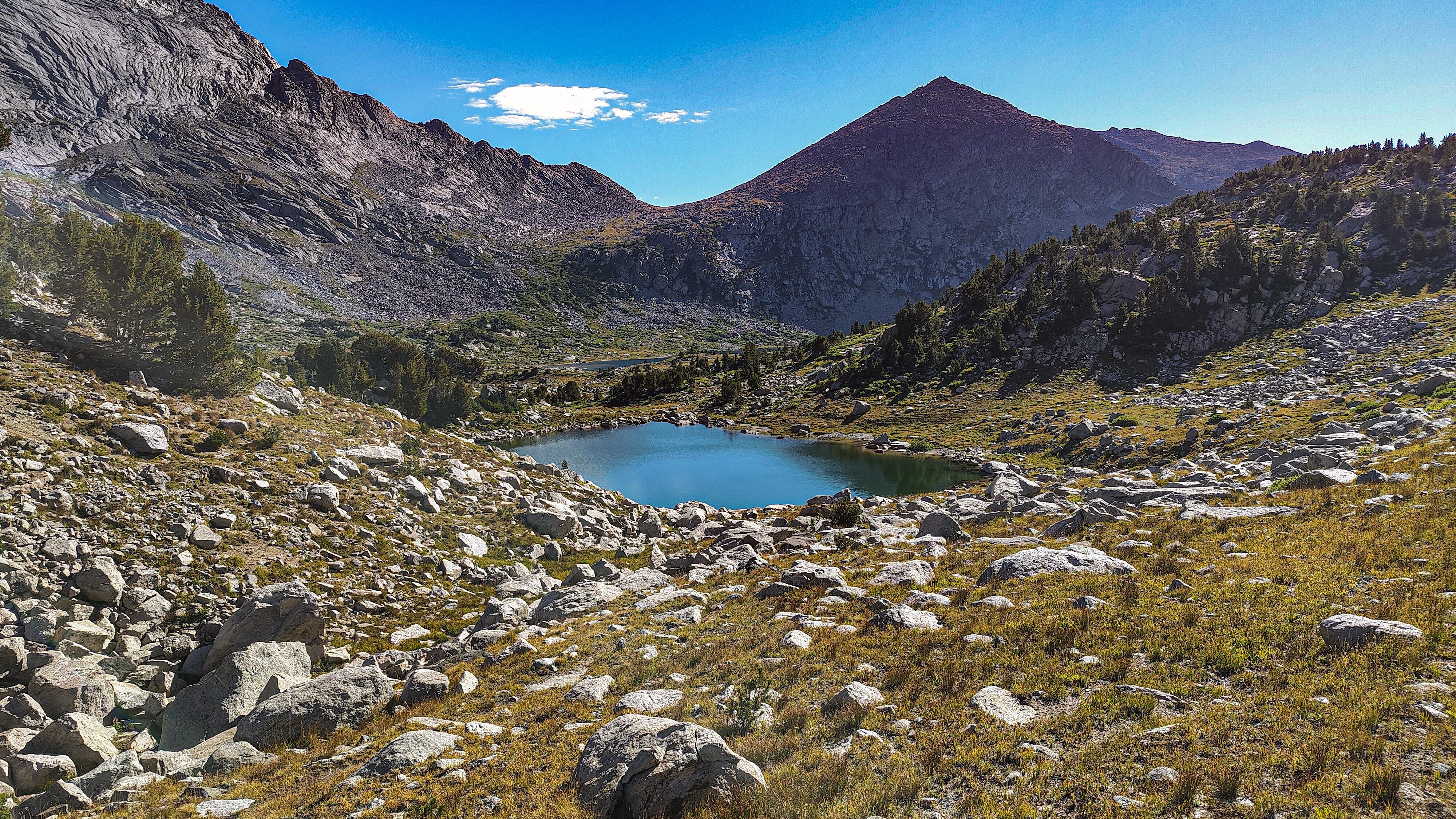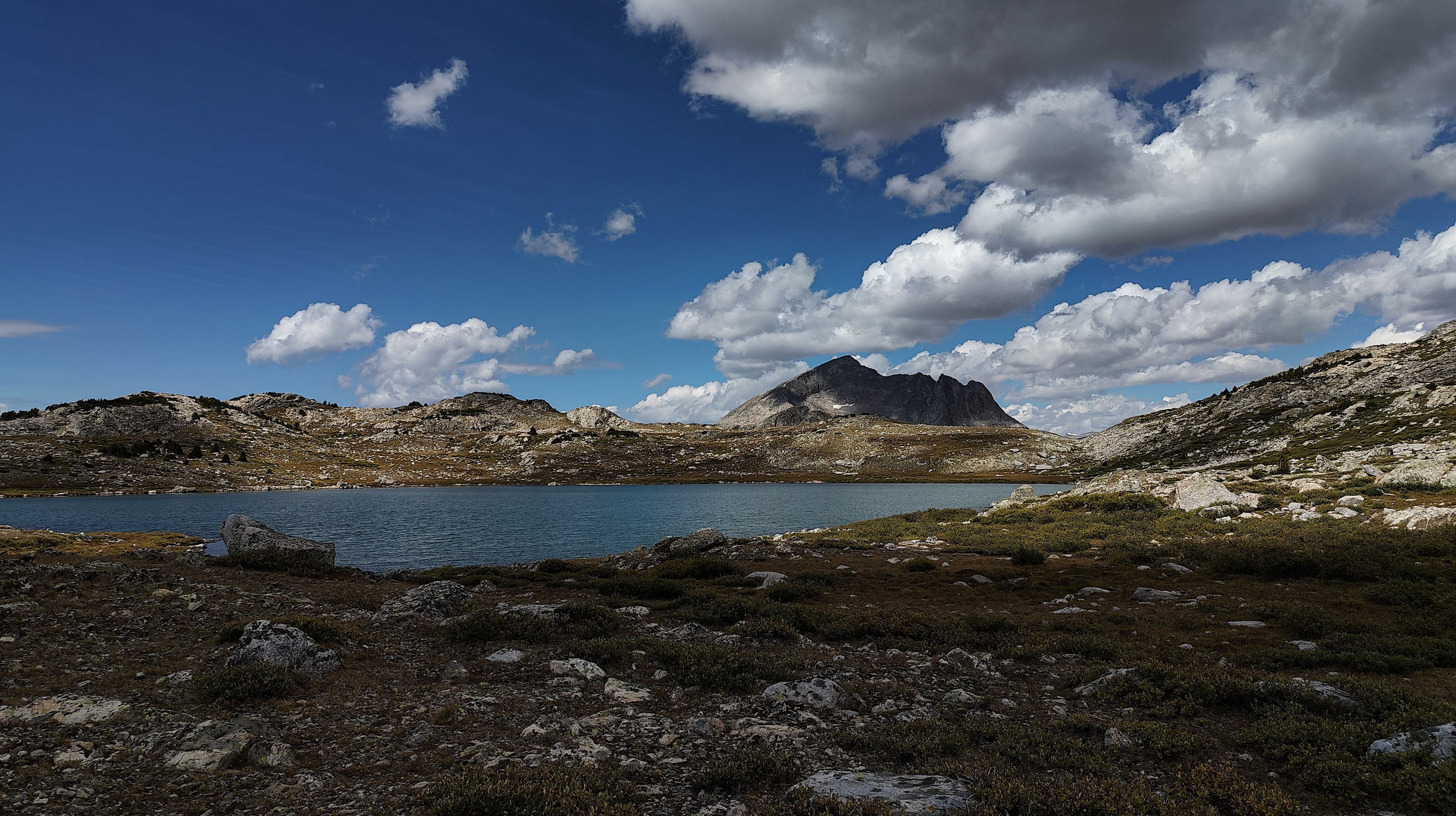 Hay Pass sneaks up on you, and you're not quite sure you've arrived until it becomes apparent that you're headed downhill toward Dennis Lake which eventually, and quite unexpectedly comes into view. I prefer studying maps after a trip rather than before, and in the case of the Winds, where navigation in clear weather with just a simple compass bearing is straightforward, letting the next turn in the path provide some anticipation. For the same reason, my inReach® remains tucked away until an emergency or the end of the day (whichever comes first). Happy to be descending rather than climbing the path, it is a matter of minutes to the Golden Lakes Basin where a left turn takes you up the drainage past three delightful lakes and a remote chance of seeing members of your species fishing the long-ago stocked lakes. Though a trail up Bull Lake Creek leads to the basin from the east, it is next to forever to the trailhead. Upon arriving at Upper Golden Lake, the highest lake in the basin, I once again left the Wilson-Dixon route leading to the Alpine Lakes basin and instead, headed west cross-country up a drainage toward another crossing of the continental divide. I passed a couple of lakes that had, at sometime in the past been stocked for fish were rising to feed on a hatch that was taking place. Eventually I reached the top of a promontory overlooking a rocky basin with some small tarns. I would have to descend 50 meters os so from here in order to continue up to the divide. I couldn't see anything in the surrounding area that might make a better camp than where I was standing, it was getting on into late afternoon and it would take me a full two hours to go up and over the divide, then descend to somewhere suitable for a camp. The possibility of afternoon showers and a desire to spend some time on the divide made this seem as good a spot as any to stop for the day. There was a level patch of sedge between two large rocks and a pond nearby. That sealed the deal. I set up my tent thinking that my freeze-dried Chicken Tetrachloride would taste pretty good tonight.