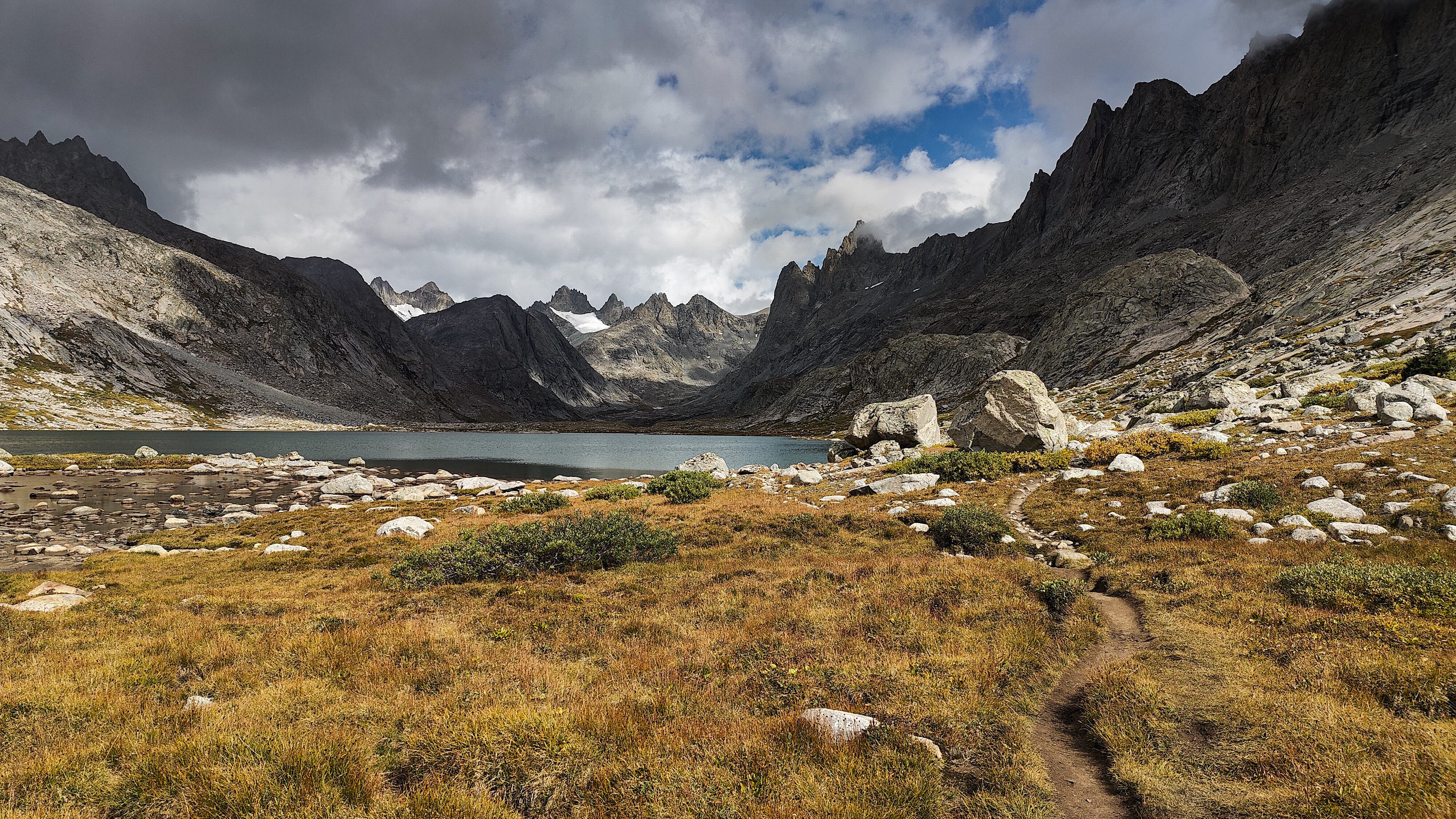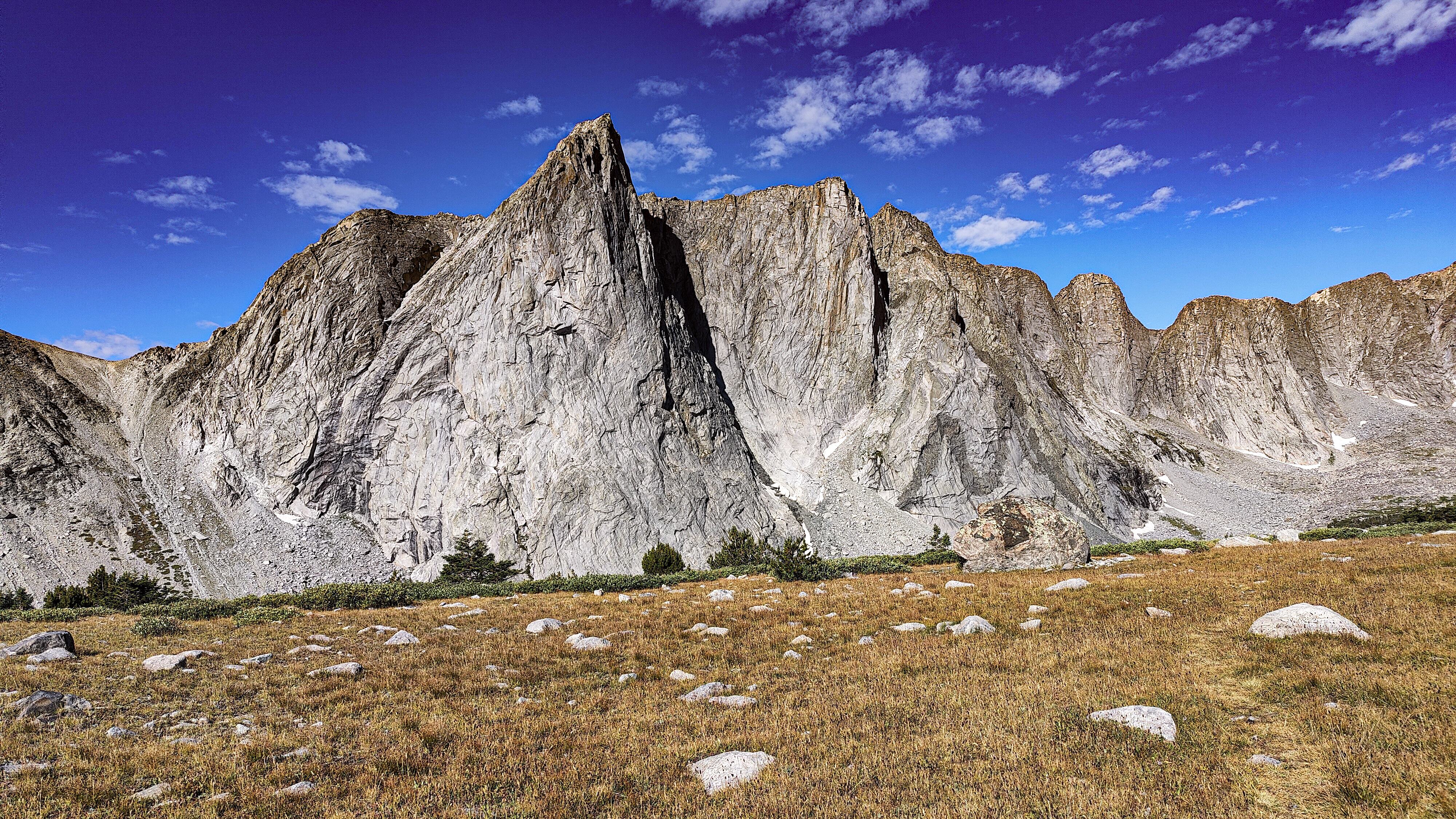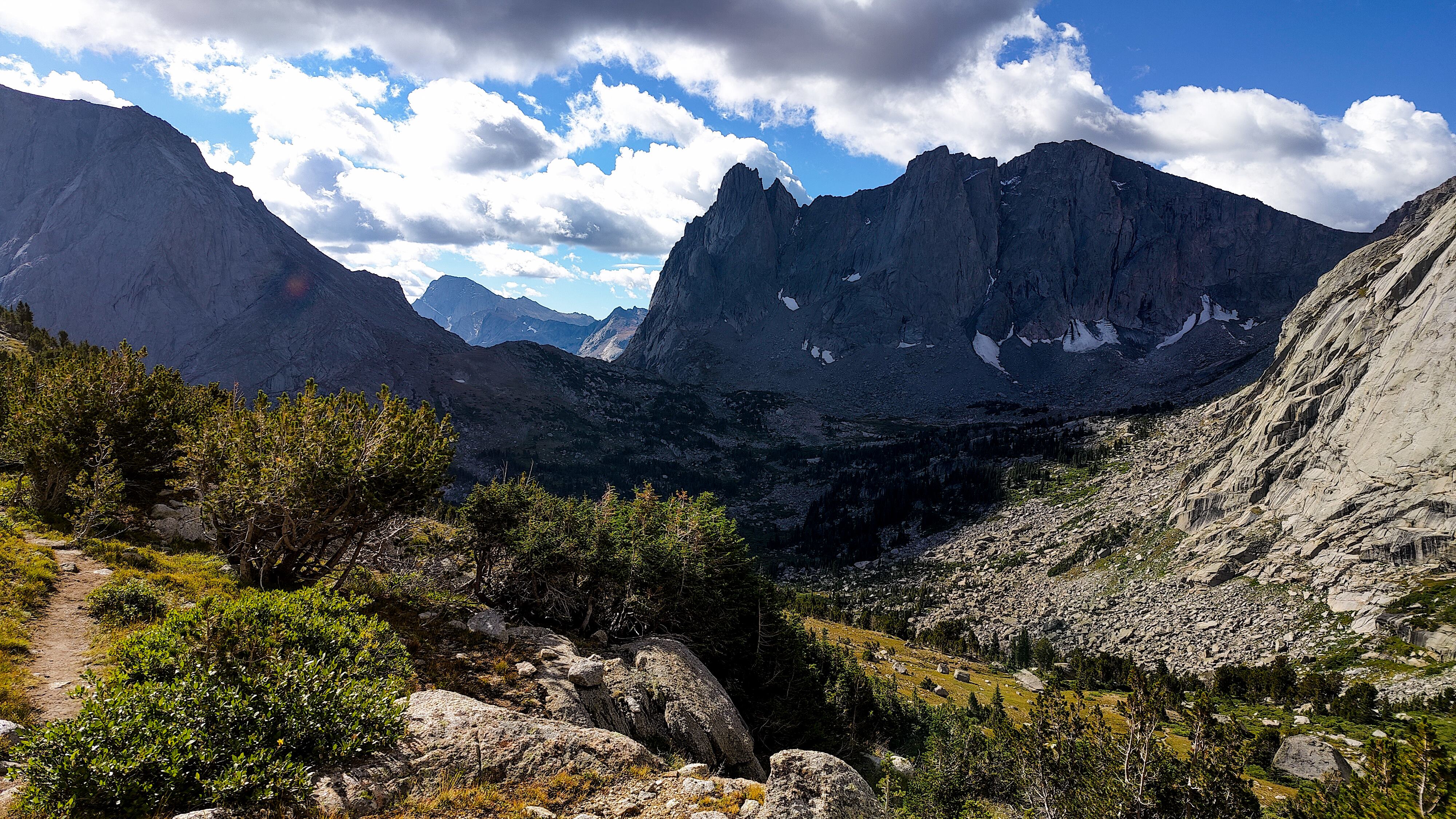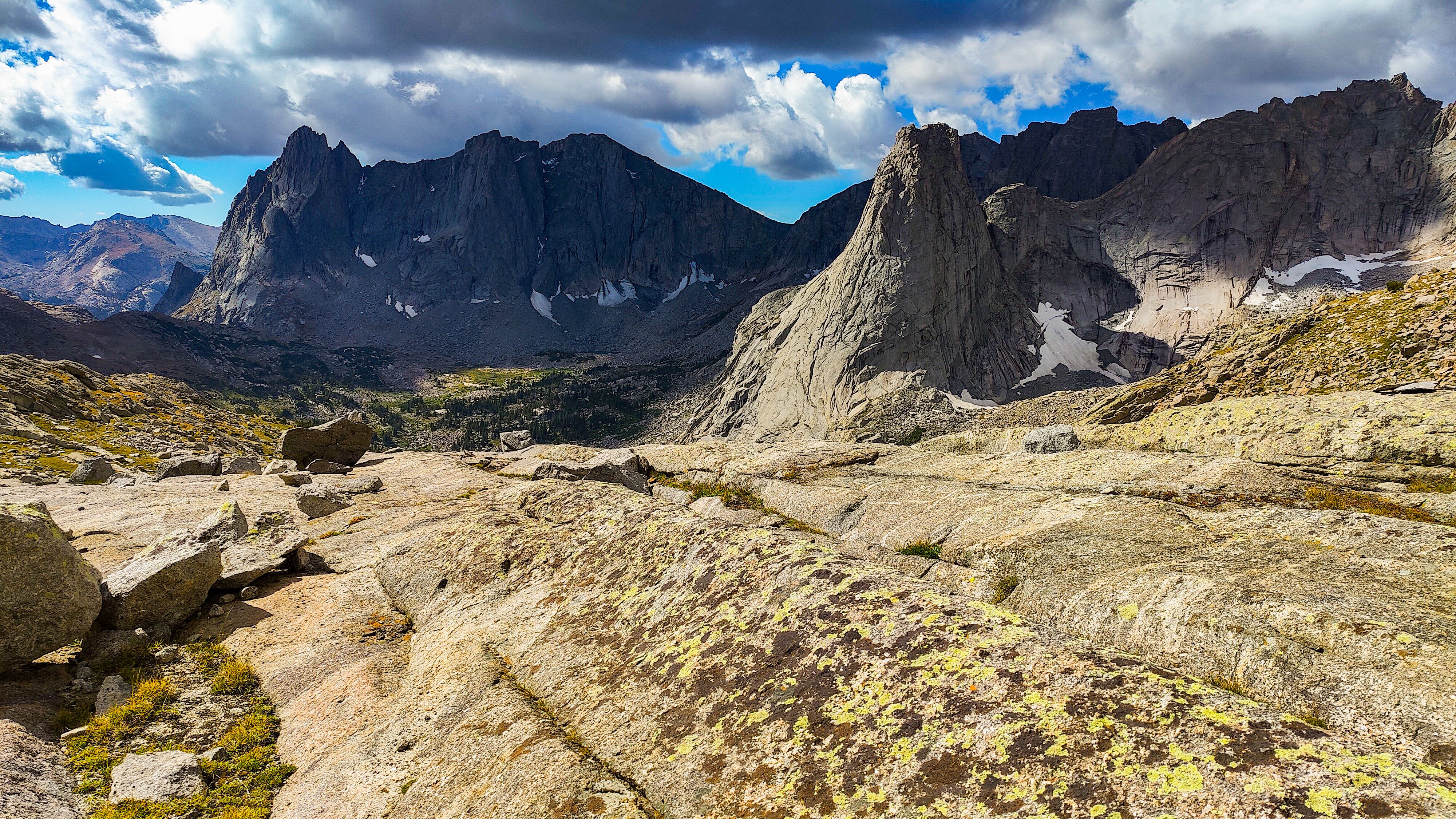 Taking advantage of a forecast for a cold snap and prolonged spell of good weather, I began the High Route in early September. After a forced 6 am start, spending most of the day spotting a vehicle and wanting no part of it in the first place, the relief on my wife's face was palpable as she headed back down the shock-busting Big Sandy road without a backward glance. Sidestepping the cloud of dust, I began my south to north journey, preferring the sun to my back and to camp the first night in the Cirque rather than along the Green with its increased bear activity. Within a minute all systems had rebooted and I was living in the moment. Like the Green, the walk along the Big Sandy River offers a gentle beginning to any adventure. With its glimpses of Wind River grandeur, Big Sandy Lake is where the warm-up ends and the fun begins. It was the Tuesday following Labor Day and still busy. The departing cold front made for cool and breezy walk up to Jackass Pass. I followed the last group of young, oxygen-starved stragglers through the "boulder problem" at Arrowhead Lake and up toward the pass. They turned out to be a young couple on their honeymoon and had driven straight through from South Bend Indiana, stopping only for gas and restrooms. Both had been up since the ceremony and as the woman said, "We were 50 miles down the road before we finished our cake". The groom was managing only 10 steps between rests but the bride, obviously in better shape and seemingly unaffected by the altitude, was determined to connsumate their marriage in the Cirque of the Towers according to the plan she outlined. I suspected there was no plan B and that anything short of a camp at Lonesome would be a cruel disappointment. We reached the pass. "It's all downhill from here" I exhorted encouragingly before realizing what I had said. He was wasted, she remained a pillar of matrimonial determination, and I feared that anything further from me would only make matters worse. I offered to follow them down to the climber's cutoff and hopefully point out a campsite. After a few minutes of downhill, progress improved and we reached the cutoff. As I pointed out an empty spot just outside the 1/4 mile limit, the woman turned and embraced me. What I assumed to be relief and the beauty of the Cirque working its magic I then realized was a touching gesture of gratitude. She had tears in her eyes. I had simply failed to appreciate how important being here was to them. We shook hands, exchanged more embraces and I kissed the bride before we separated. I watched them descend for a minute or so before going on my way. Though the Cirque was predictably busy, I found a spot to camp among some climbers in the meadows below Pylon Peak. The departing weather system exited around midnight with a ferocious hour-long thunderstorm replete with all the trimmings. Not bad for the first day. Drifting off, my last thoughts were of the honeymooners and how we had been the most ephemeral of friends - we had never told each other our names.