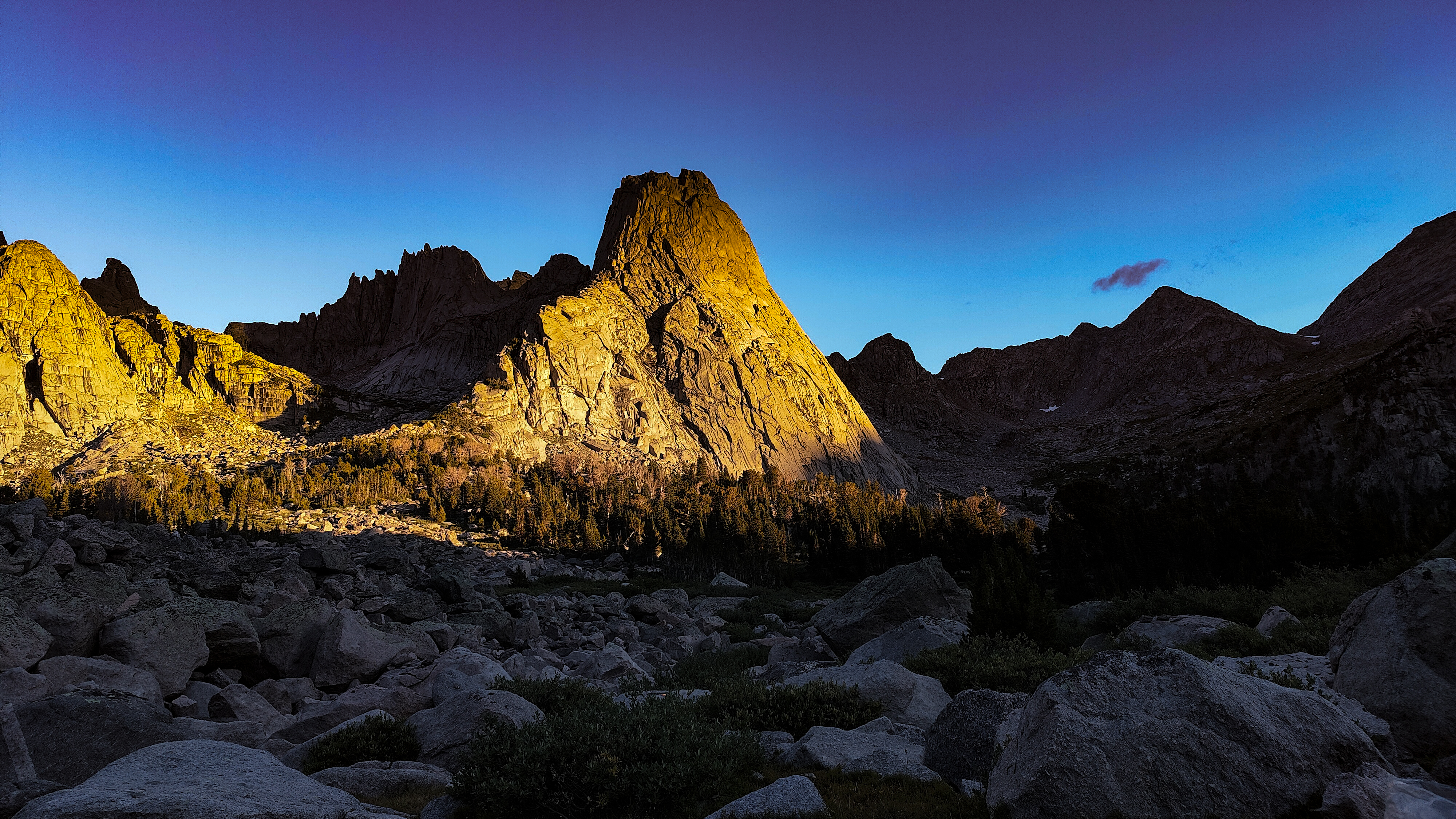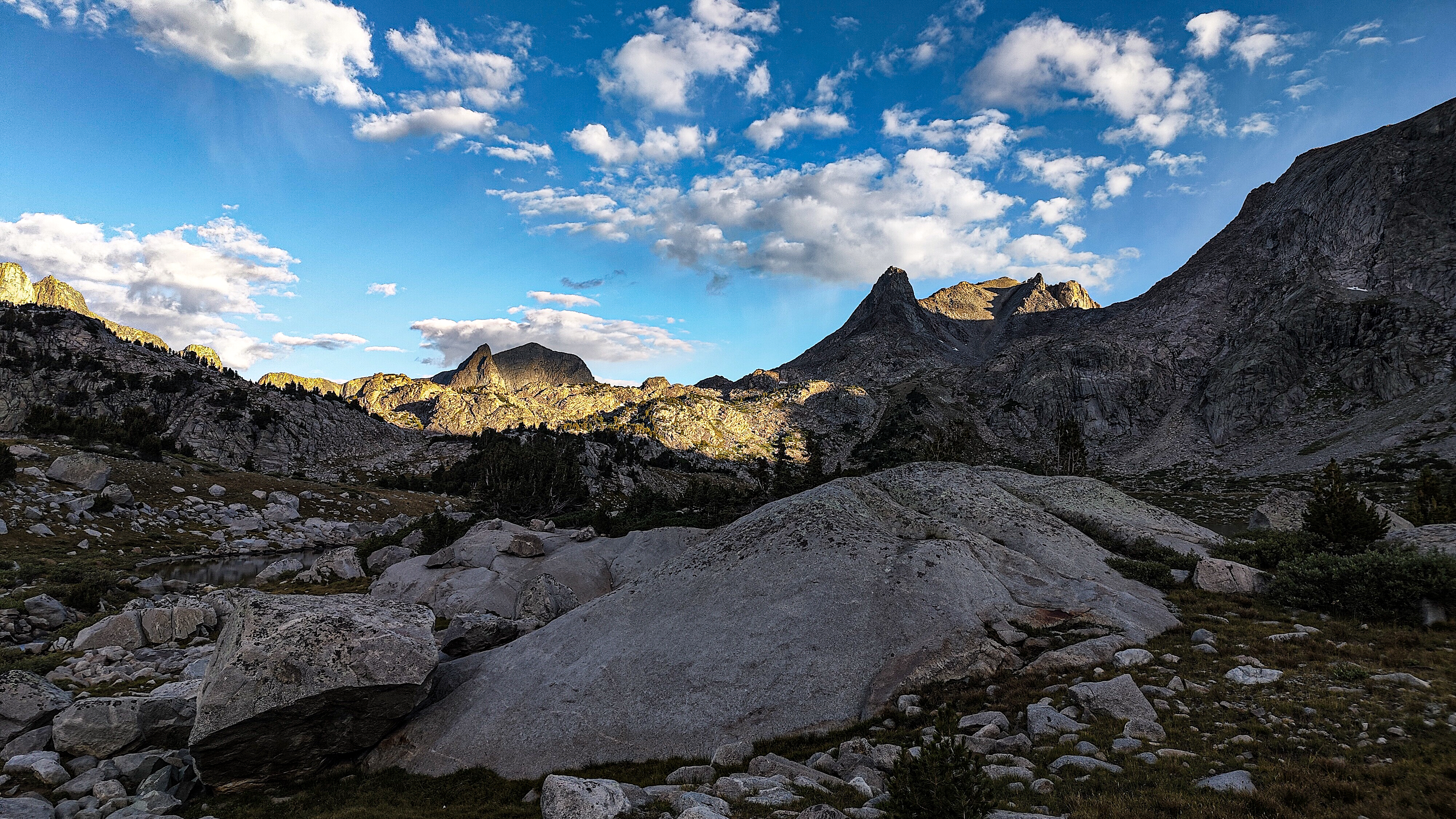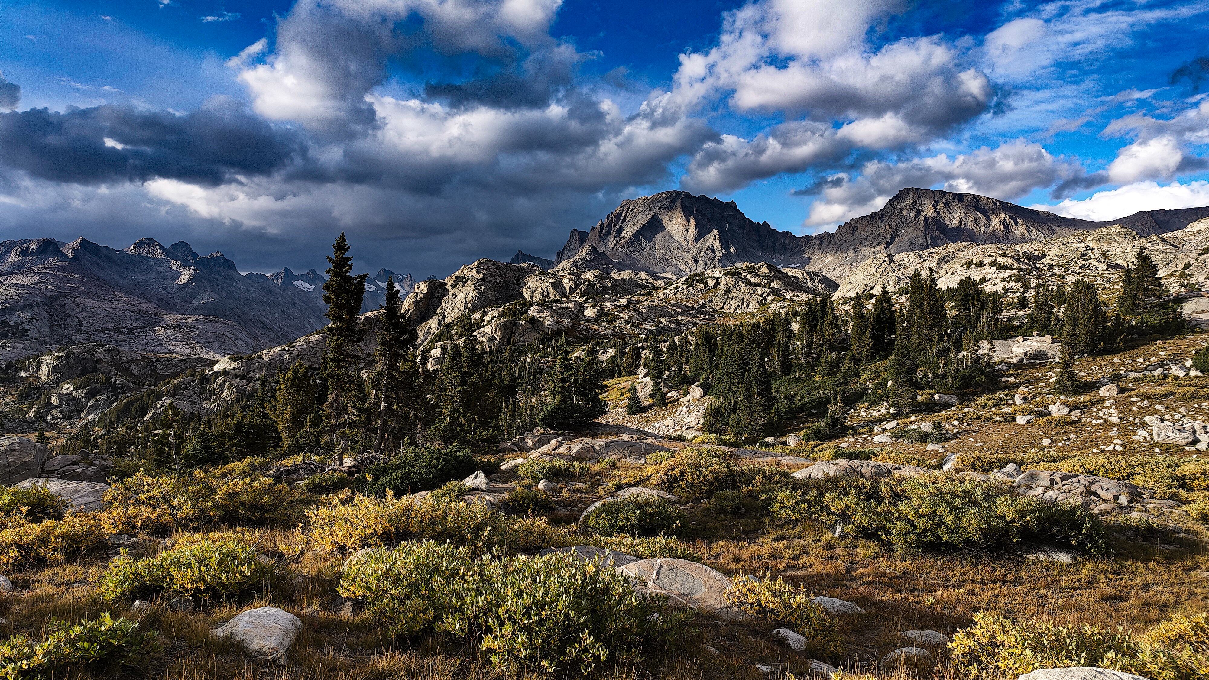 Taking advantage of a forecast for a cold snap and prolonged spell of good weather, I began the High Route in early September. After a forced 6 am start, spending most of the day spotting a vehicle and wanting no part of it in the first place, the relief on my wife's face was palpable as she headed back down the shock-busting Big Sandy road without a backward glance. Sidestepping the cloud of dust, I began my south to north journey, preferring the sun to my back and to camp the first night in the Cirque rather than along the Green with its increased bear activity. Within a minute all systems had rebooted and I was living in the moment. Like the Green, the walk along the Big Sandy River offers a gentle beginning to any adventure. With its glimpses of Wind River grandeur, Big Sandy Lake is where the warm-up ends and the fun begins. It was the Tuesday following Labor Day and still busy. The departing cold front made for cool and breezy walk up to Jackass Pass. I followed the last group of young, oxygen-starved stragglers through the "boulder problem" at Arrowhead Lake and up toward the pass. They turned out to be a young couple on their honeymoon and had driven straight through from South Bend Indiana, stopping only for gas and restrooms. Both had been up since the ceremony and as the woman said, "We were 50 miles down the road before we finished our cake". The groom was managing only 10 steps between rests but the bride, obviously in better shape and seemingly unaffected by the altitude, was determined to connsumate their marriage in the Cirque of the Towers according to the plan she outlined. I suspected there was no plan B and that anything short of a camp at Lonesome would be a cruel disappointment. We reached the pass. "It's all downhill from here" I exhorted encouragingly before realizing what I had said. He was wasted, she remained a pillar of matrimonial determination, and I feared that anything further from me would only make matters worse. I offered to follow them down to the climber's cutoff and hopefully point out a campsite. After a few minutes of downhill, progress improved and we reached the cutoff. As I pointed out an empty spot just outside the 1/4 mile limit, the woman turned and embraced me. What I assumed to be relief and the beauty of the Cirque working its magic I then realized was a touching gesture of gratitude. She had tears in her eyes. I had simply failed to appreciate how important being here was to them. We shook hands, exchanged more embraces and I kissed the bride before we separated. I watched them descend for a minute or so before going on my way. Though the Cirque was predictably busy, I found a spot to camp among some climbers in the meadows below Pylon Peak. The departing weather system exited around midnight with a ferocious hour-long thunderstorm replete with all the trimmings. Not bad for the first day. Drifting off, my last thoughts were of the honeymooners and how we had been the most ephemeral of friends - we had never told each other our names.