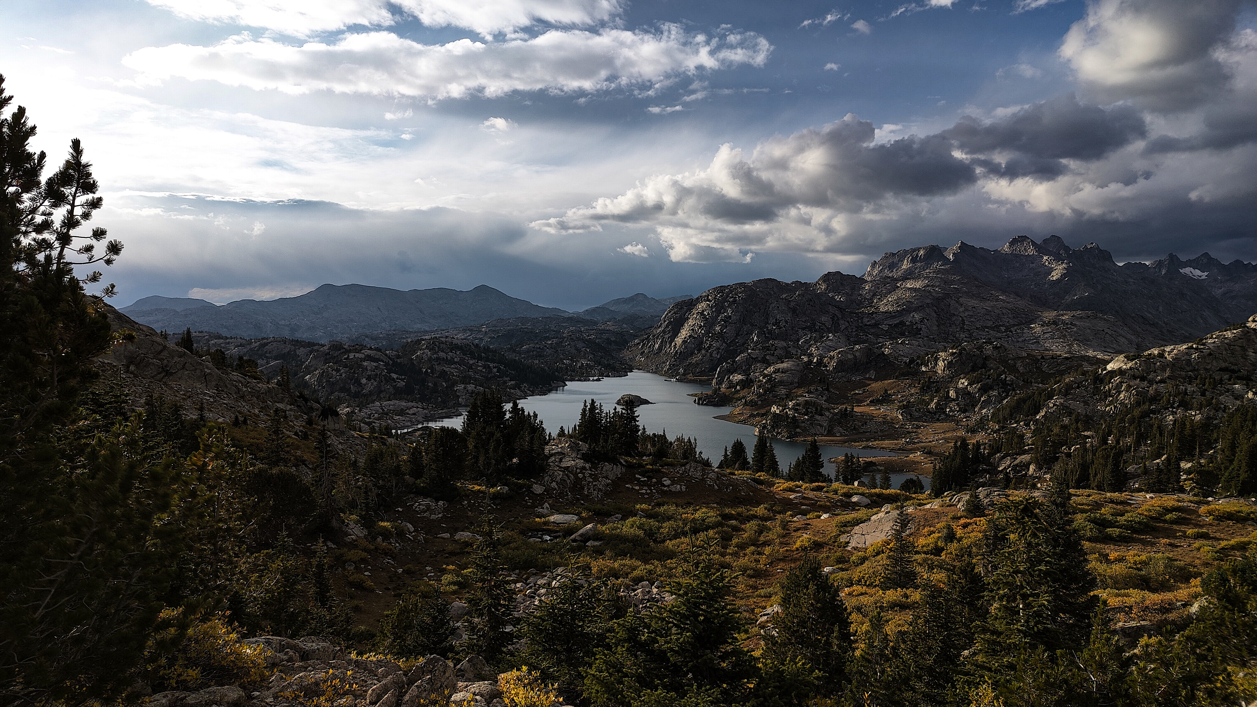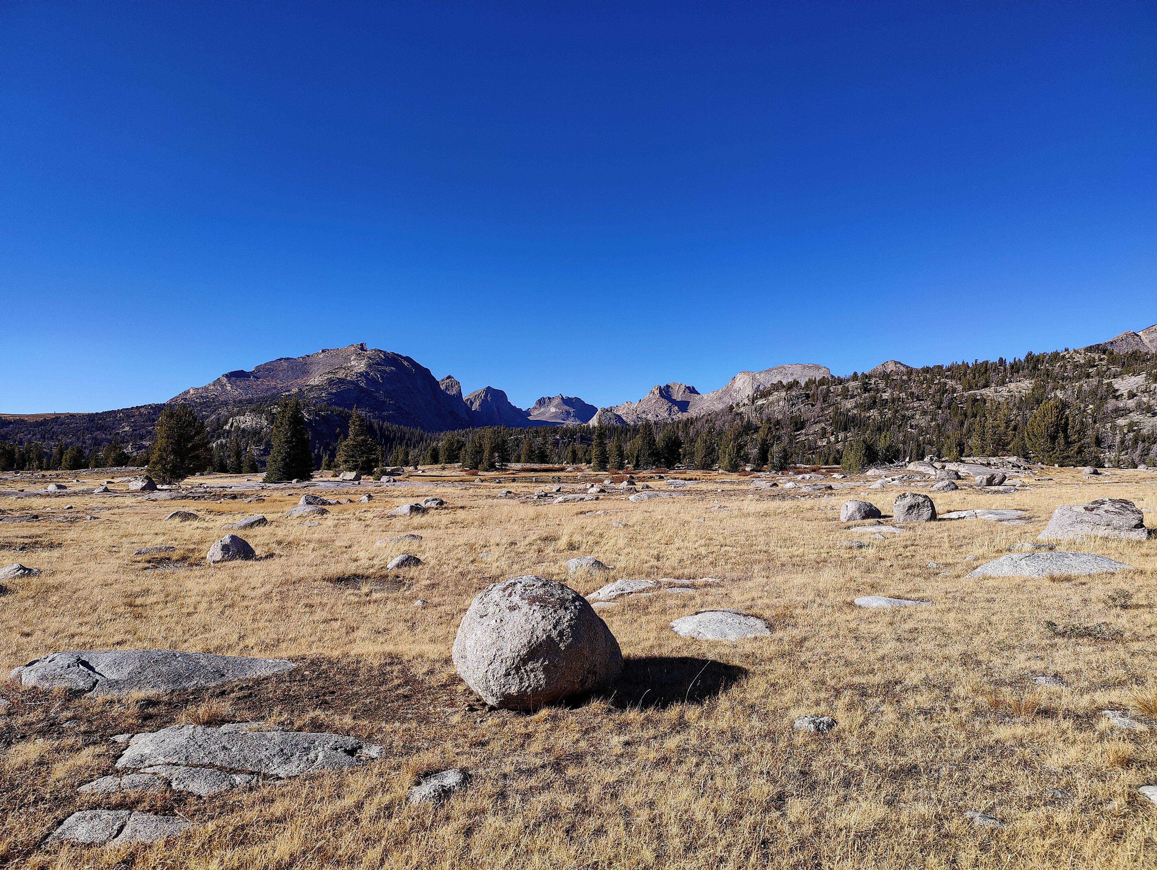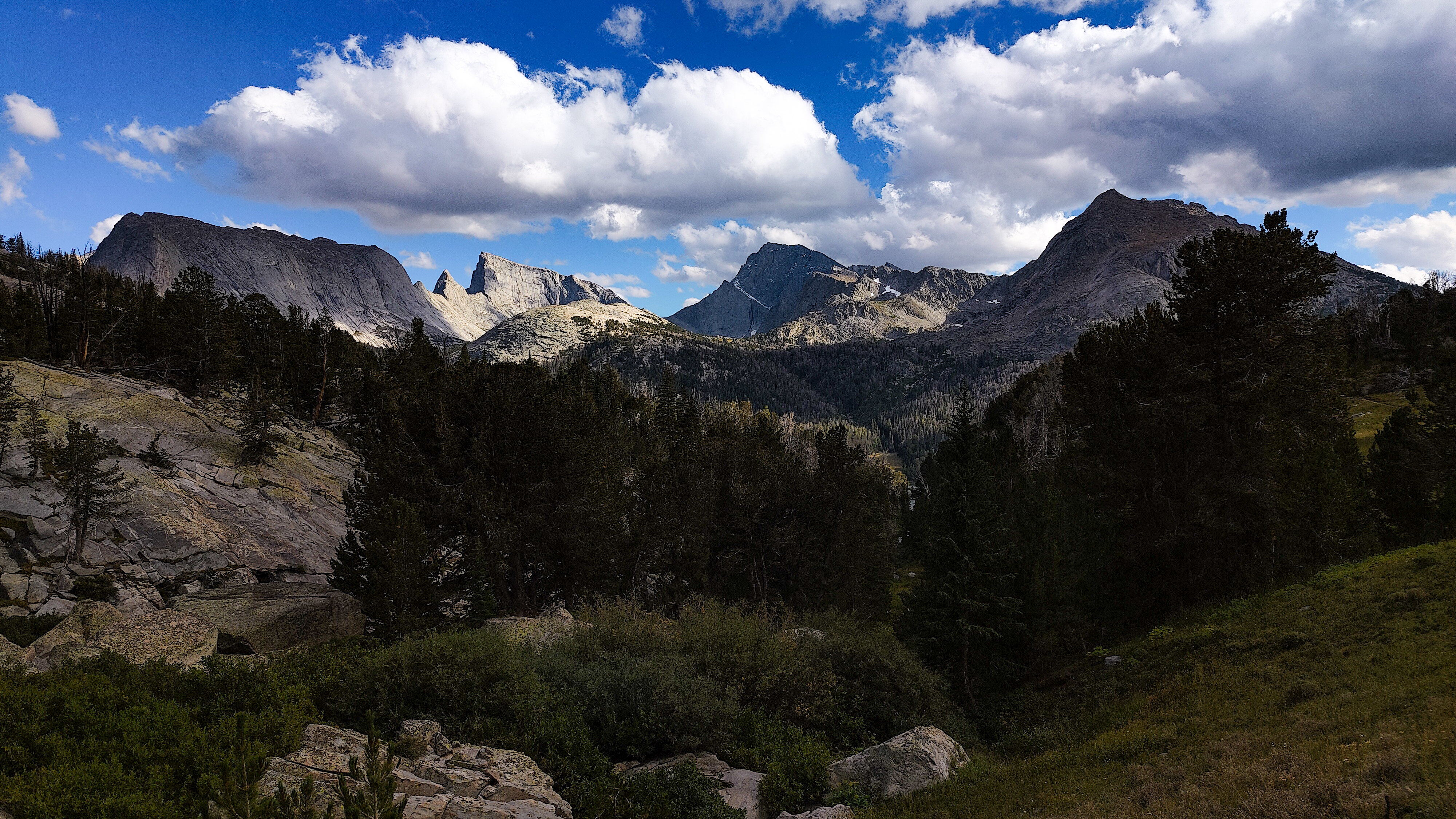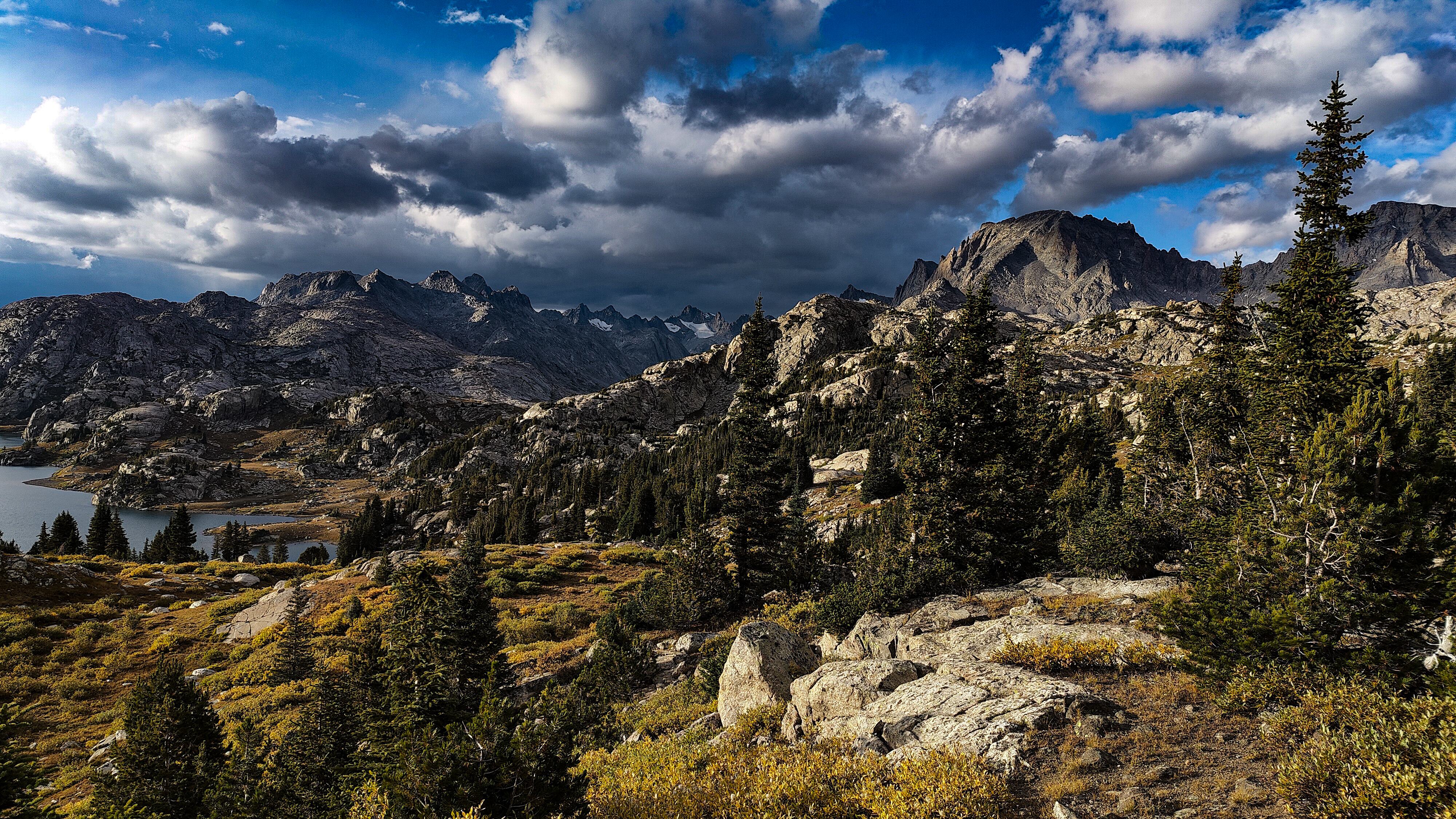 Taking advantage of a forecast for a cold snap and prolonged spell of good weather, I began the High Route in early September. After a forced 6 am start, spending most of the day spotting a vehicle and wanting no part of it in the first place, the relief on my wife's face was palpable as she headed back down the shock-busting Big Sandy road without a backward glance. Sidestepping the cloud of dust, I began my south to north journey, preferring the sun to my back and to camp the first night in the Cirque rather than along the Green with its increased bear activity. Within a minute all systems had rebooted and I was living in the moment. Like the Green, the walk along the Big Sandy River offers a gentle beginning to any adventure. With its glimpses of Wind River grandeur, Big Sandy Lake is where the warm-up ends and the fun begins. It was the Tuesday following Labor Day and still busy. The departing cold front made for cool and breezy walk up to Jackass Pass. I followed the last group of young, oxygen-starved stragglers through the "boulder problem" at Arrowhead Lake and up toward the pass. They turned out to be a young couple on their honeymoon and had driven straight through from South Bend Indiana, stopping only for gas and restrooms. Both had been up since the ceremony and as the woman said, "We were 50 miles down the road before we finished our cake". The groom was managing only 10 steps between rests but the bride, obviously in better shape and seemingly unaffected by the altitude, was determined to connsumate their marriage in the Cirque of the Towers according to the plan she outlined. I suspected there was no plan B and that anything short of a camp at Lonesome would be a cruel disappointment. We reached the pass. "It's all downhill from here" I exhorted encouragingly before realizing what I had said. He was wasted, she remained a pillar of matrimonial determination, and I feared that anything further from me would only make matters worse. I offered to follow them down to the climber's cutoff and hopefully point out a campsite. After a few minutes of downhill, progress improved and we reached the cutoff. As I pointed out an empty spot just outside the 1/4 mile limit, the woman turned and embraced me. What I assumed to be relief and the beauty of the Cirque working its magic I then realized was a touching gesture of gratitude. She had tears in her eyes. I had simply failed to appreciate how important being here was to them. We shook hands, exchanged more embraces and I kissed the bride before we separated. I watched them descend for a minute or so before going on my way. Though the Cirque was predictably busy, I found a spot to camp among some climbers in the meadows below Pylon Peak. The departing weather system exited around midnight with a ferocious hour-long thunderstorm replete with all the trimmings. Not bad for the first day. Drifting off, my last thoughts were of the honeymooners and how we had been the most ephemeral of friends - we had never told each other our names.