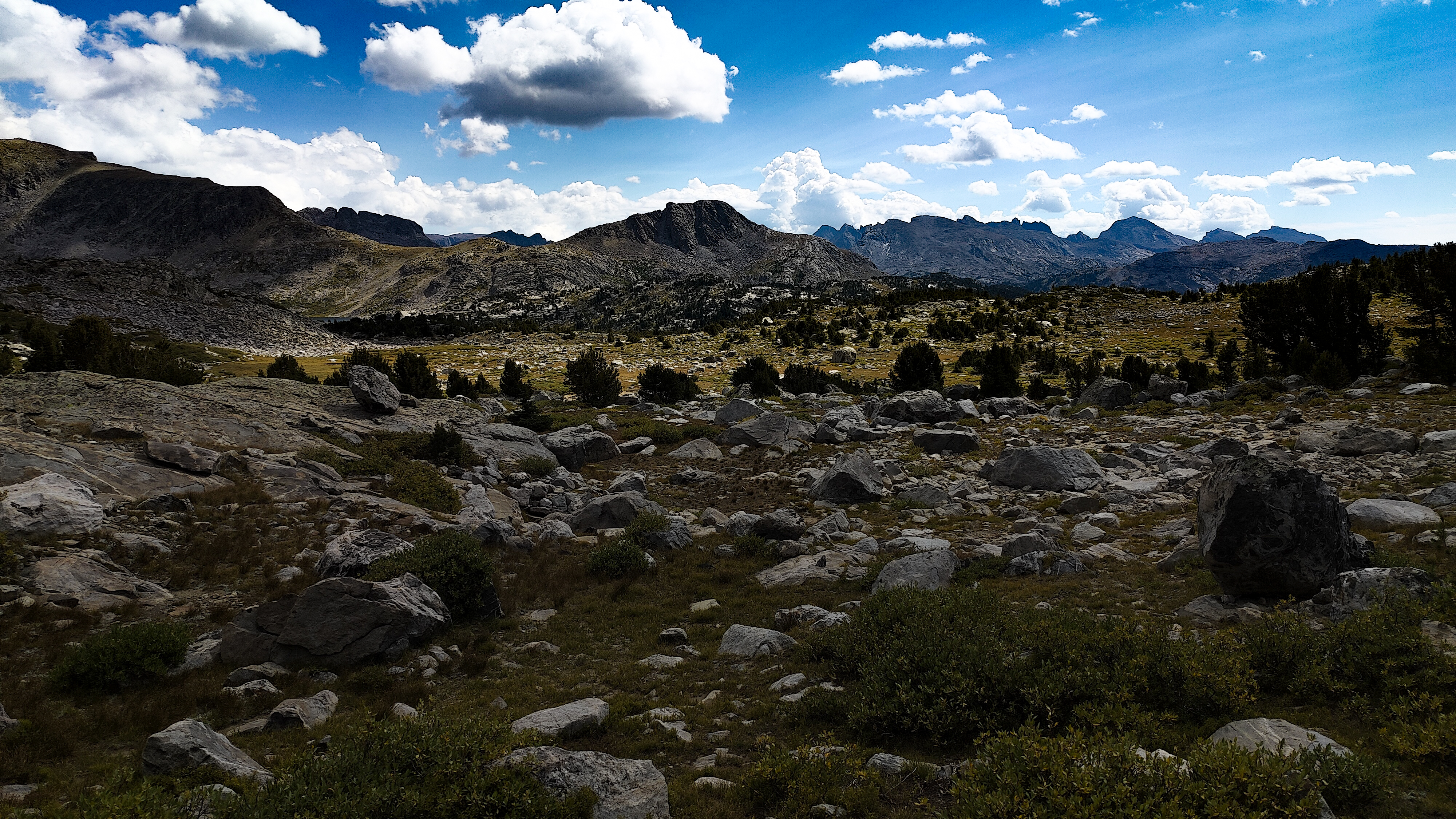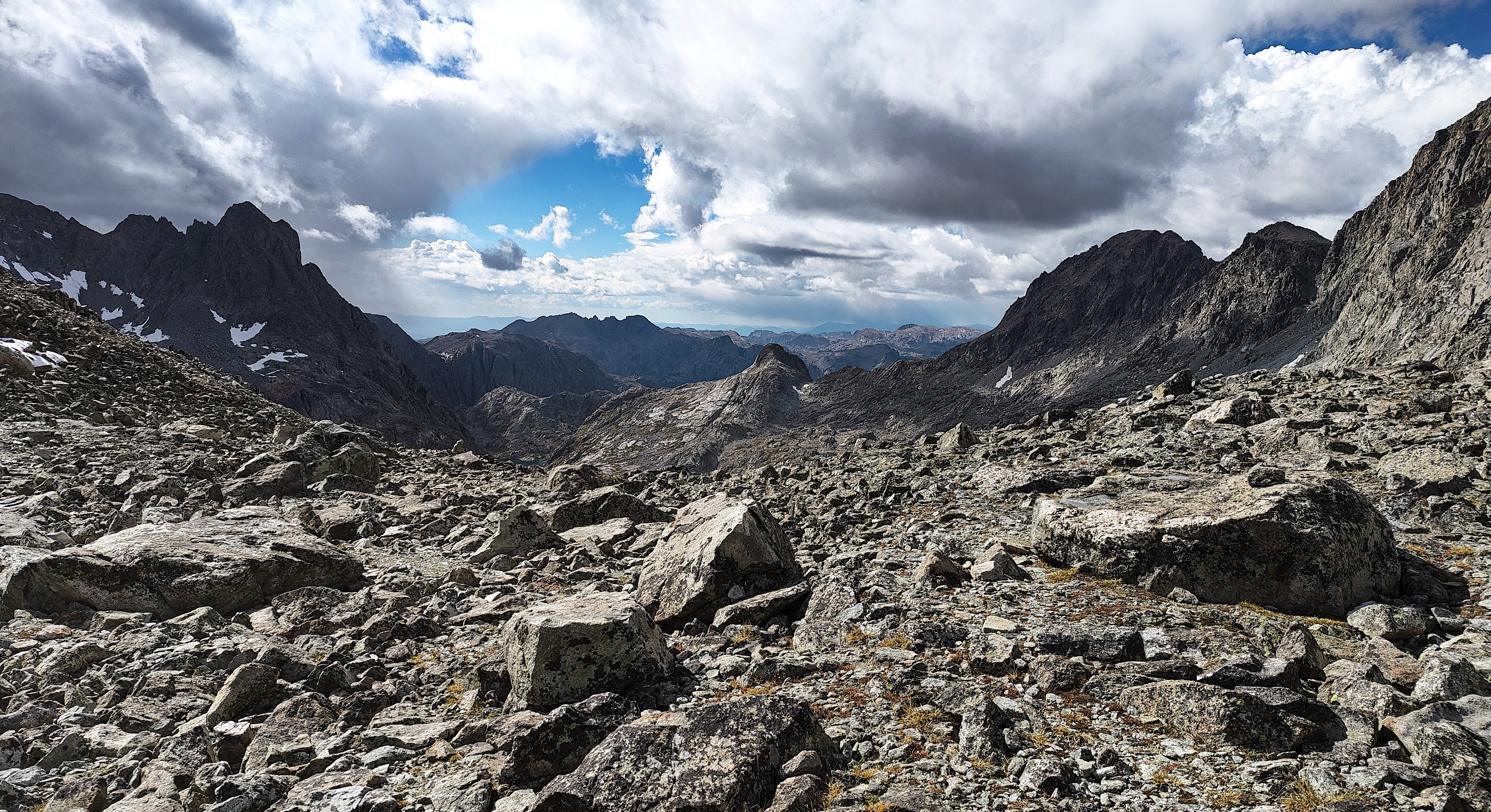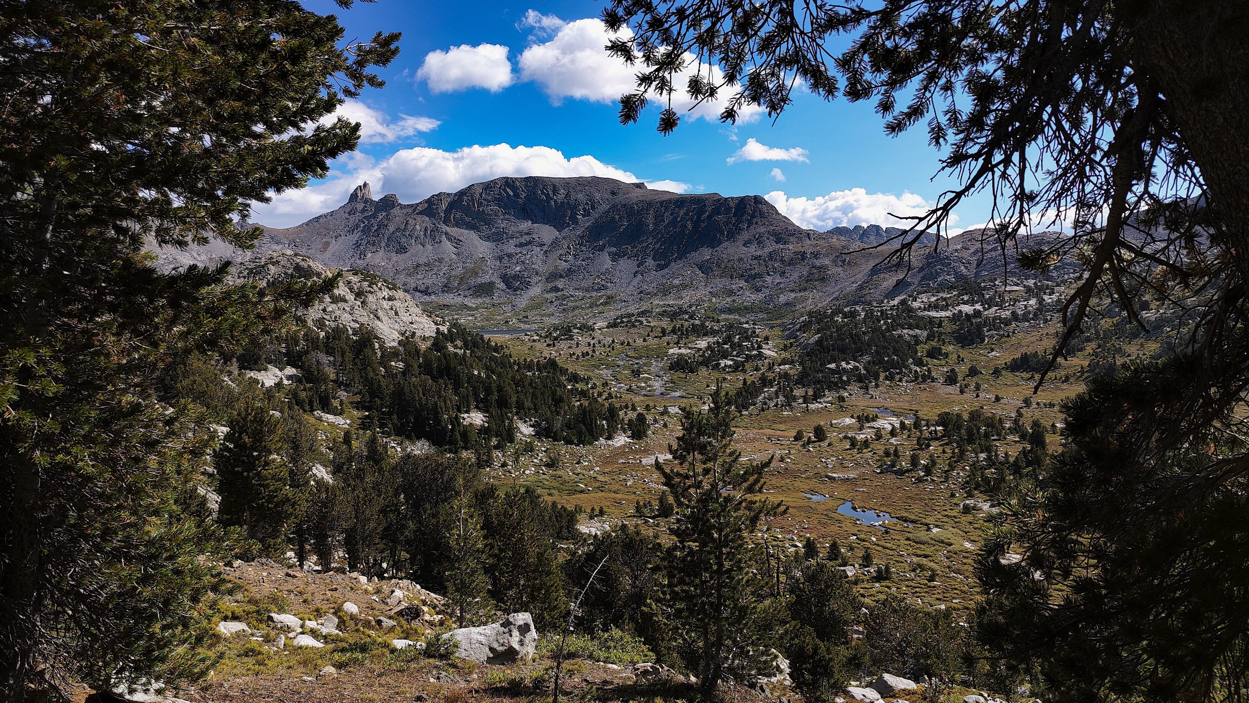 I discovered that I had shared Pyramid Lake with one other quiet party camped across the water, and we acknowledged each other with a wave as I left. The marked trail ended at the lake but an obvious use path heading west to the East Fork River divide and north along a broad bench above Desolation Valley appeared in its place. At this divide, the view is stunning. The Wilson-Dixon route is visible as a slight disturbance across the grassy meadow to the north. While there are lakes on the floor of this treeless valley cradling the headwaters of the East Fork River, it is the impressive 3 km long wall of 3700 + meter peaks marching from Mt. Geikie, Peak 12,183 , and Peak 12,187 with its curious giant black "M" intrusion, to Raid and Bonneville peaks that not only define the drainage, but stand as the westernmost bastion of summits rising above the skirt of granite that encircles and isolates the range from the Wyoming sagebrush plains. As you walk up the vally, alpine tundra replaces scrub pine but that soon gives way to headwalls, glacier-polished bedrock and finally the slopes of extra-large talus through which lies the path to the aptly-named "Pain In The Ass Pass" separating Raid and Bonneville Peaks. At near 3600 meters, this pass overlooks a broad swath of the southwestern Winds, the distant high plains and the mouth of Bonneville Basin directly below. I took advantage of three bars on the phone and reported in before descending into the Basin. The descent wandered through gentle headwalls and scree to the basin. There I caught the well-defined path that led past the lakes and up to my camp for the night at a lilliputian pond in the meadows below Sentry Pass.