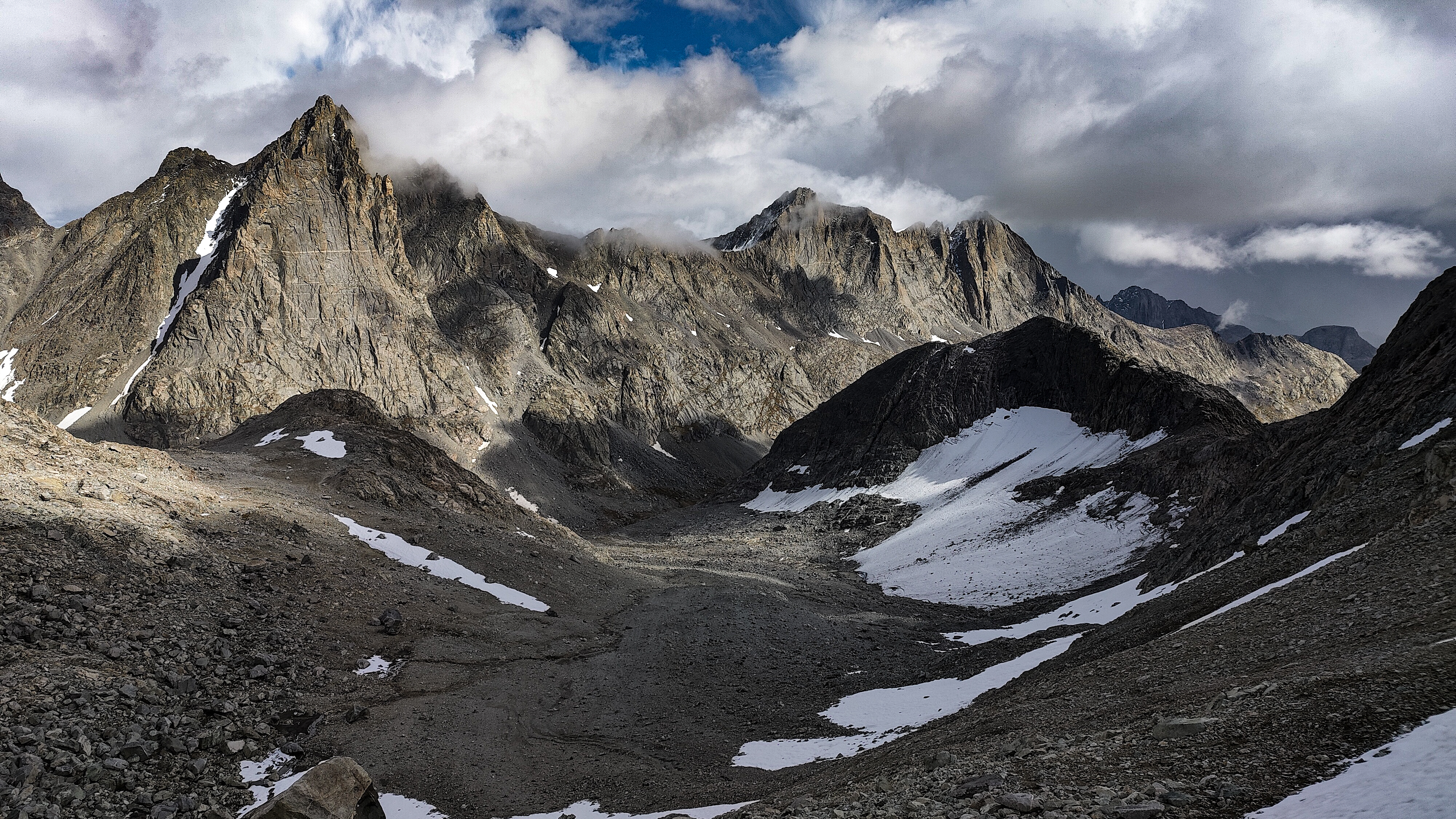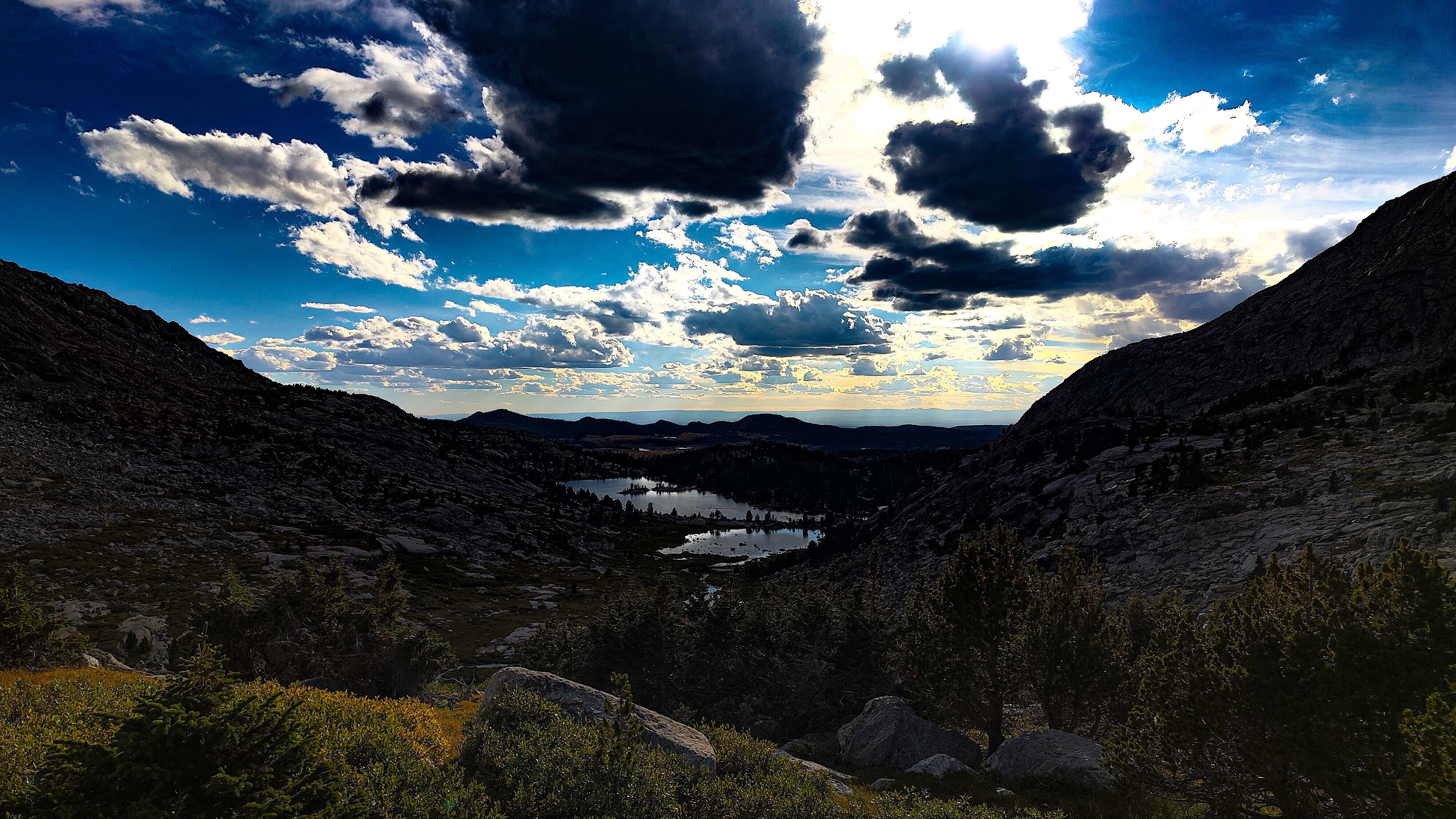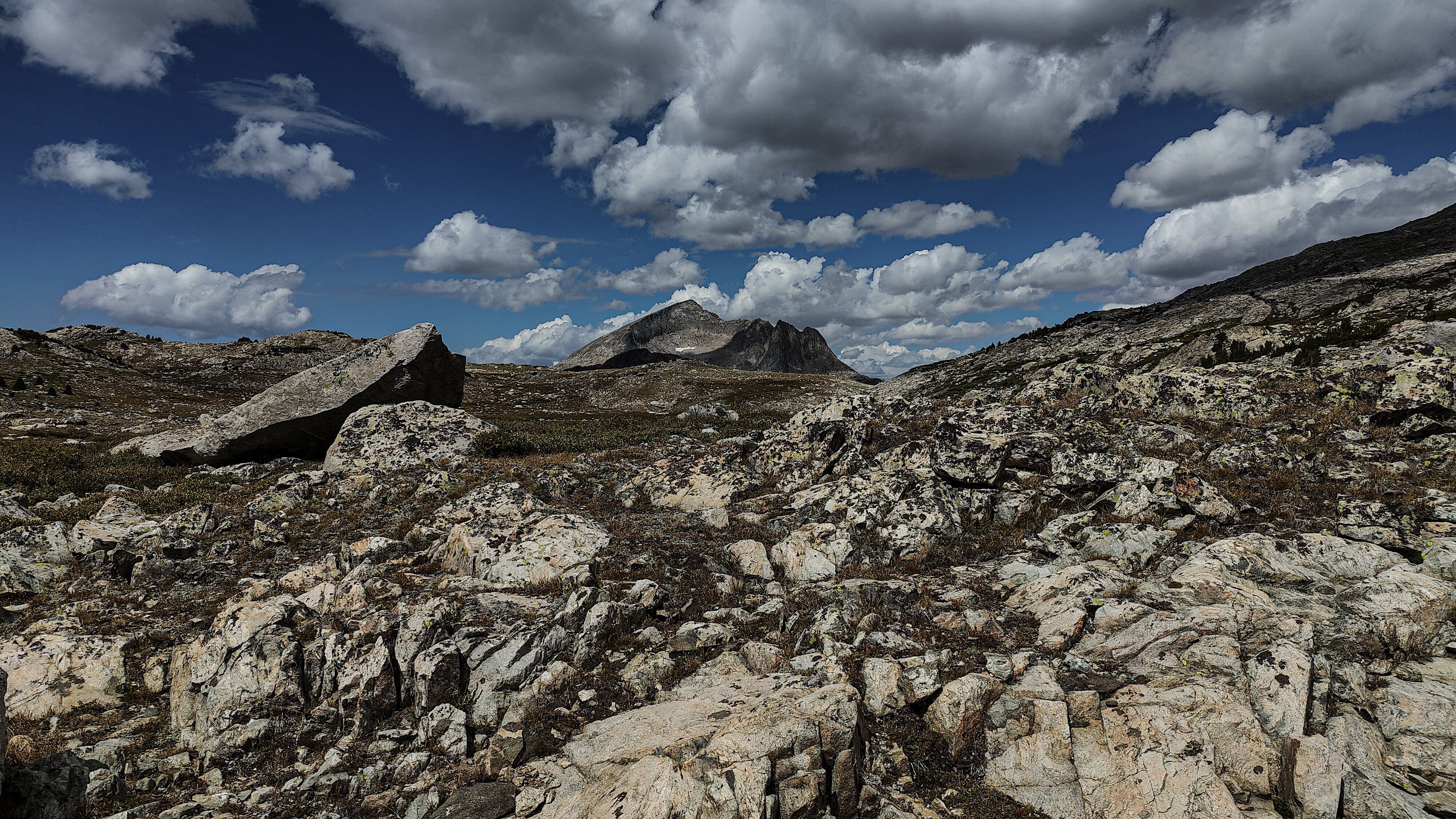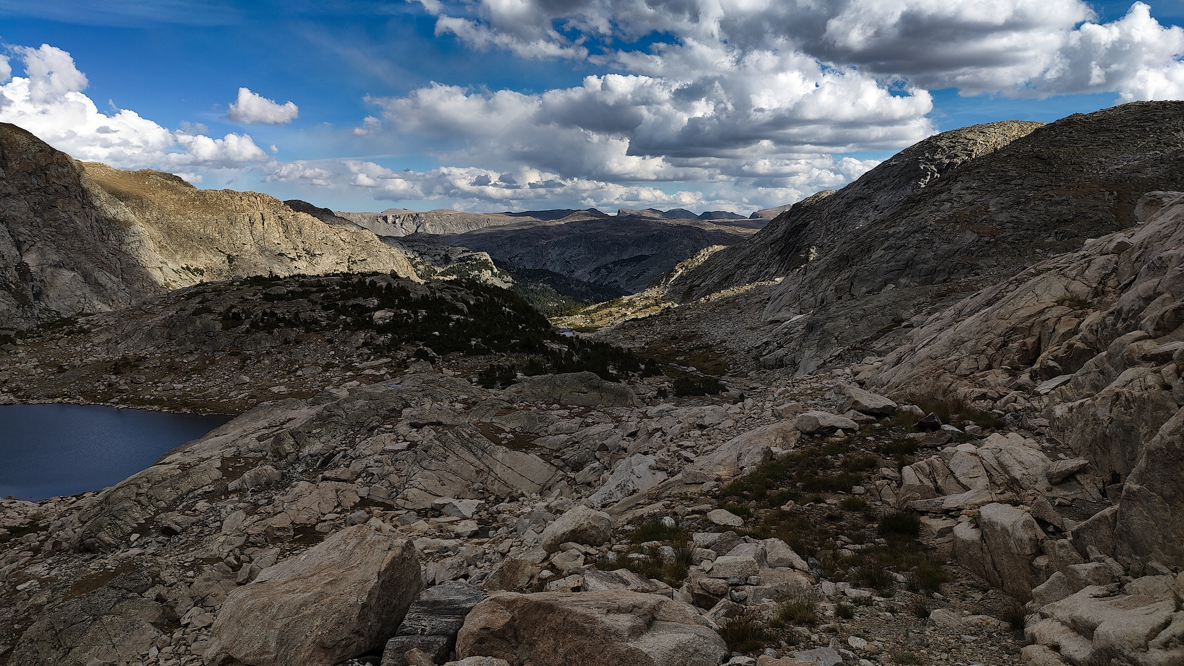 I discovered that I had shared Pyramid Lake with one other quiet party camped across the water, and we acknowledged each other with a wave as I left. The marked trail ended at the lake but an obvious use path heading west to the East Fork River divide and north along a broad bench above Desolation Valley appeared in its place. At this divide, the view is stunning. The Wilson-Dixon route is visible as a slight disturbance across the grassy meadow to the north. While there are lakes on the floor of this treeless valley cradling the headwaters of the East Fork River, it is the impressive 3 km long wall of 3700 + meter peaks marching from Mt. Geikie, Peak 12,183 , and Peak 12,187 with its curious giant black "M" intrusion, to Raid and Bonneville peaks that not only define the drainage, but stand as the westernmost bastion of summits rising above the skirt of granite that encircles and isolates the range from the Wyoming sagebrush plains. As you walk up the vally, alpine tundra replaces scrub pine but that soon gives way to headwalls, glacier-polished bedrock and finally the slopes of extra-large talus through which lies the path to the aptly-named "Pain In The Ass Pass" separating Raid and Bonneville Peaks. At near 3600 meters, this pass overlooks a broad swath of the southwestern Winds, the distant high plains and the mouth of Bonneville Basin directly below. I took advantage of three bars on the phone and reported in before descending into the Basin. The descent wandered through gentle headwalls and scree to the basin. There I caught the well-defined path that led past the lakes and up to my camp for the night at a lilliputian pond in the meadows below Sentry Pass.
