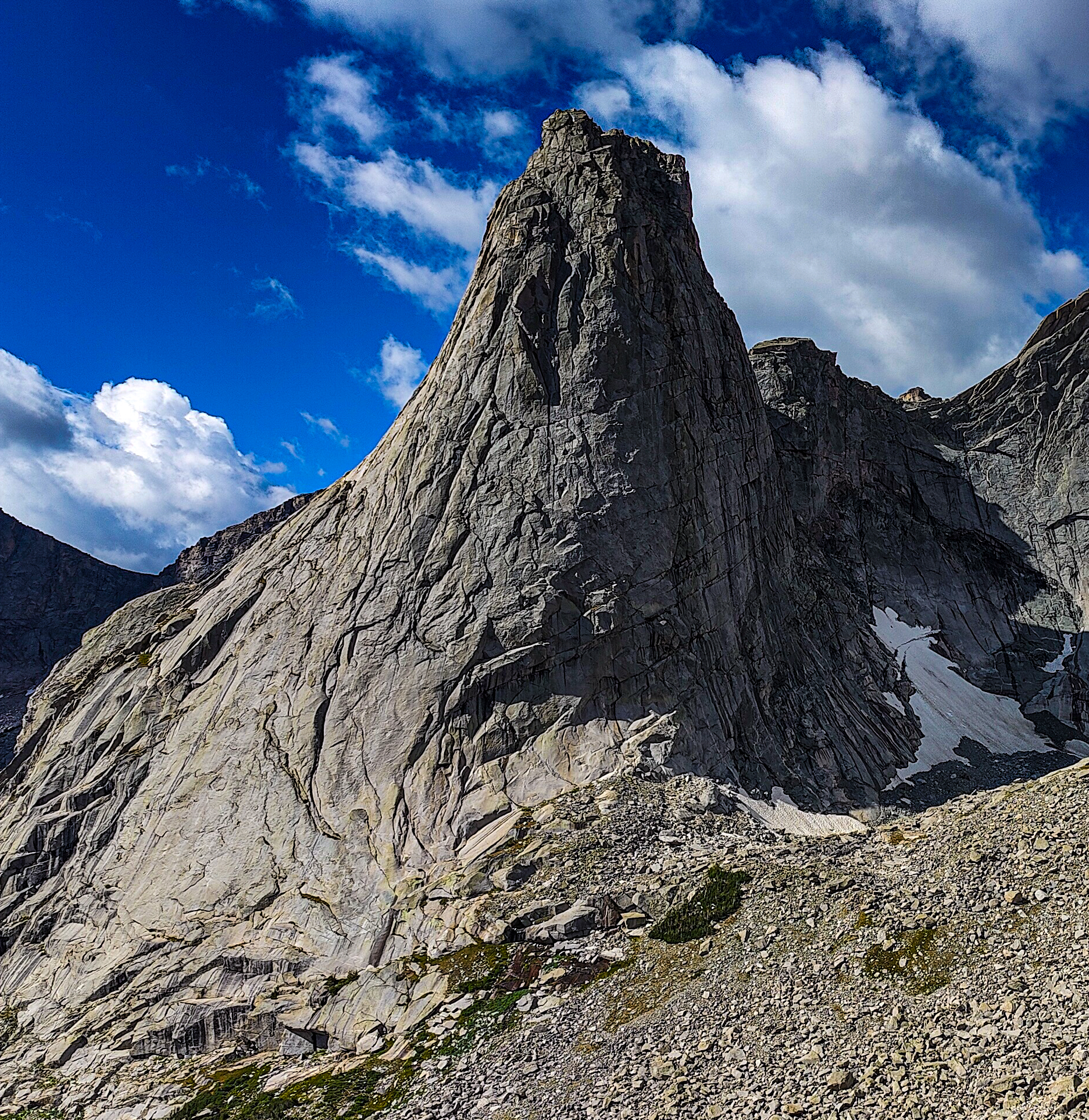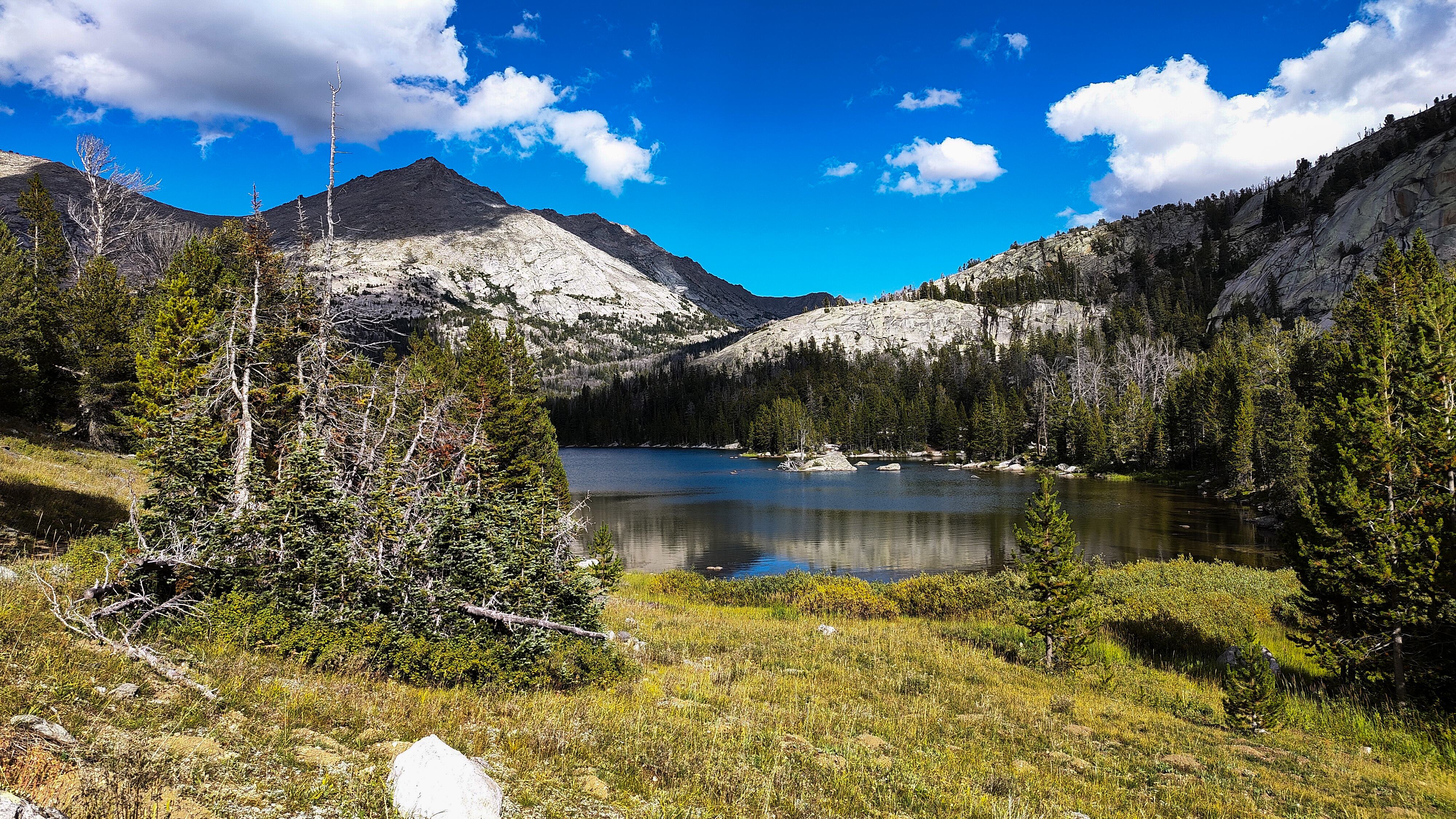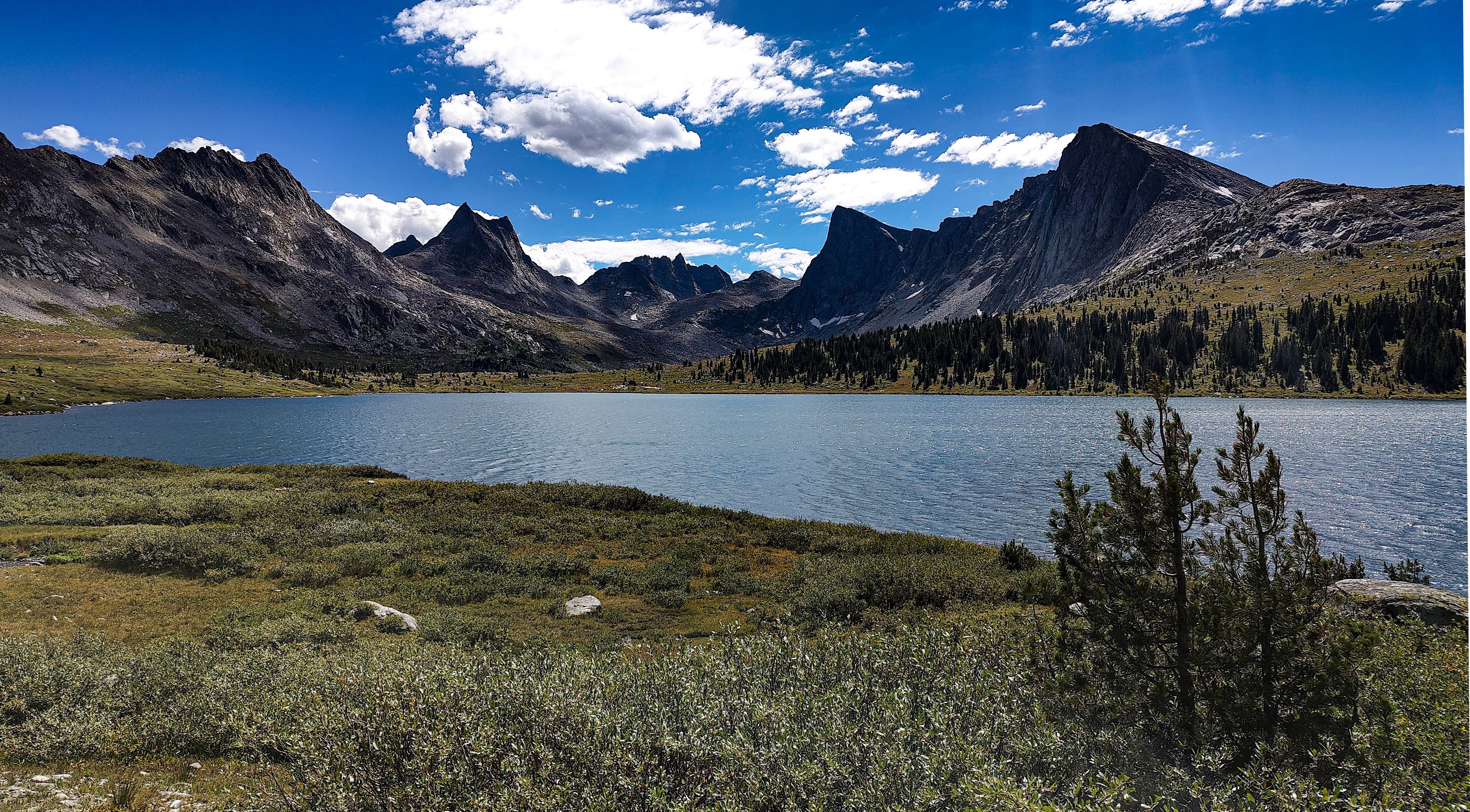 Except for a few climbing parties, all seemingly headed for Pingora, everyone had apparently slept in after last night's excitement for I saw no one until well up the Texas Pass trail where I met an older couple who said they had bivvied just below the pass. They were cautiously making their way down to the lake to regroup following last night's storm. The fellow warned me of the dangers of the terrain above, which I thought odd, then began admonishing me for traveling solo, ticking off each possible "don't you know that this could happen" catastrophe on the list while, who I assumed was his wife, nodded or shook her head with each of his bullets. Yearning to respond to this dressing down with something clever but sensing that doing so would only precipitate an even more comprehensive lecture, I instead thanked them for their concern and continued on, thinking that if I were looking to commit an irresponsible act, Texas Pass at 3500 meters in a thunderstorm would certainly make the short list. During the twenty minutes or so to the pass, I wondered how many others had unintentionally danced with the devil during last night's storm. While a ranger in Grand Teton National Park, it was almost a certainty that we would be fetching someone from the mountains following a storm like last night's. At the pass I was a greeted with a stiff, cool breeze from the north. Sweaty, and with no convenient place to linger out of the wind, I made my way down to Texas Lake, passing several parties laboring up the steep, loose ground, headed to the Cirque. I met two more people crossing Washakie Creek on an otherwise empty trail to Pyramid Lake. By afternoon both the wind and clouds had disappeared. It was still early when I arrived at the lake which looked to be deserted as well. The day had been a relatively easy one and I considered scrambling up Mt. Hooker to look down its immense north face, but by the time I had set up camp, a second look at the 500m of slabs and talus made a swim and a nap in the afternoon sun seem much more appealing. There were fish here, and it only took a couple of minutes to catch two 8-inchers and stretch tonight's noodles.