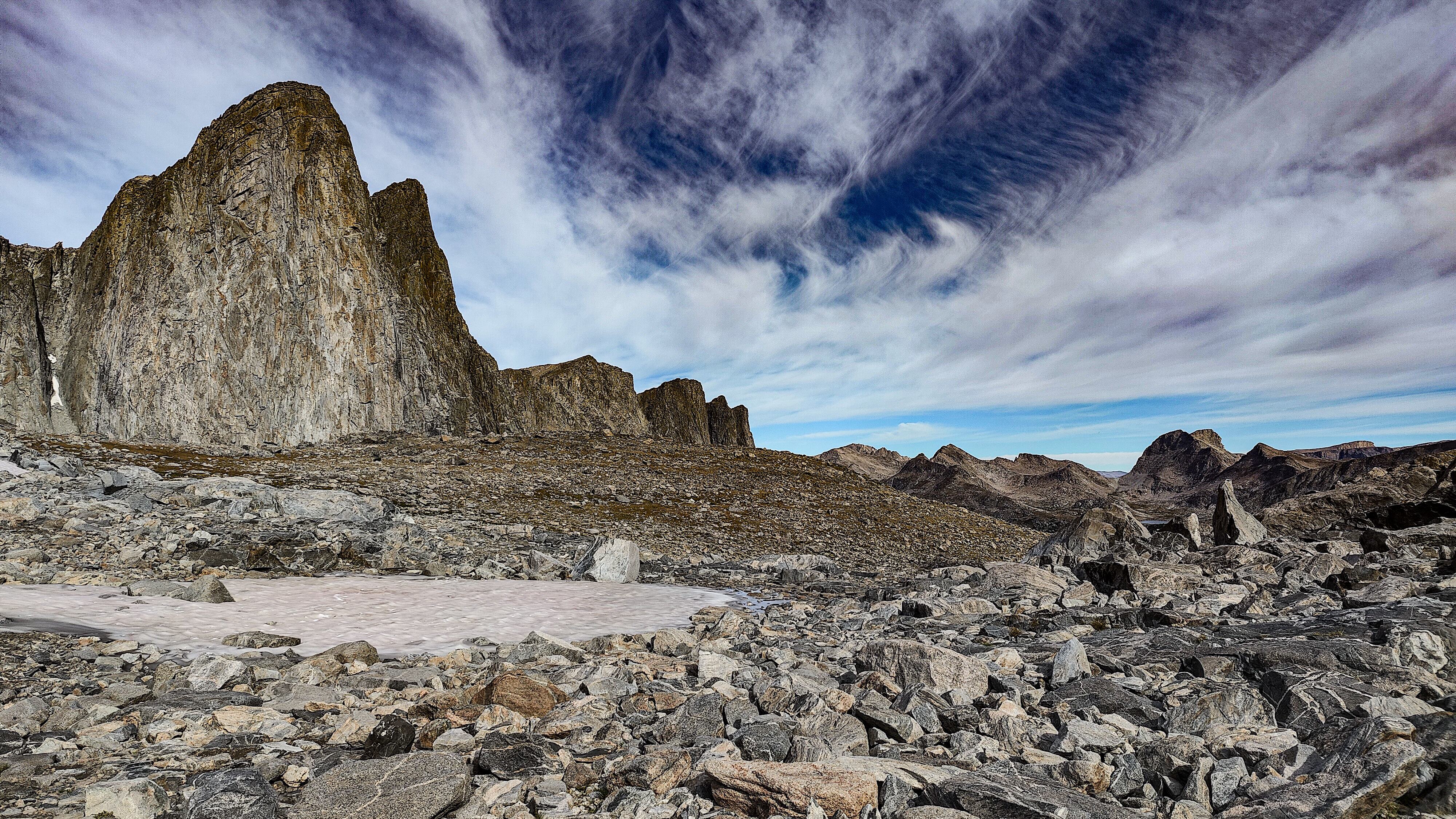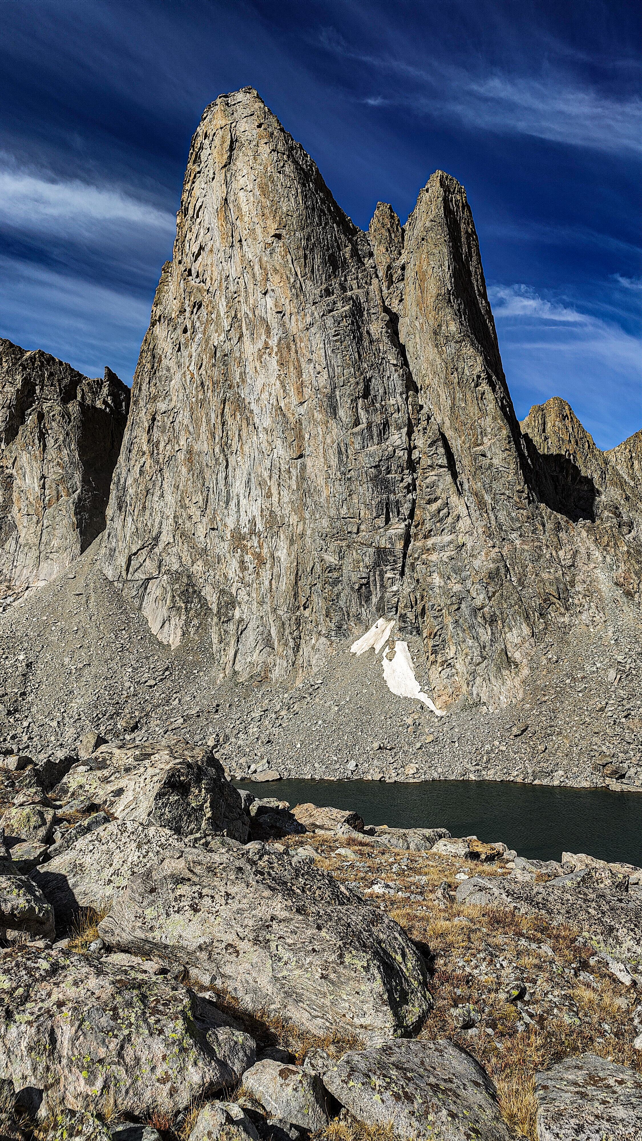 The first question that people ask about this walk is how it compares to other "thru-hikes" that I have done. There is no comparison. There are no huts, or refuges with warm beds, hot food and cold beer. There are no towns or cable-cars or trail angels. There were, in this case, no people over a week's time - an increasingly rare circumstance. There is now a faint trail (in some places requiring imagination) however, to be found along the standard segments of the route that link both the mapped trails with a large number of use trails established since the last USGS survey. After ten years of its introduction to the internet, I suppose that is to be expected. I picked up a candy bar wrapper on a strech of marked trail and saw evidence of one campsite a mile south of Island Lake. Given the popularity (or at least publicity) the route has gained, I expected to see someone between the Cirque of the Towers and Island Lake but I was pleasantly disappointed. So the answer really depends upon what you're looking for. My pack weighed 9.8 kilos dry of which 3.6 kilos was food. I also carried an InReach, a cell phone (there is coverage here and there) and a 10 watt flat solar panel with a 3200 mAH battery. Those items brought the total up to 11.1 kilos. There was no shortage of water. The temperatures during this mid-September period ranged from 78° to 21°. There were four thundershowers and two overnight storms that left ice on (and in) my single walled tent. The last left a muddy trail and two inches of snow in the shady areas near Cube Rock Pass on the last day, the 15th of September. See the track information for distances and elevation. Happy trails.