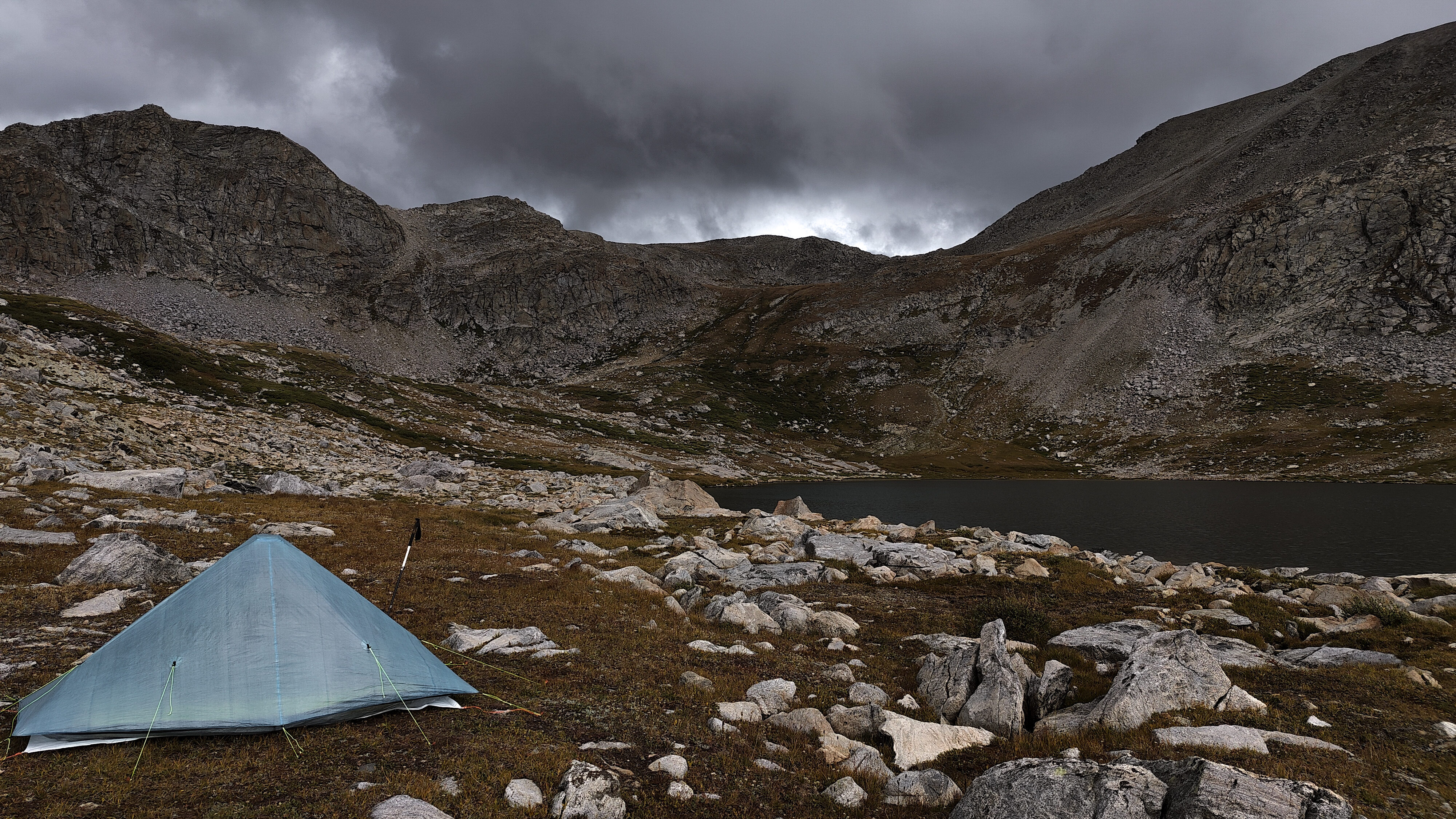 My original plan had been to combine sections of the Wilson-Dixon and Skurka high routes, as well as substituting the Alpine Lakes stage with what seemed an obvious line between Upper Golden Lake and Island Lake but for which I could find no information. The now-abandoned stage through the Milky Lakes basin and back up to Europe Pass was to be followed by a walk from there over Europe Peak then along the Continental Divide to Hay Pass. The new plan would now take me from Hall's Lake into upper Europe Canyon. I had the choice of reaching Europe Canyon via the natural contour through the low pass east of Medina Mountain or climbing out of the Hall's Lake basin due north and descending into upper Europe Canyon via a high pass on the ridge separating the two dainages. In spite of previous visits to the upper reaches of Europe Canyon, I could not recall if the pass I was studying high on the ridgeline would actually "go". After some time mulling the decision, I concluded that the distastful thought of retreating from the pass in the event of questionable terrain would only encourage risk-taking simply to save some time, and of that I had no shortage. As it turned out, the lower traverse into Europe Canyon and the walk up to its head was a pleasant stroll. As a significant passage across the great divide, I had expected to see someone in Europe Canyon but the place was empty. Once I reached the upper reaches of the canyon, a close examination of the descent from the pass I had considered earlier looked intricate but doable. I congratulated myself for my wisdom/cowardice/restraint, hastily set up camp on the shore of the upper lake and jumped in the tent just before the afternoon thunderstorms arrived. I had never used the tent, a 2 year-old Zpacks Plexamid in the full-on conditions it appeared were about to develop and I was a little skeptical with a tent weighing in at only 400 grams holding up in real life circumstances. As the storm rolled in, so did my eyes as I watched the translucent dyneema fabric strain under what I estimated to be 50 knot gusts. I briefly thought about space-age technology, Saran-Wrap, and 2.5 mm guylines, and whether my tiny titanium stakes would stay in the soft ground. The door closure design concerned me the most though because it was a simple set of toggles that held the two panels together with a two inch overlap. I was certain wind from the right direction would force water through the overlap, but whoever came up with such a minimalistic and improbable design had apparently tested it, for as the wind swung from one direction to another, the overlap stayed stubbornly snug. I sent a nice note to the company after the trip relating my experience. They returned an even nicer note, with congratulations (...for either my wise purchase or my survival, I could not tell), and assurances that the tent had been tested in much more "robust" conditions. How much was "much more robust...?" They didn't say but I guess you get what you pay for. Whatever knowledge Floridians might be suspect, concerning tents, they more than make up for with their knowledge of sails.